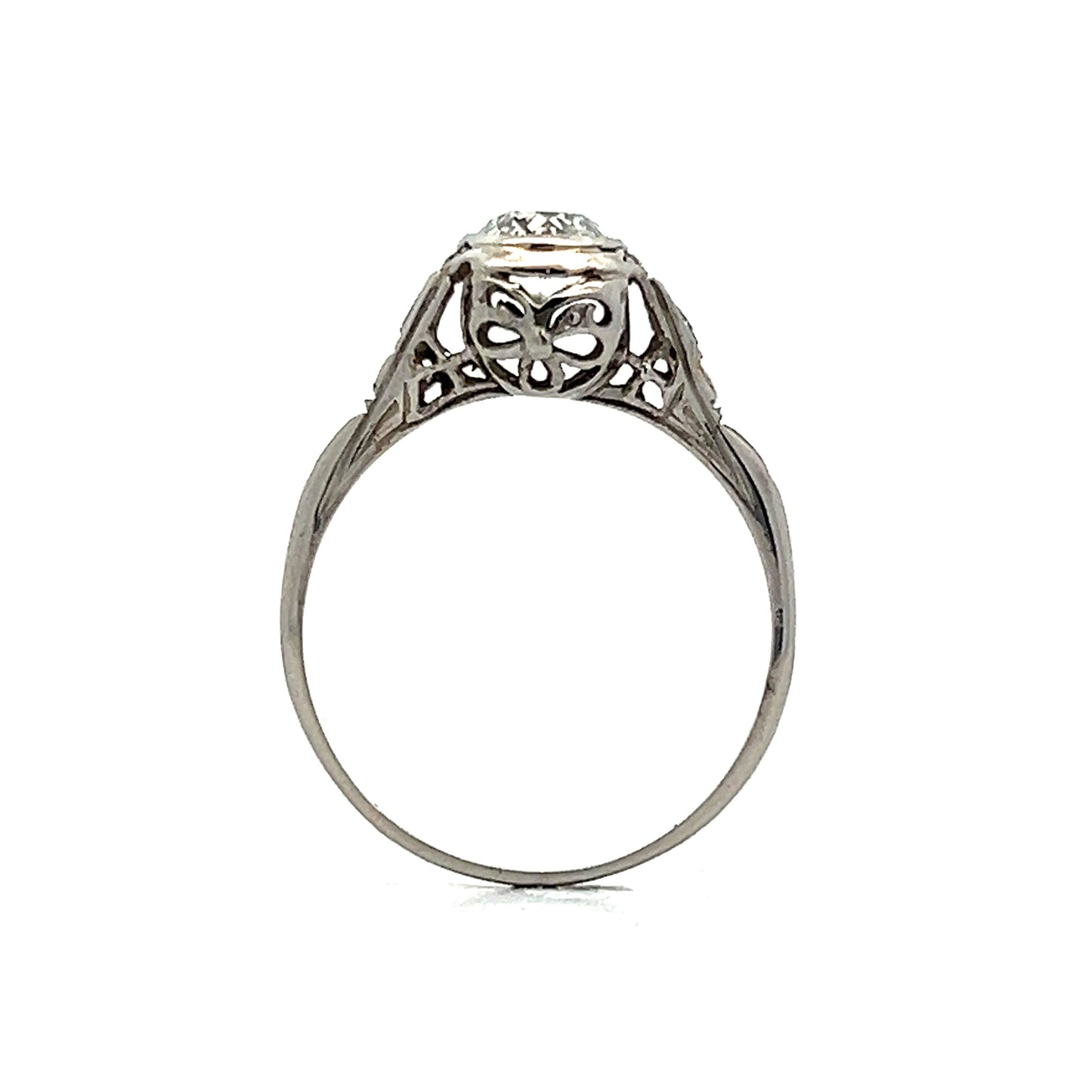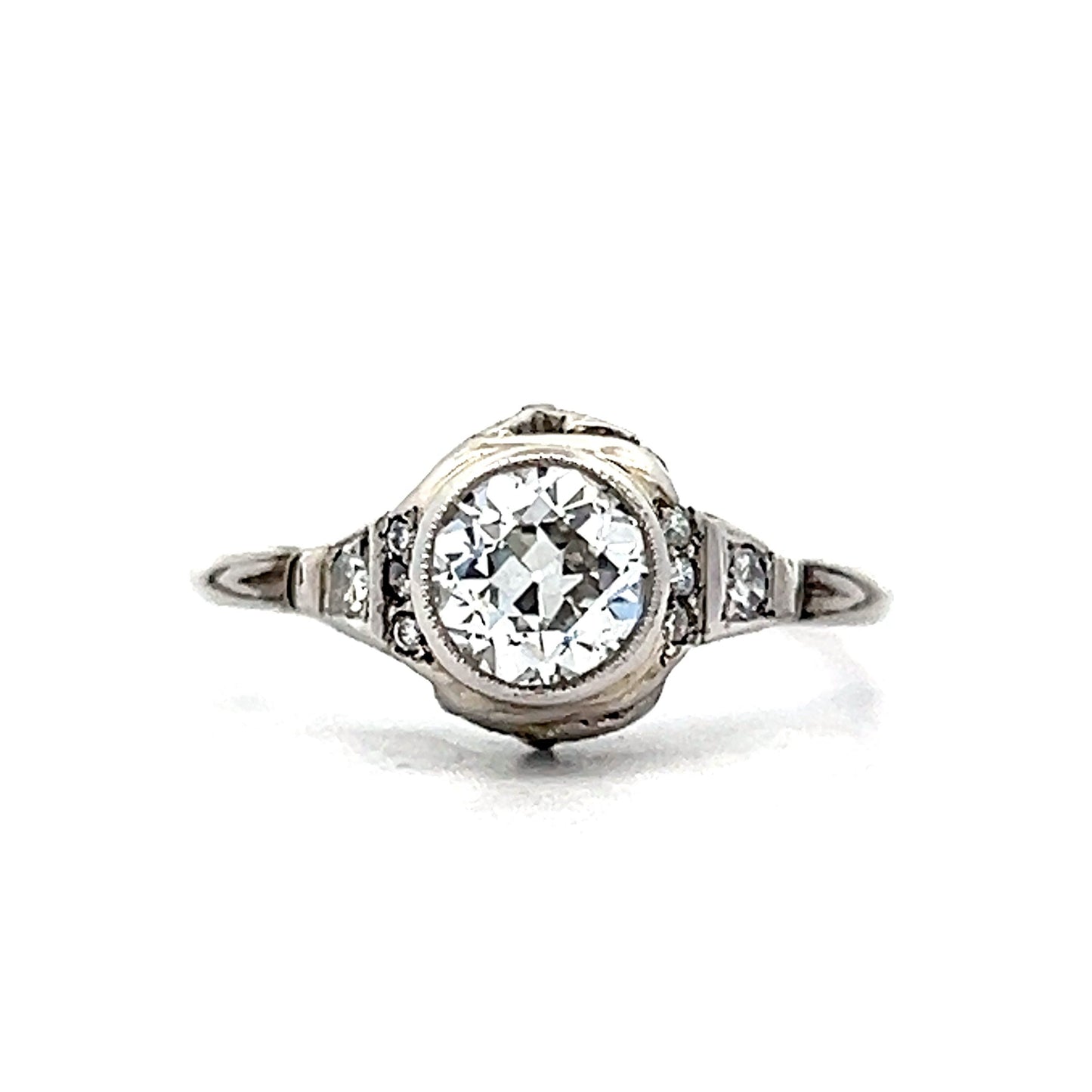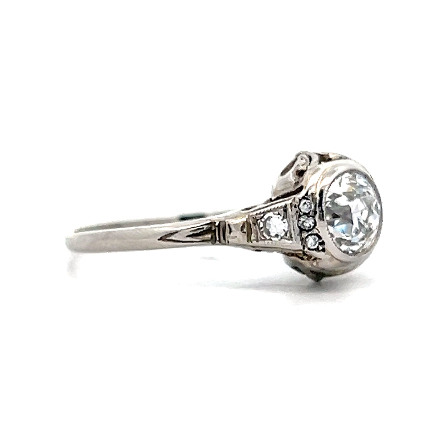 Crafted in platinum, this antique ring features a bezel set old European cut diamond as the center stone, weighing .82 carats. The diamond has a clarity of VS1 and a dazzling G color, radiating brilliance and sparkle from every angle. The thin band adds a delicate touch to the overall design, while the decorative gallery adds a touch of vintage charm. Adding to the splendor of this ring are two accent stones, each measuring 1.8mm and weighing .025 carats. These natural diamonds are of G/H color and SI1 clarity, perfectly complementing the center stone.