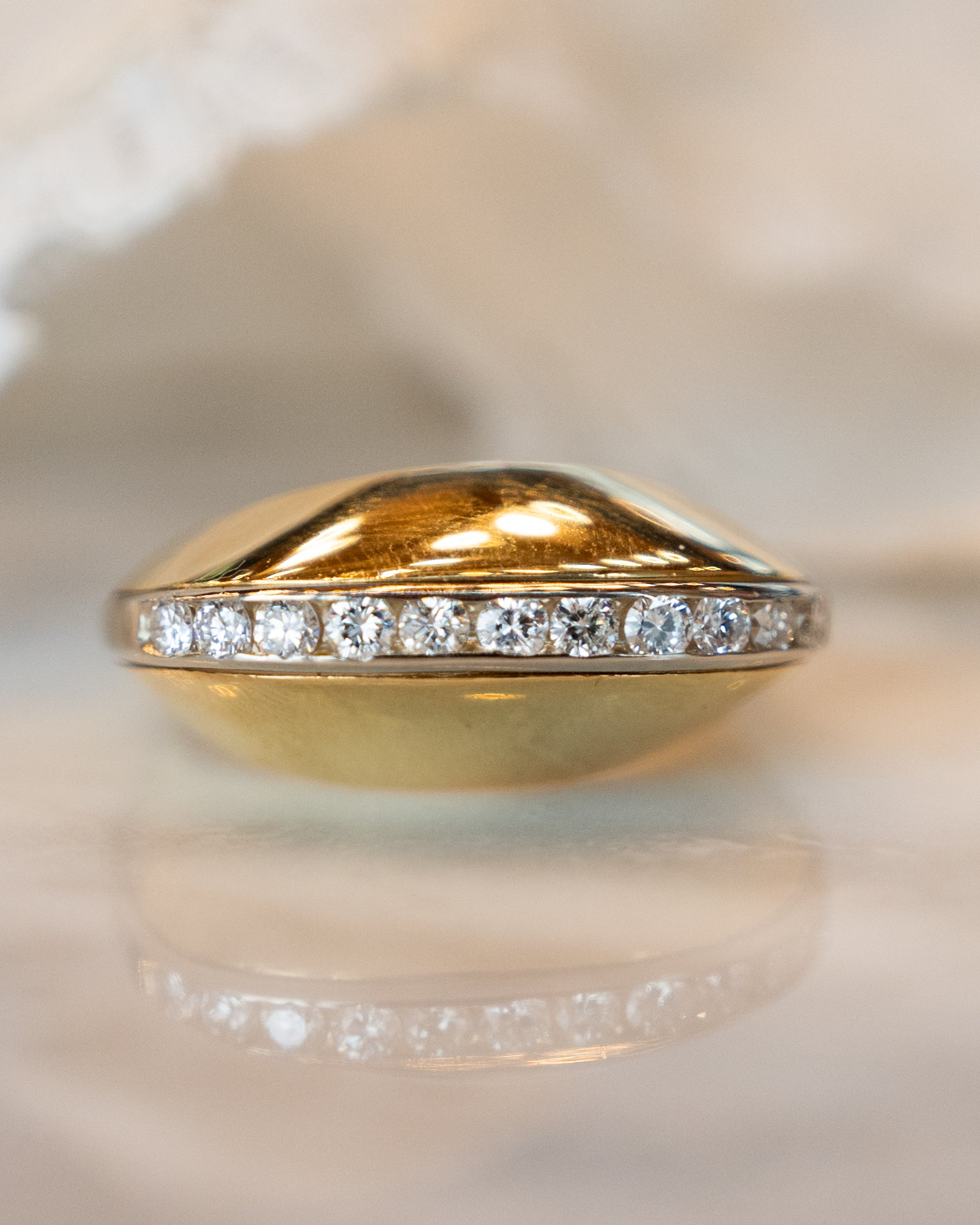 This 18 karat yellow gold cocktail ring features a round brilliant cut diamonds with a total weight of .82 carats with VS2 clarity and H color grade. The dome-shaped design stands 7mm tall and includes channel-set diamonds set in white gold. The combination of the ring shape, diamonds and two-tone metal creates a bold and dramatic piece.
