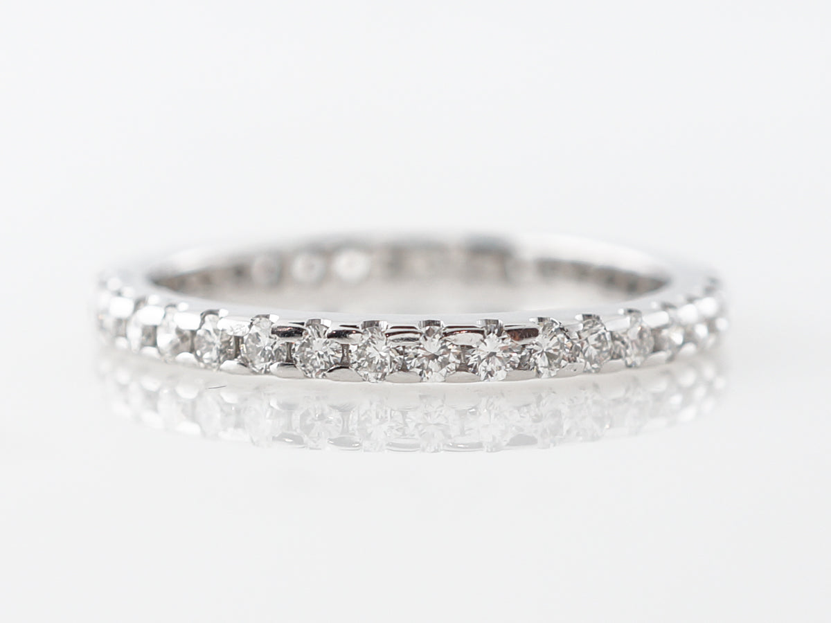 .84 Carat Diamond Eternity Wedding Band in White Gold. This modern diamond eternity wedding band is bright and beautiful! The diamonds total .84 carats and are set in 14 karat white gold. This would pair beautifully with almost any engagement ring.