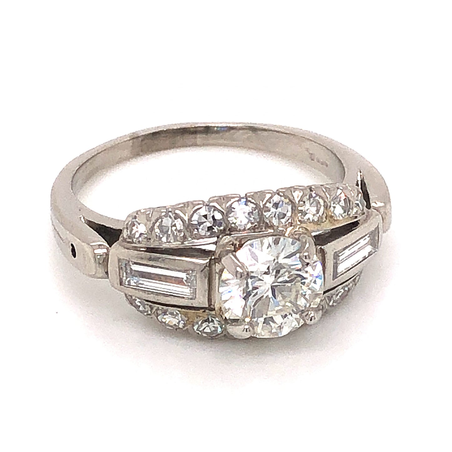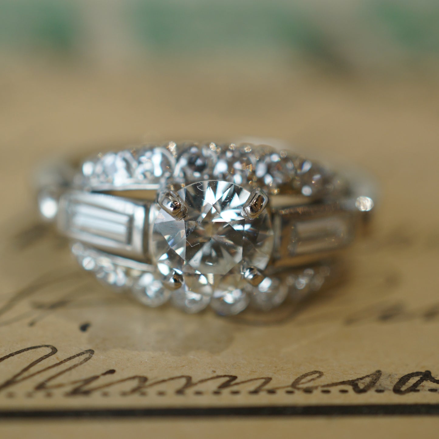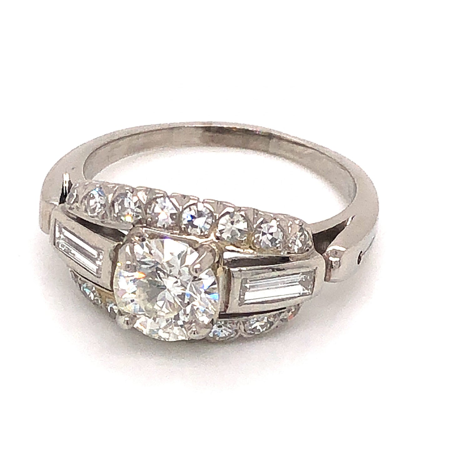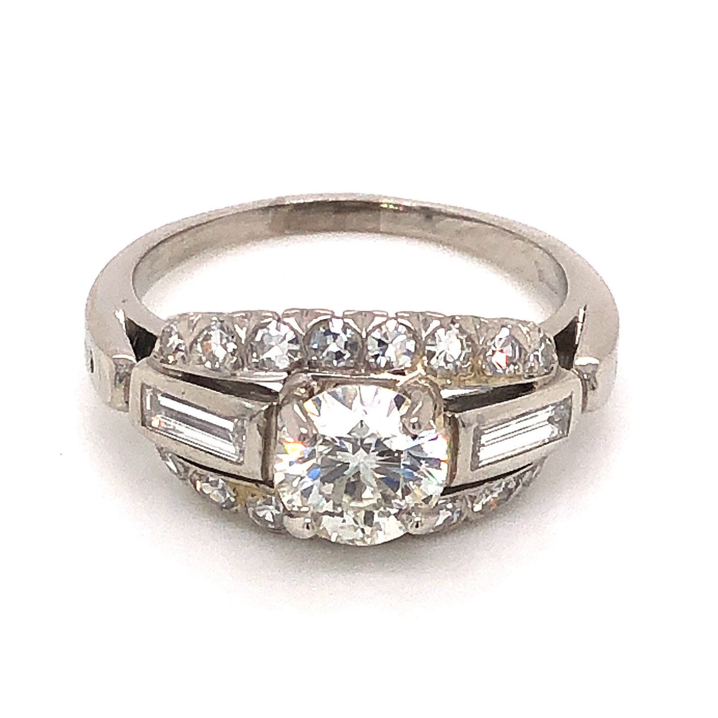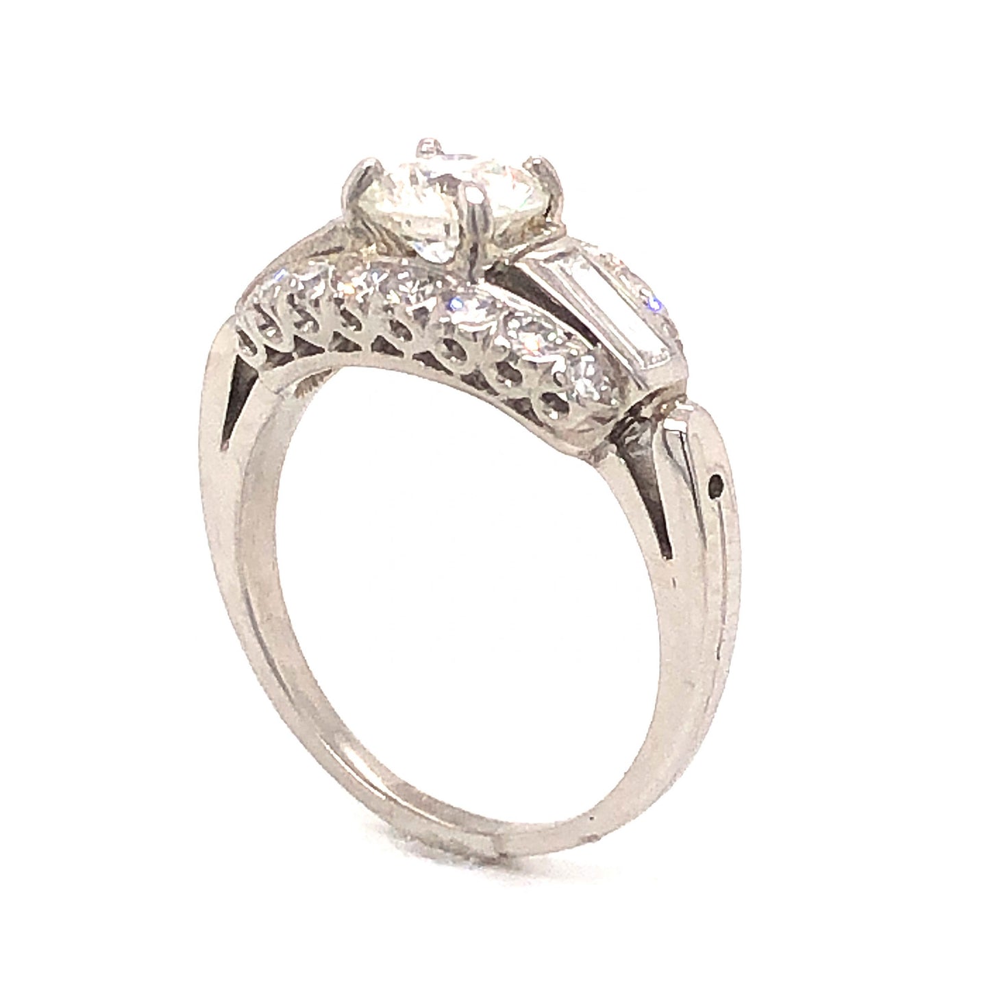 This unique Mid-Century engagement ring features 1.62 carats of diamonds finished in shimmering platinum. The center stone is a .84 carat Round Brilliant cut diamond. The primary diamond is near colorless and cut for maximum brilliance. The center stone is flanked by two (2) .27 carat baguette cut diamonds. Set in thick platinum channels, the baguettes bring a dimension and fresh shape to the head of the ring. Sixteen (16) .015 carat single cut accent diamonds accent the top and bottom of the primary stone and are mounted in a vintage basket mounting.