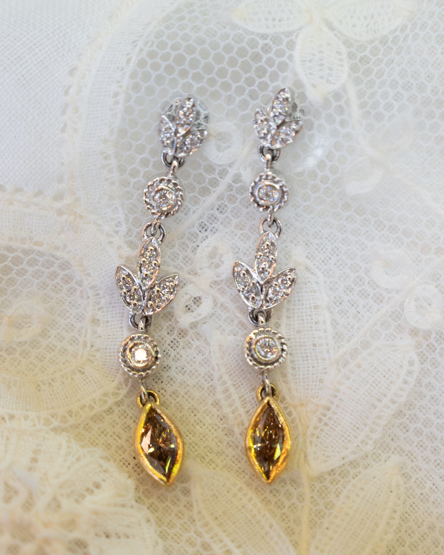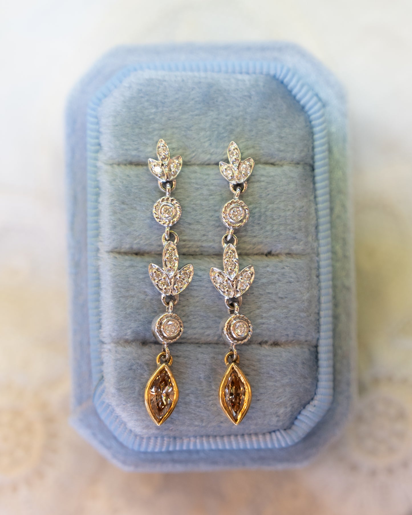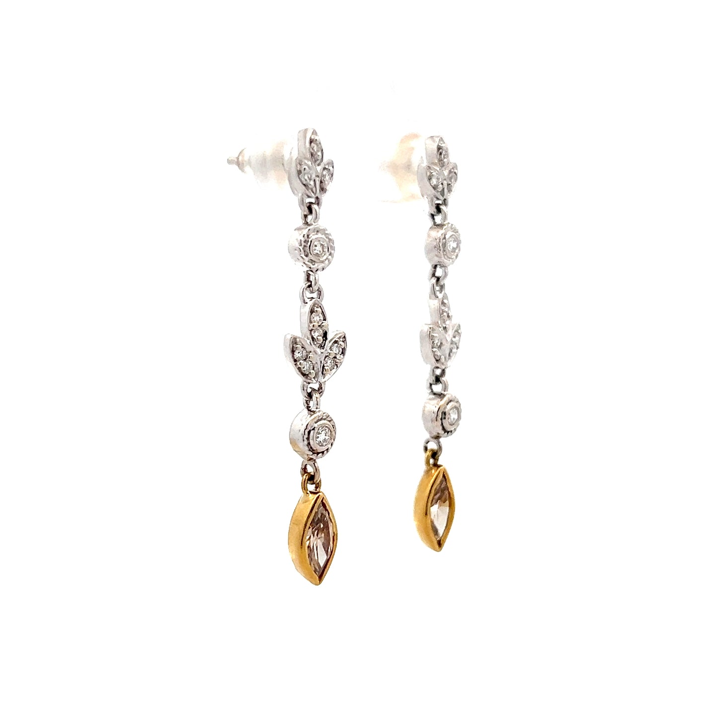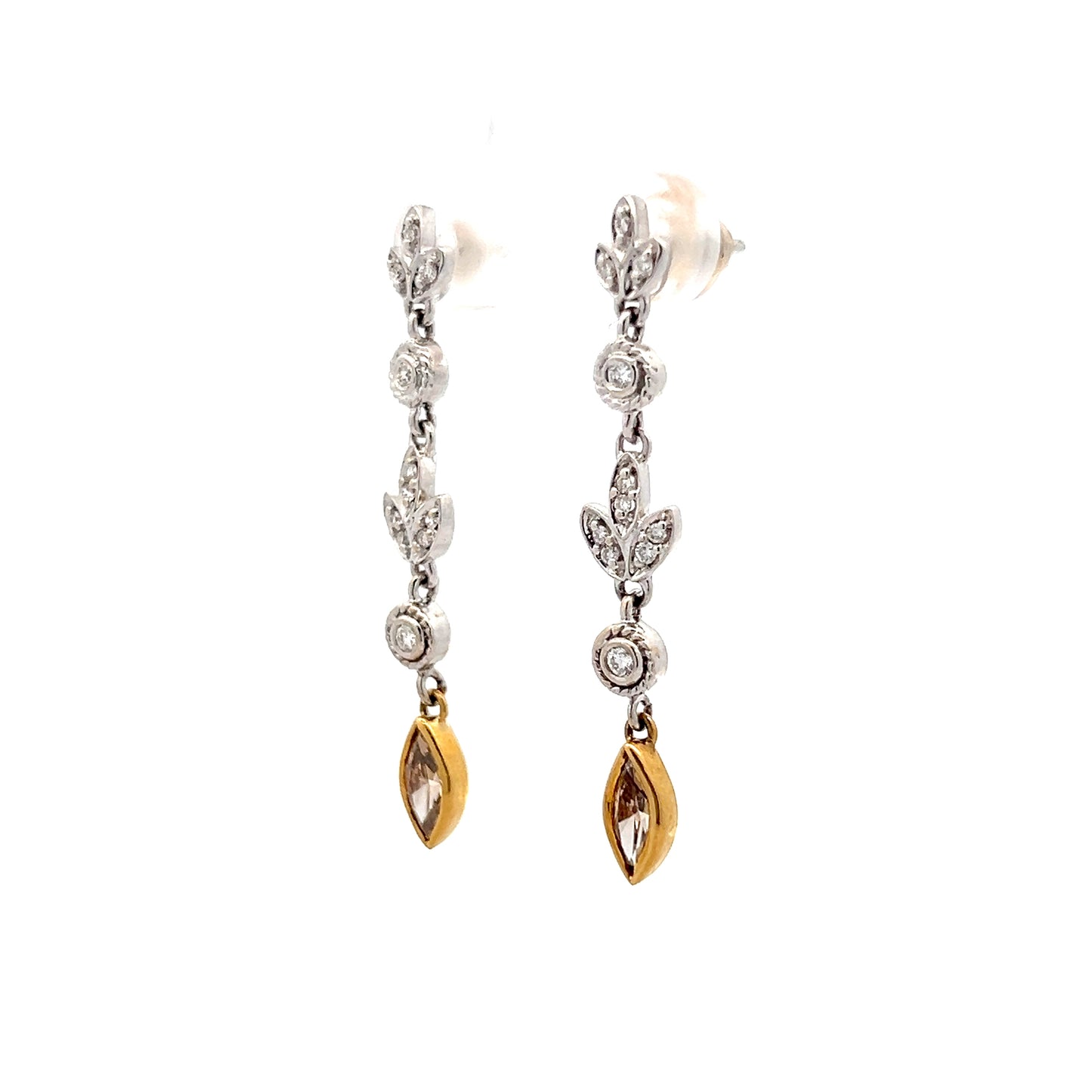 These modern drop earrings combine 18 Karat White and Yellow Gold in a two-tone floral design. The main stones are marquise cut diamonds with a Fancy Brown color, weighing .70 carats with VS2 clarity, set in yellow gold bezels. Four Round Brilliant cut diamonds (1.5 mm each, .015 carats each) accent the design in white gold settings with I/J color and SI1 clarity, bringing the total diamond weight to .85 carats.