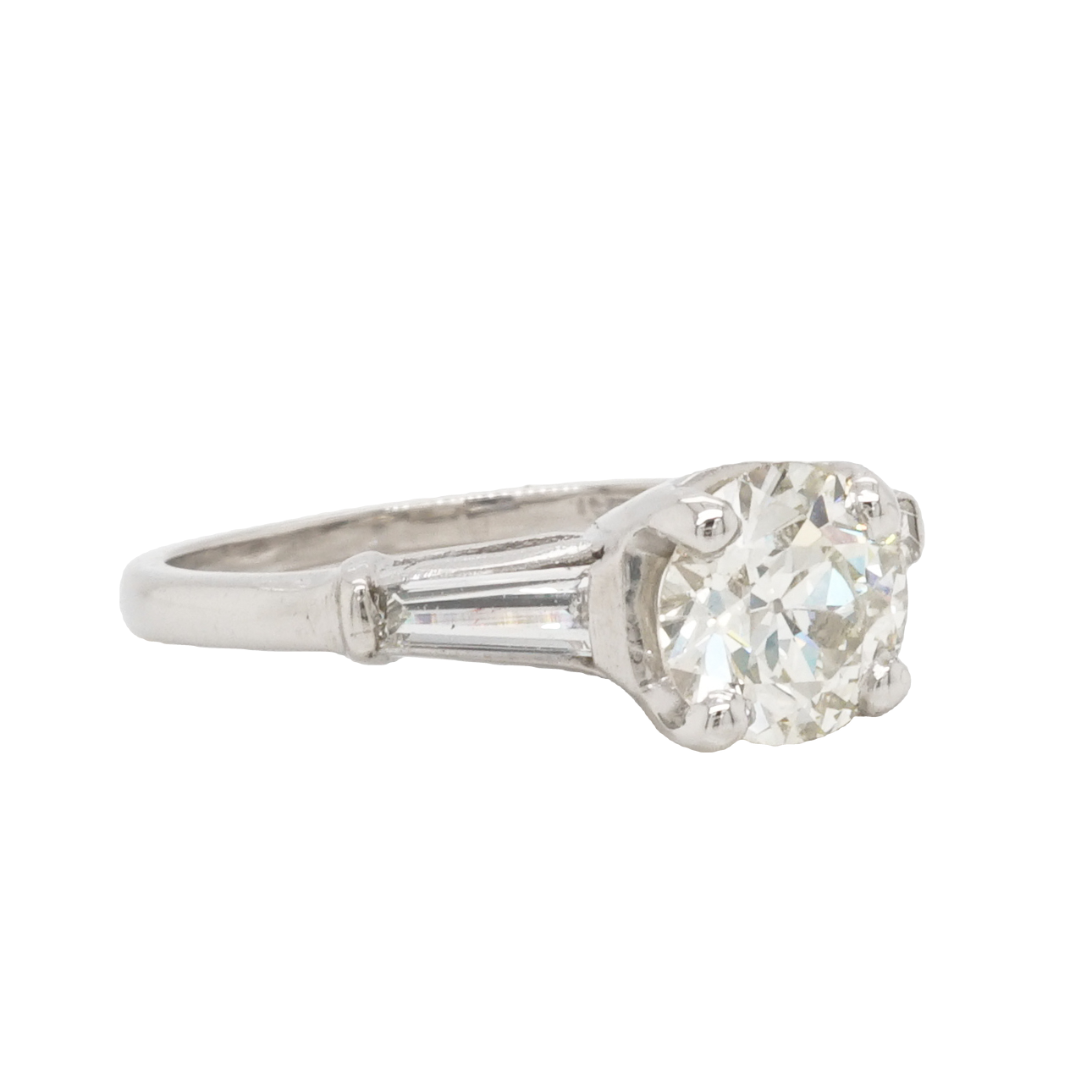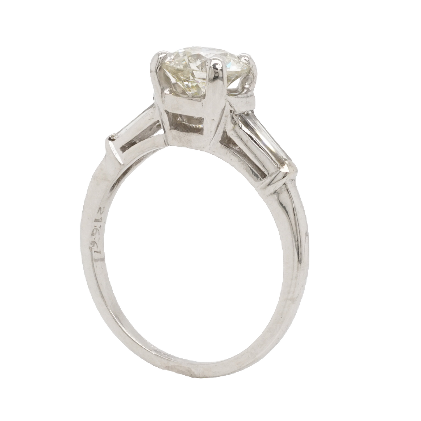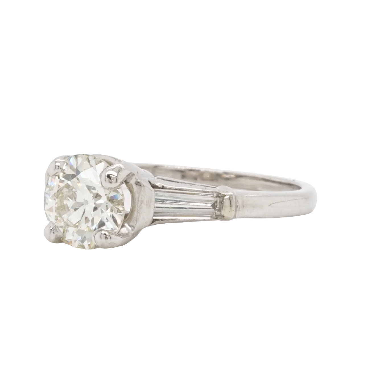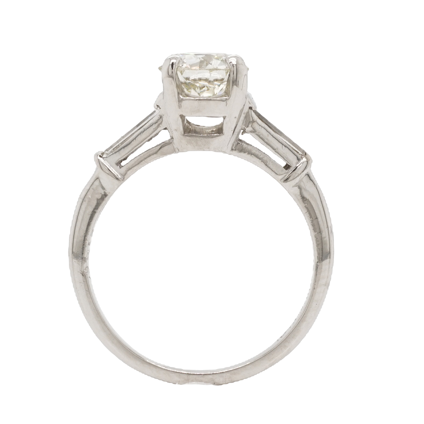 .86 Art Deco Diamond Engagement Ring in Platinum. This vintage Art Deco engagement ring features 1.14 carats of diamonds set in shimmering platinum. The primary diamond weighs .86 carats and is set in four (4) platinum prongs. Radiant and highly brilliant, the center diamond has a soft warm hue and is accented by .09 carat diamonds on the shoulders of the ring. From the profile, the ring has a sleek basket mounting, finished in polished platinum.