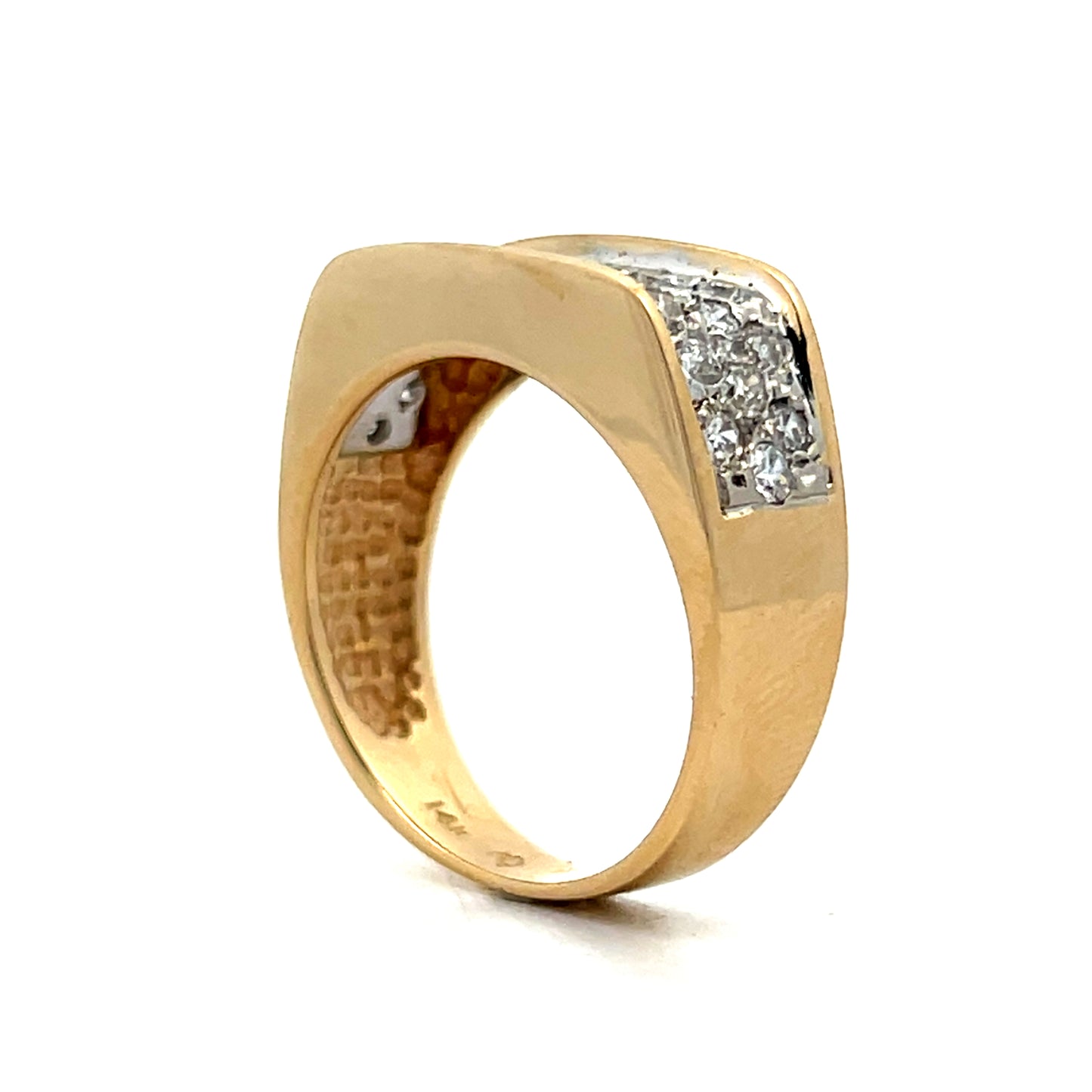 This modern cocktail ring is crafted in 14 karat yellow gold and features a squared top design. It showcases a .86 carats of round brilliant cut diamonds, with a color grade of F-G. The diamonds are set in white gold and bring an elegant contrast of color.
