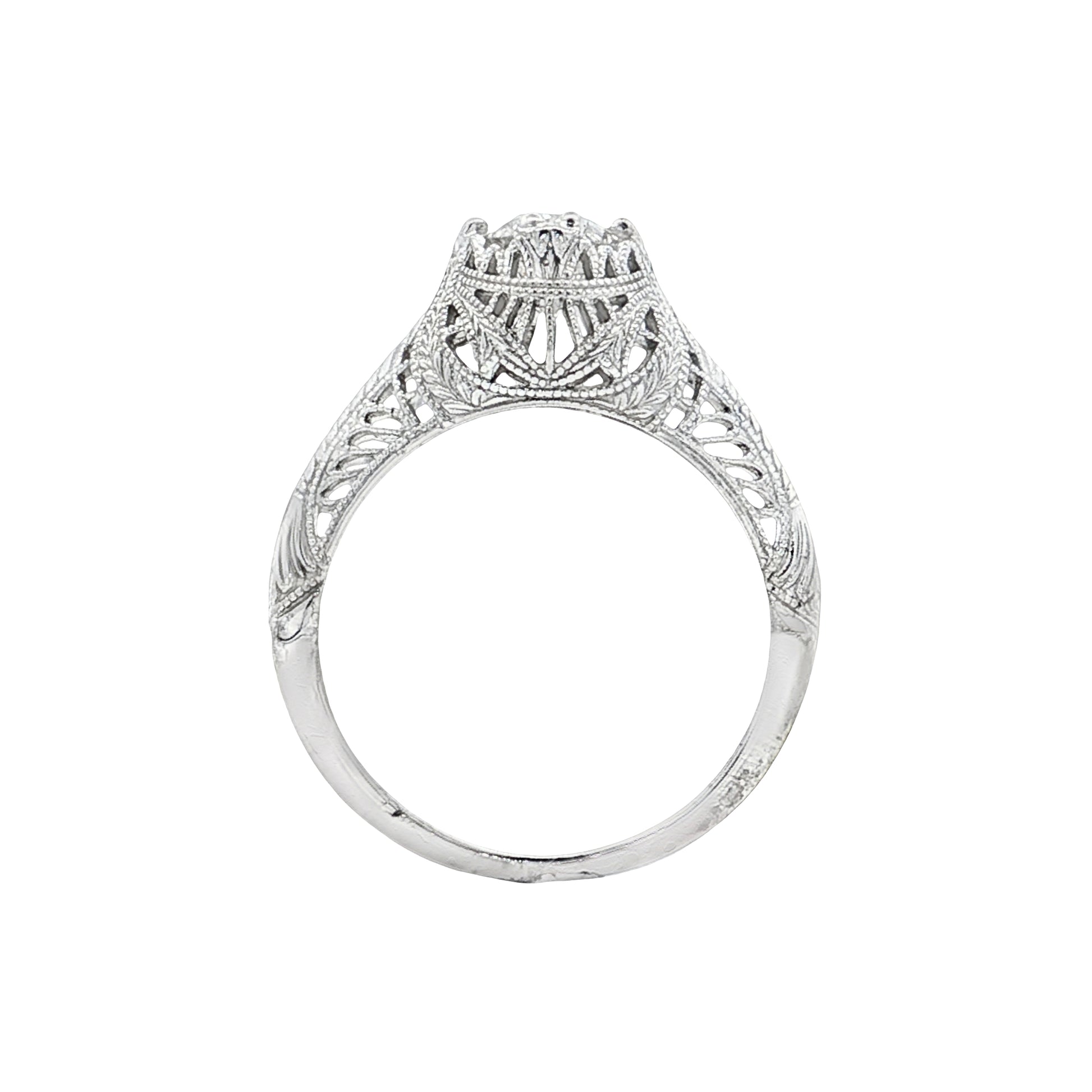 The diamond sits in compass prongs, and the mounting features ornate filigree openwork with milgrain detailing—tiny beaded edges—running throughout the design. The intricate metalwork is characteristic of Art Deco jewelry, with geometric patterns visible from the side and through the gallery. This ring has a low profile that sits comfortably on the finger for daily wear.
