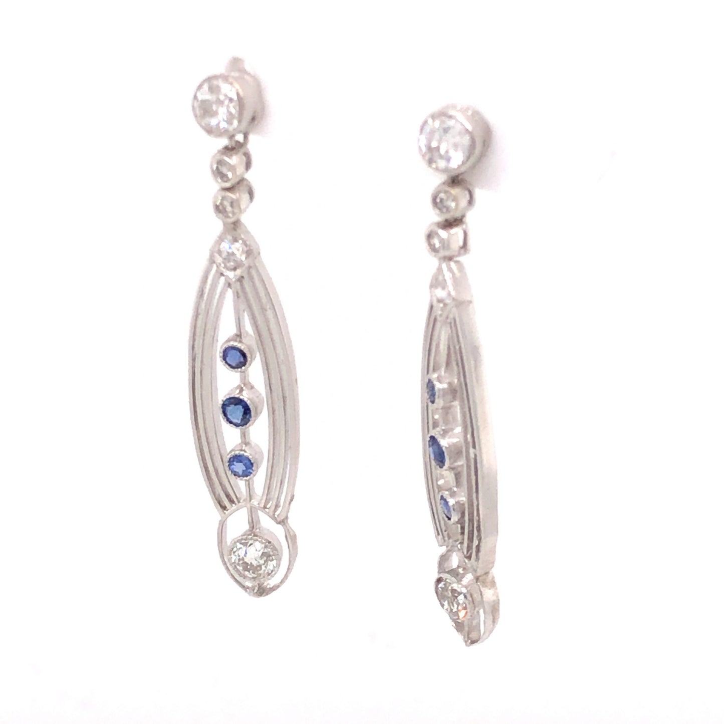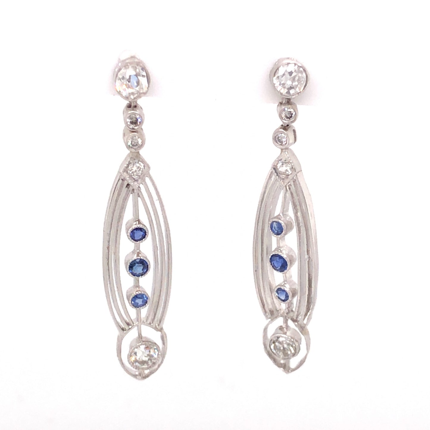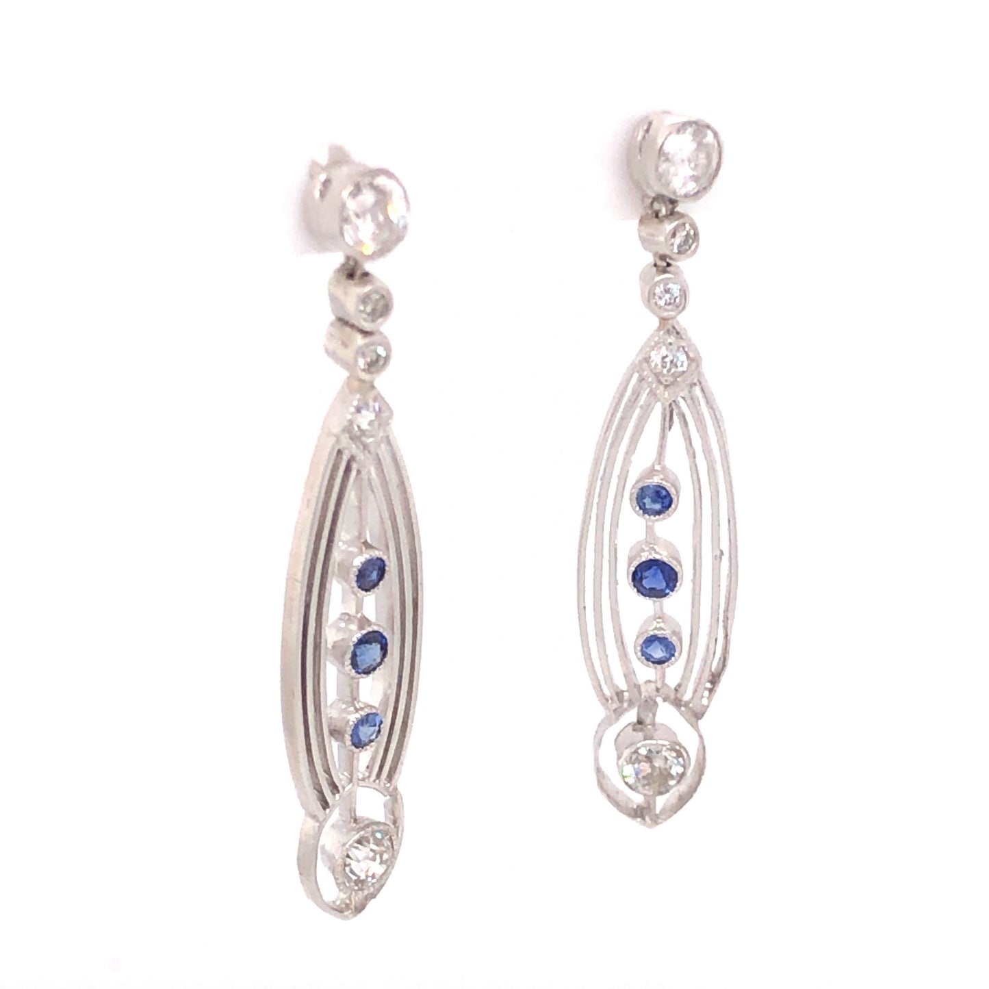 .88 Art Deco Diamond and Sapphire Earrings in Platinum. These Art Deco dangle earrings feature .88 carats of diamonds and .27 carats of blue sapphires finished in a dazzling platinum setting. Four (4) .17 carat diamonds punctuate the dangles at the studs and at the southernmost points. Near colorless and brilliant, the primary diamonds are accented by four (4) .025 carat diamonds that connect to the sculpted platinum drops. Wires of polished platinum form a geometric outline and in the center, three royal blue sapphires are mounted on each earring. In total, these drop earrings feature six (6) royal blue sapphires; two (2) .055 carats and four (4) .040 carats. Each vibrant sapphire is bezel set and hangs within the innovative Art Deco design. Both glamorous and imaginative, these dangles could be the show stopping addition to your jewelry collection!