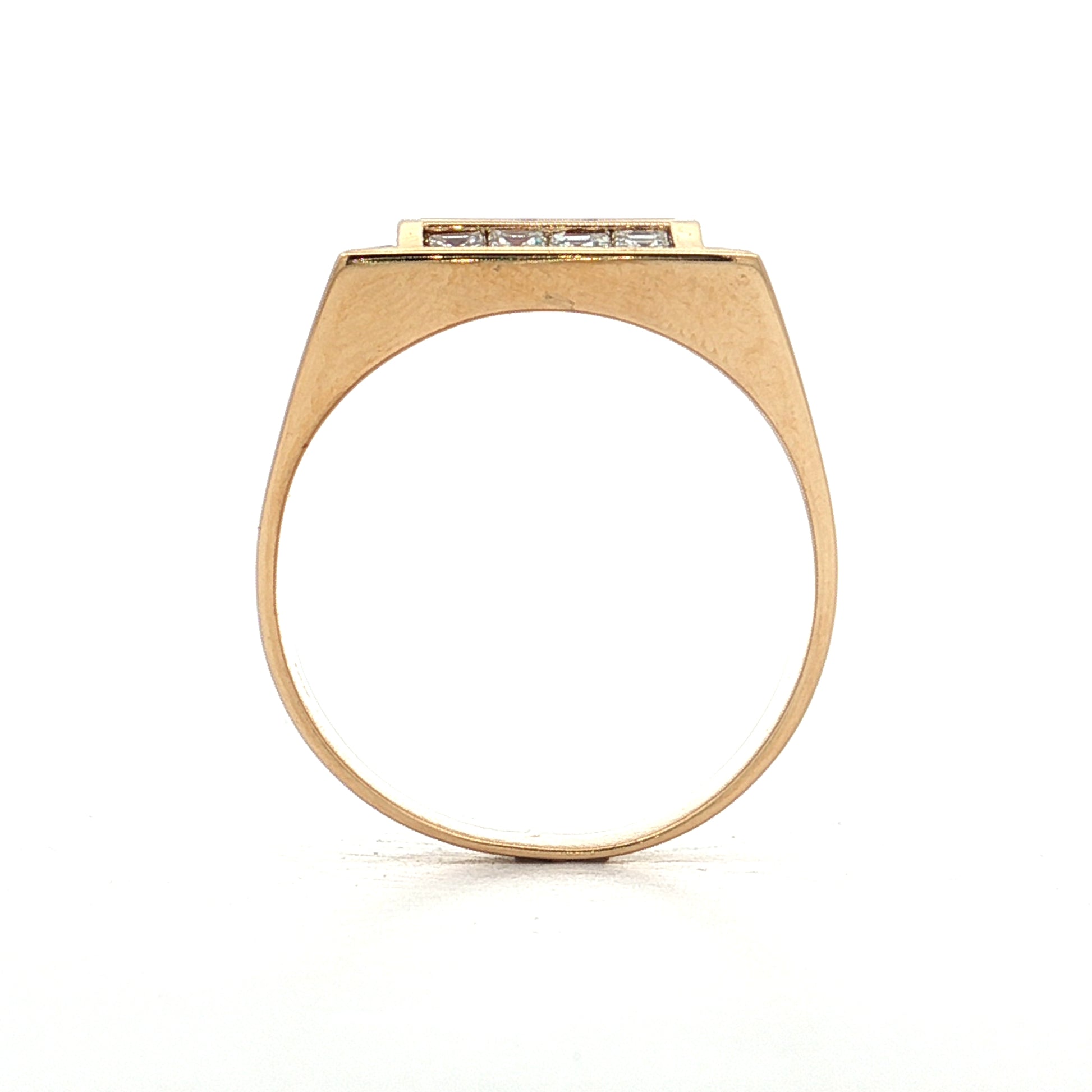 This 14 karat yellow gold men's ring features a .88 carat square step-cut ruby at its center flanked by eight round brilliant cut diamonds totaling .64 carats set in channels. The step-cut ruby—with its rectangular facets arranged in parallel rows—showcases the stone's deep red color and natural clarity rather than creating intense sparkle, making the color the primary visual focus.