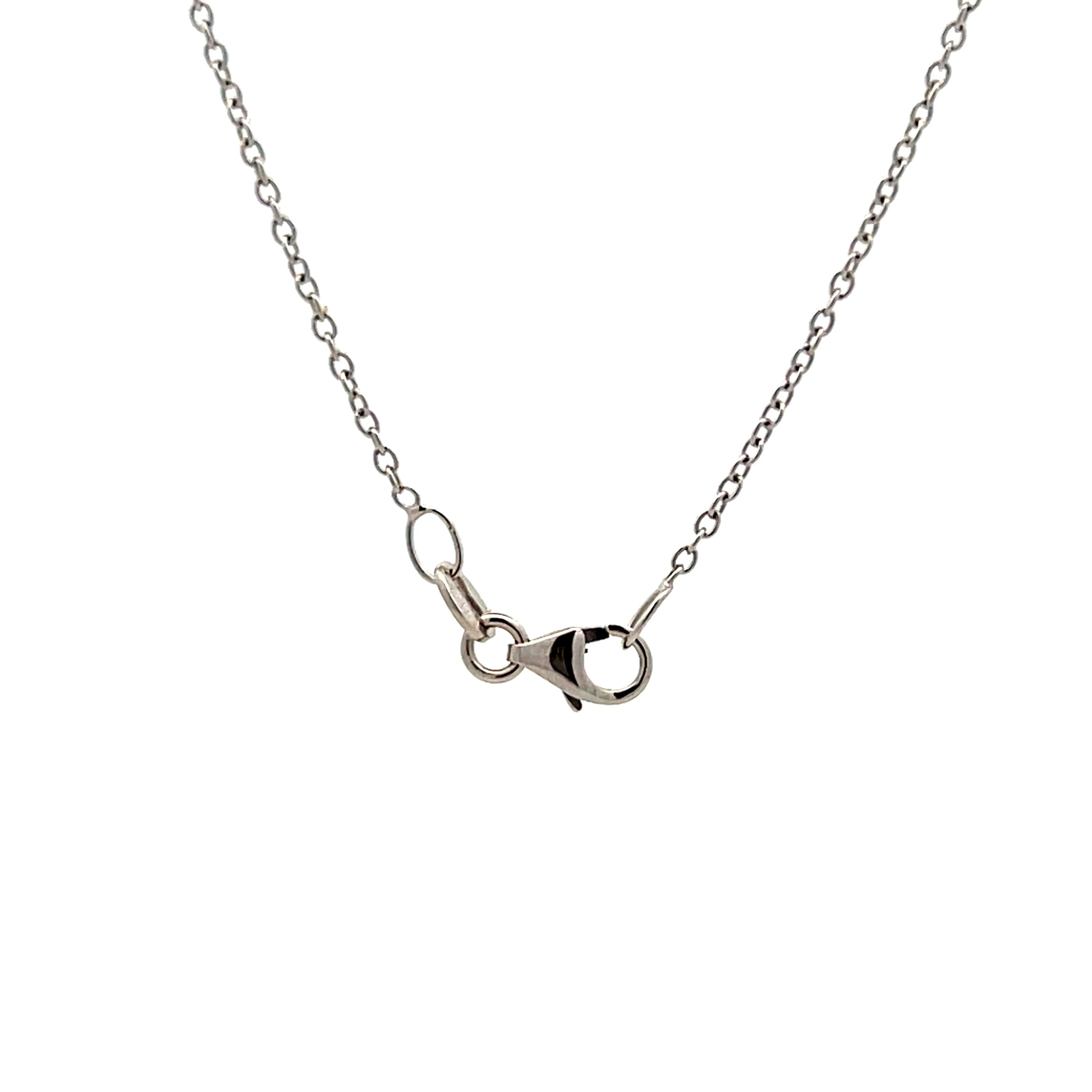 This pendant necklace features a .89 carat round cut blue sapphire surrounded by a halo of 22 round brilliant cut diamonds totaling .17 carats, all set in 14 karat white gold. The diamonds, measuring between .90-1.0mm each, continue up onto the bail for consistent sparkle throughout the piece. An 18-inch chain completes the necklace while the prong settings allow maximum light to enter the stones, highlighting the deep blue of the sapphire against the white diamond halo.