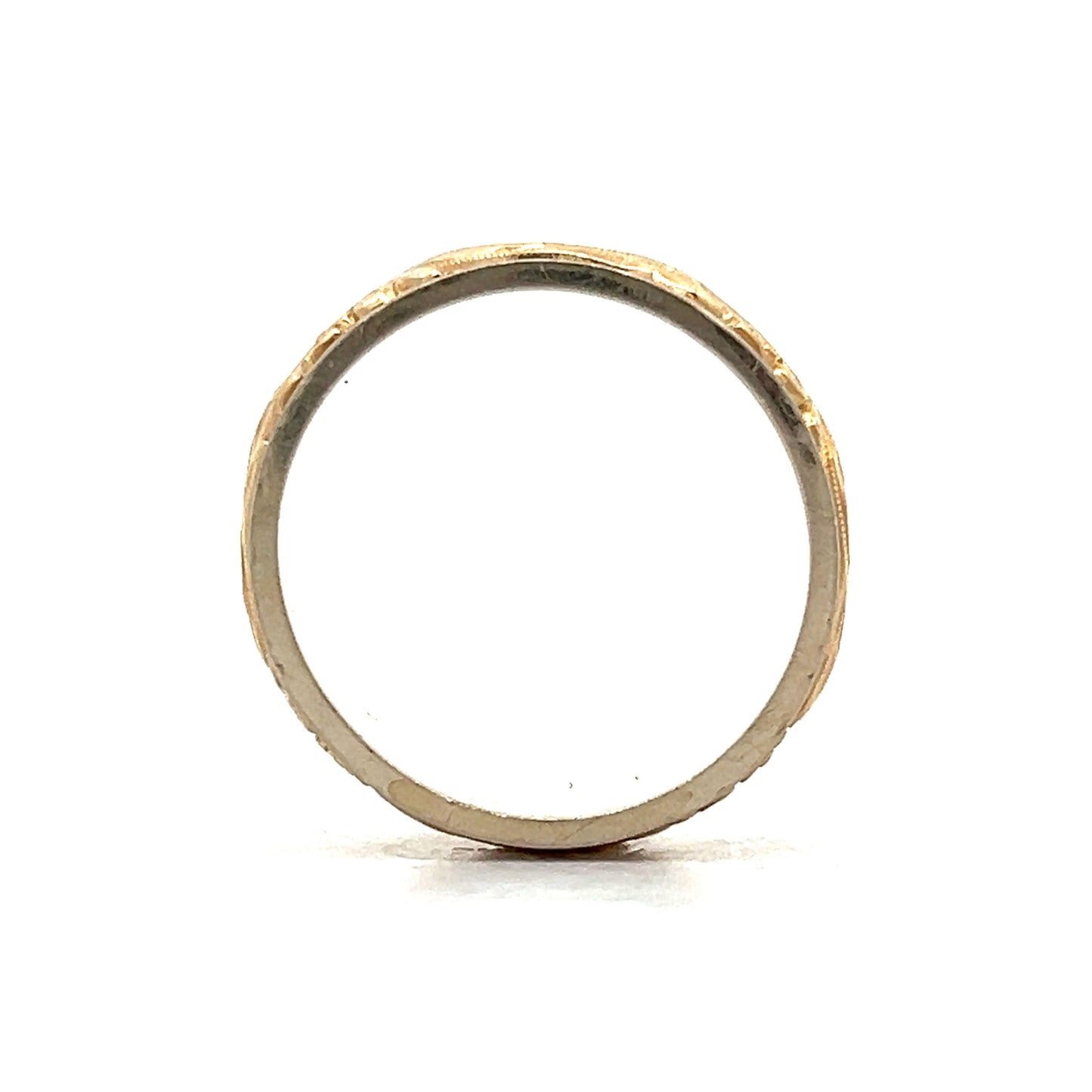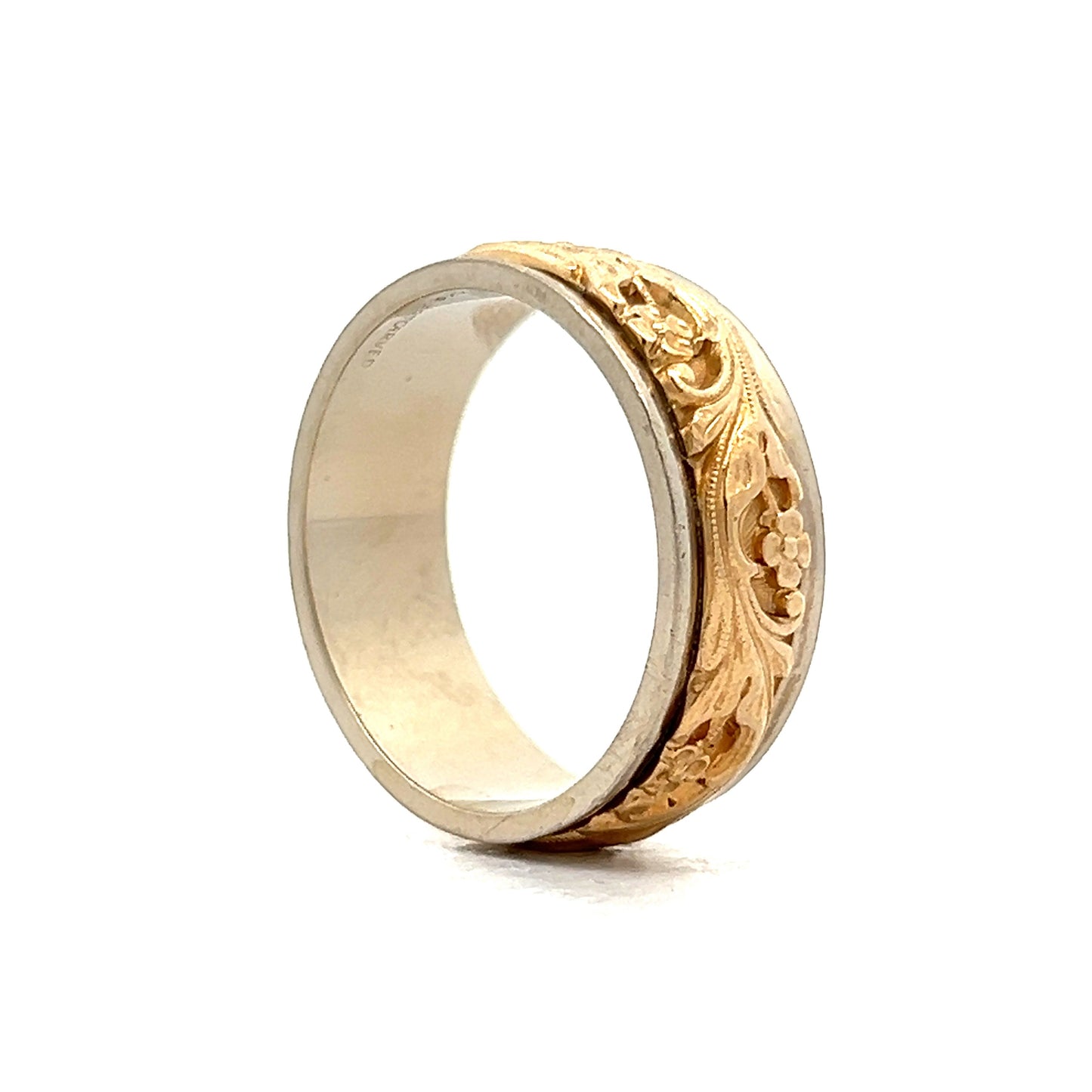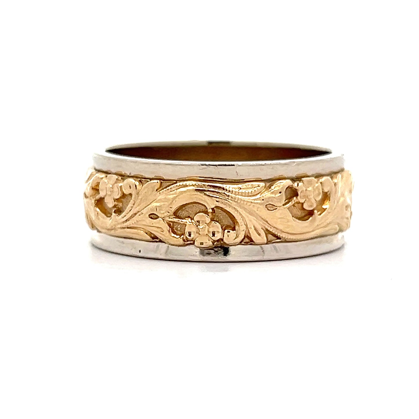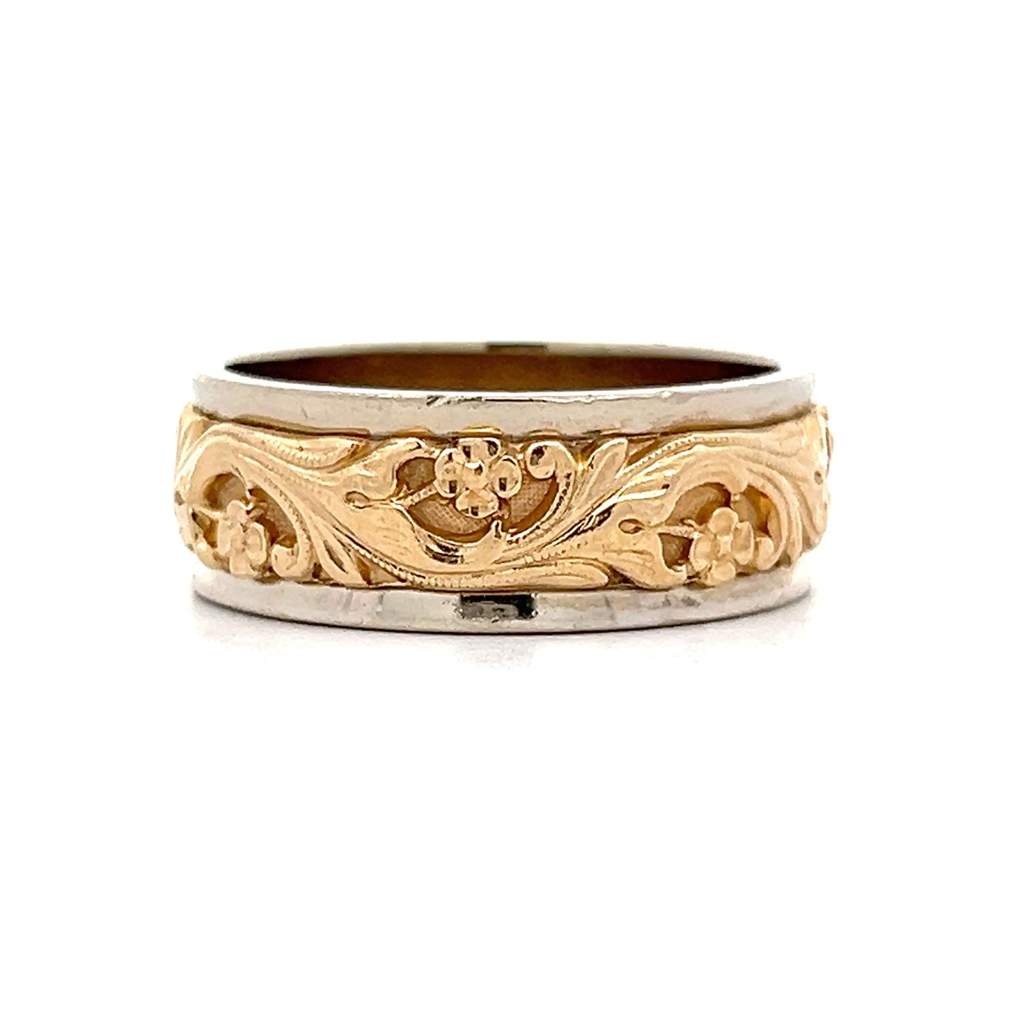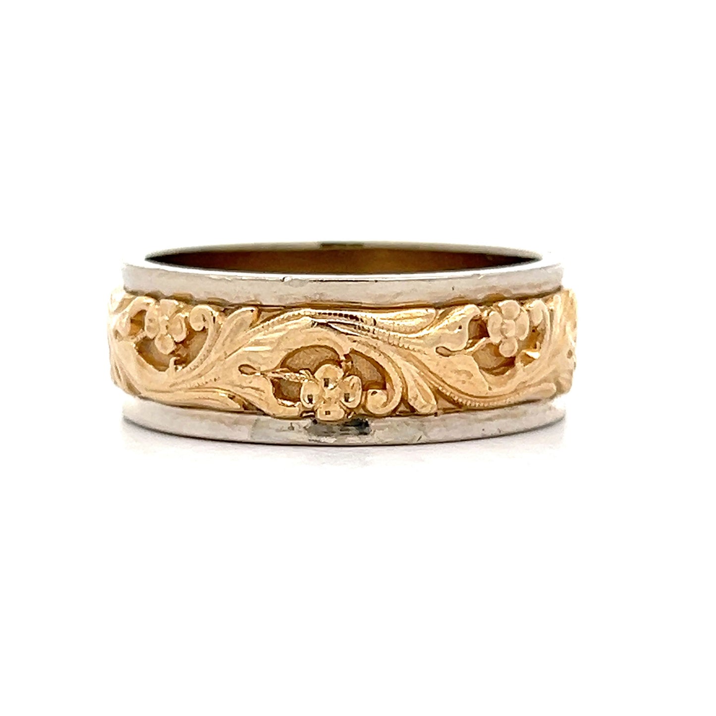 This men's wedding band features an intricate floral design inspired by the Art Nouveau period set in a 14 karat yellow gold center. The band is encircled by a 14 karat white gold edge, creating a striking two-tone contrast. Measuring 8mm wide, this ring showcases detailed craftsmanship and a blend of classic and modern styles. This piece perfectly combines antique-inspired aesthetics with modern design, making it a unique and captivating choice for a wedding band or ring.