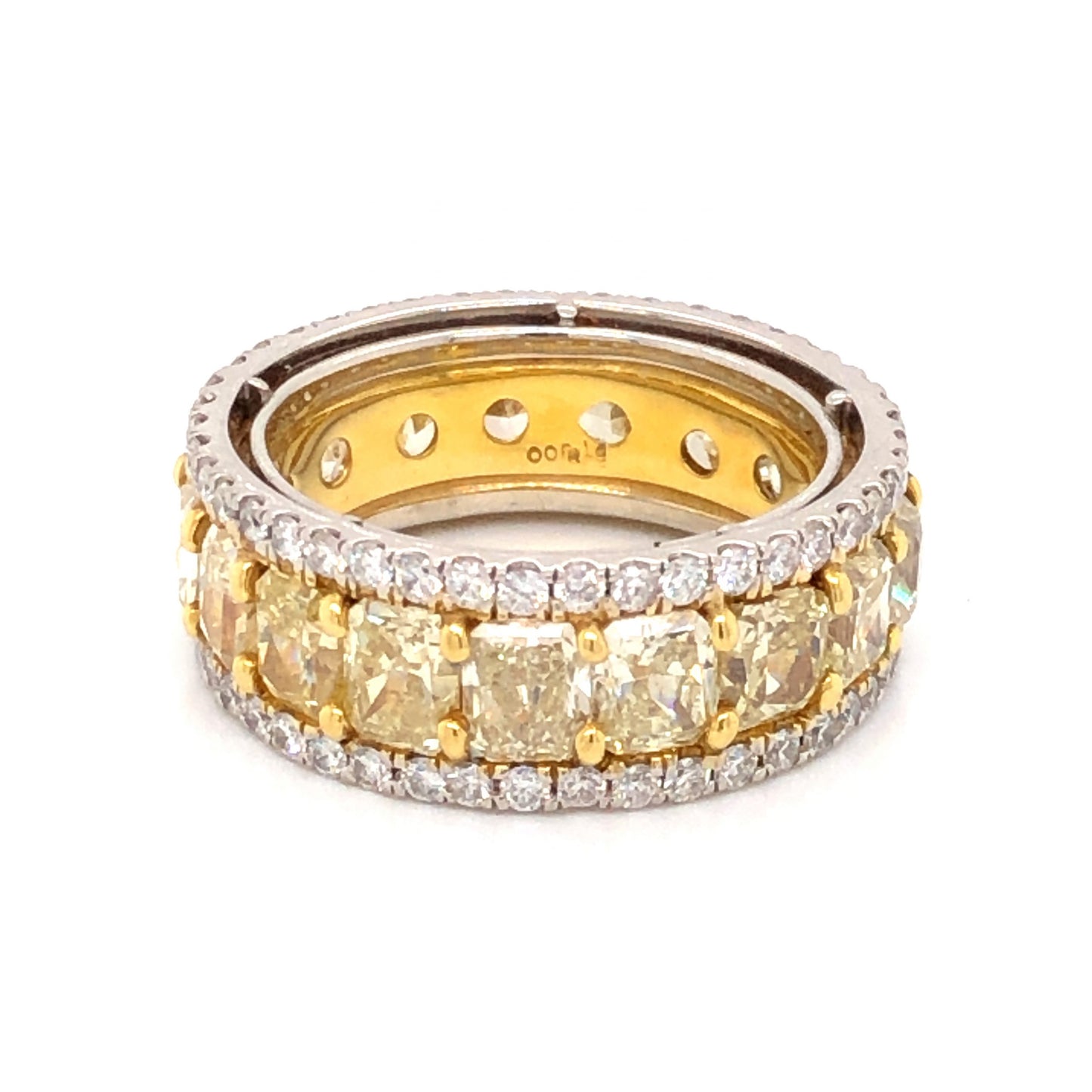 9.02 Radiant Cut Yellow Diamonds in Platinum 18k Yellow Gold. Matching fancy yellow diamonds to complete an eternity band is a challenge when it comes to these rare gemstones. This eternity band secures seventeen (17) radiant cut fancy yellow diamonds with shared prongs the entire way around the band. The center stones are framed with round brilliant cut diamonds and this right hand ring finishes in both platinum and 18k yellow gold.