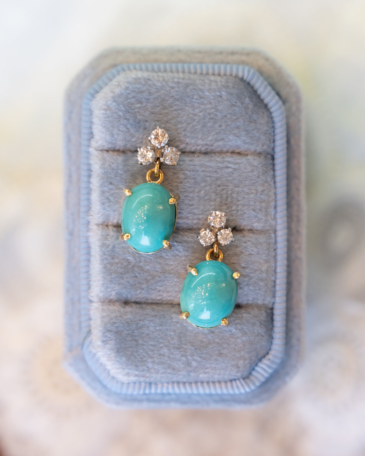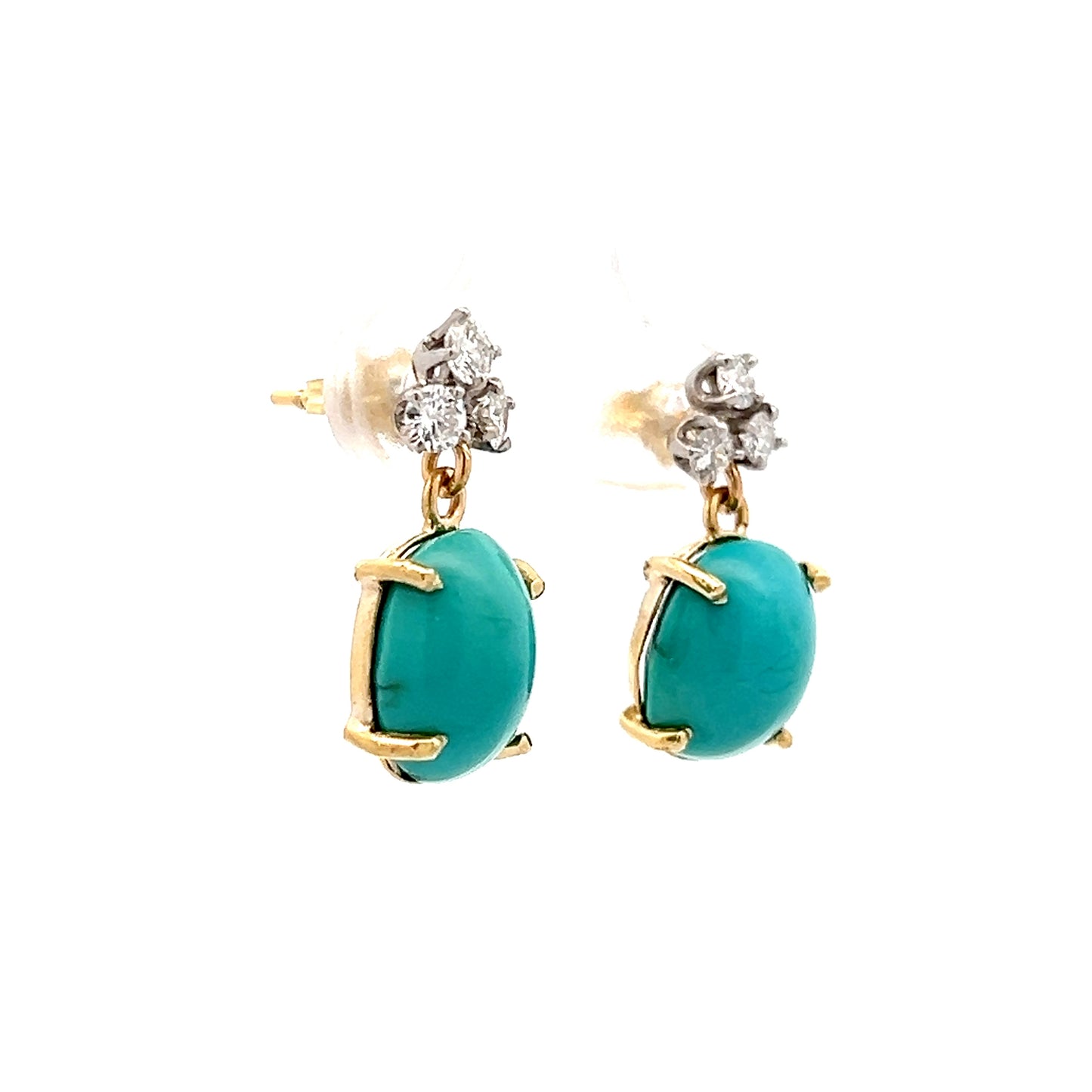 These drop earrings are made from 18 karat yellow gold with large oval cabochon turquoise stones weighing 9.46 carats. A cluster of three round brilliant cut diamonds sits at the top of each turquoise stone, with each diamond measuring 2.5mm for a total diamond weight of .36 carats.