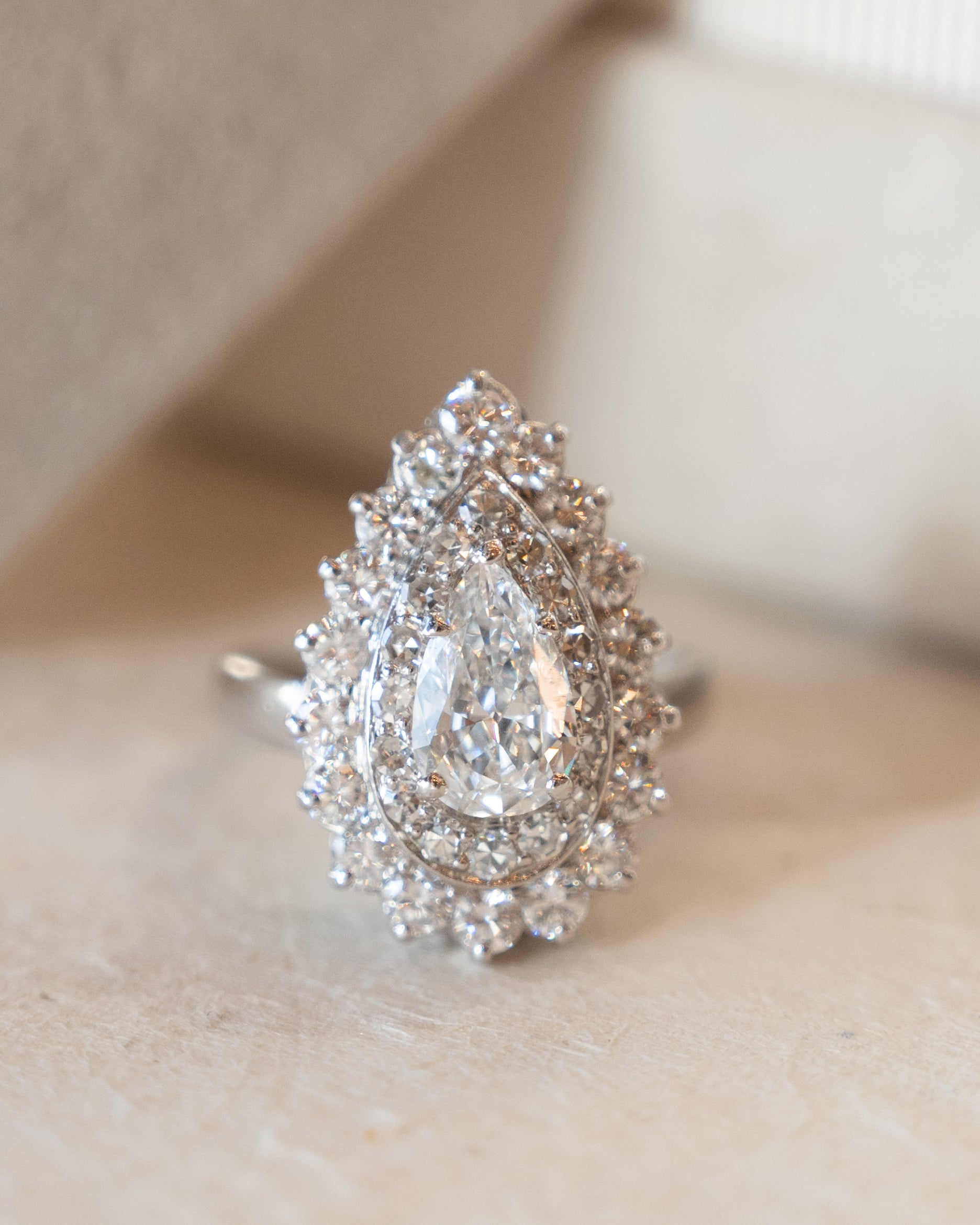 The antique pear cut has a teardrop shape with faceting patterns typical of older cutting styles, creating a different sparkle pattern than modern pear cuts. The ring has a total diamond carat weight of 2.22 carats across all stones and uses a platinum pave setting throughout.