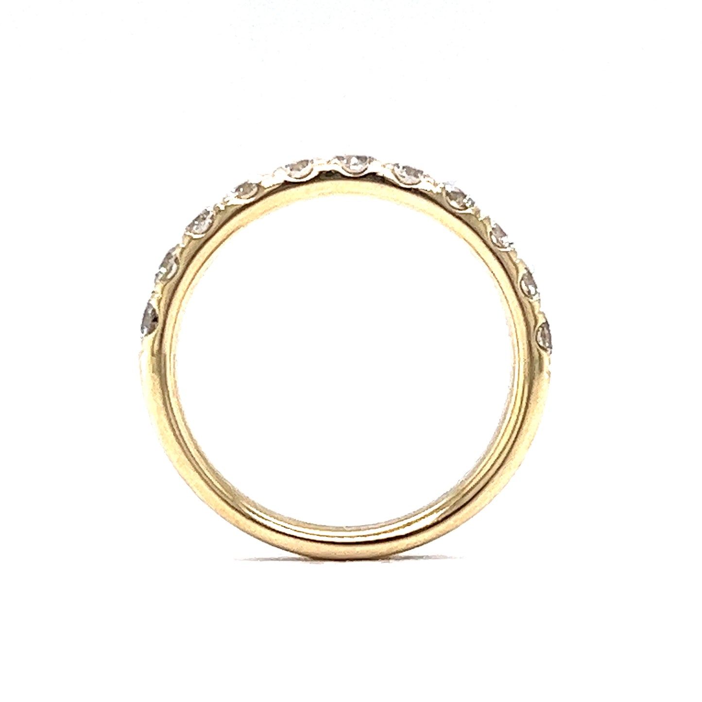 This diamond wedding band is crafted in 14 karat yellow gold and is on the slightly wider side. The design features ten (10) round brilliant cut diamonds wrapping around the top half of the band. Each diamond is a gorgeous G-H in color, and VS1 in clarity giving it loads of sparkle. The polished yellow gold band has a flat profile, perfect for stacking next to any style of engagement ring and creating an inviting look that will last a lifetime.