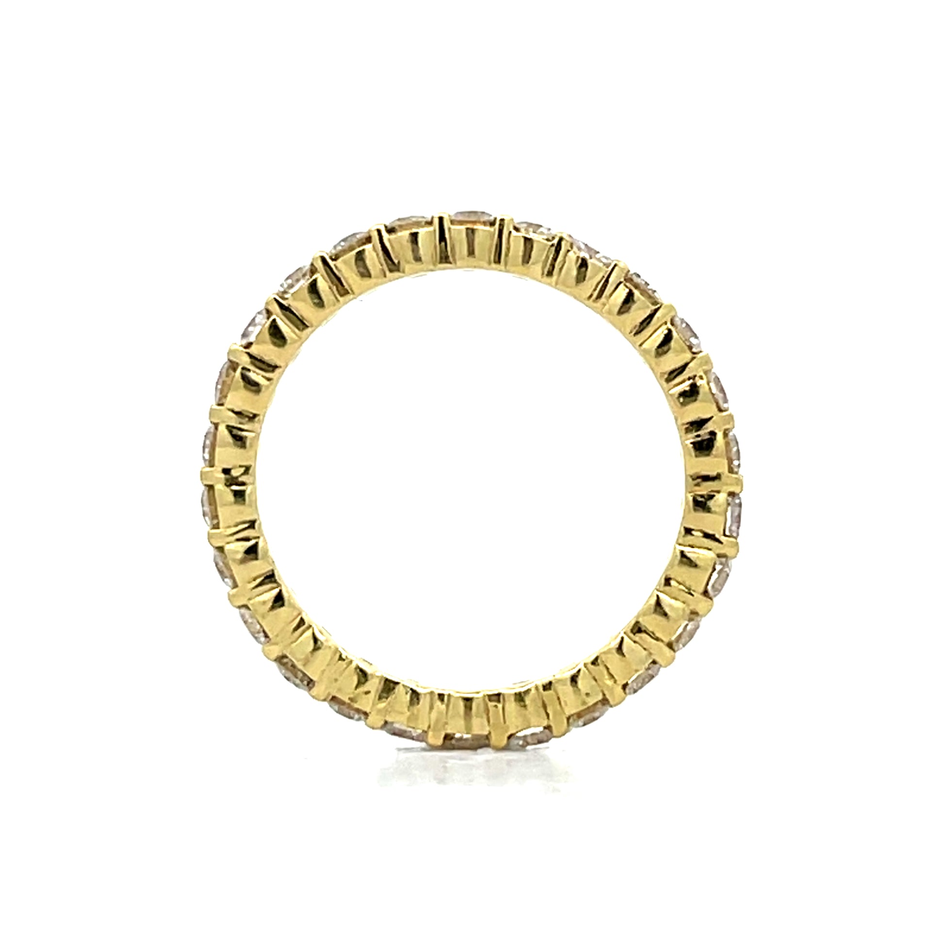 This 18 karat yellow gold eternity band features .91 carats of round brilliant cut diamonds in F color and SI1 clarity, set in shared prongs that circle the entire band. The shared prong setting lets more of each diamond show, creating continuous sparkle around the finger. Yellow gold frames the diamonds beautifully while the band can stack seamlessly with an engagement ring or other rings.