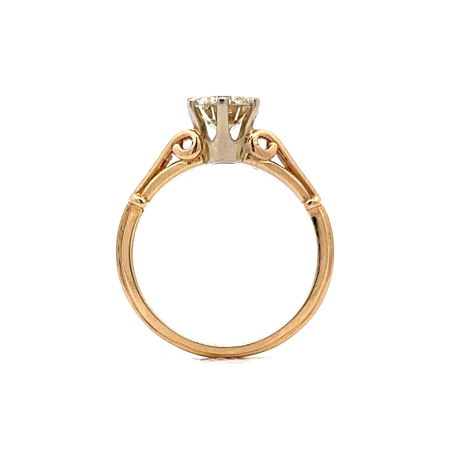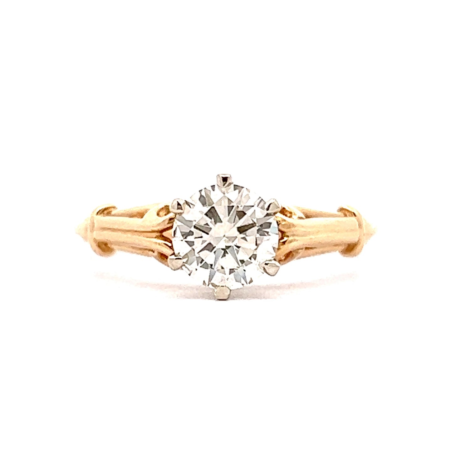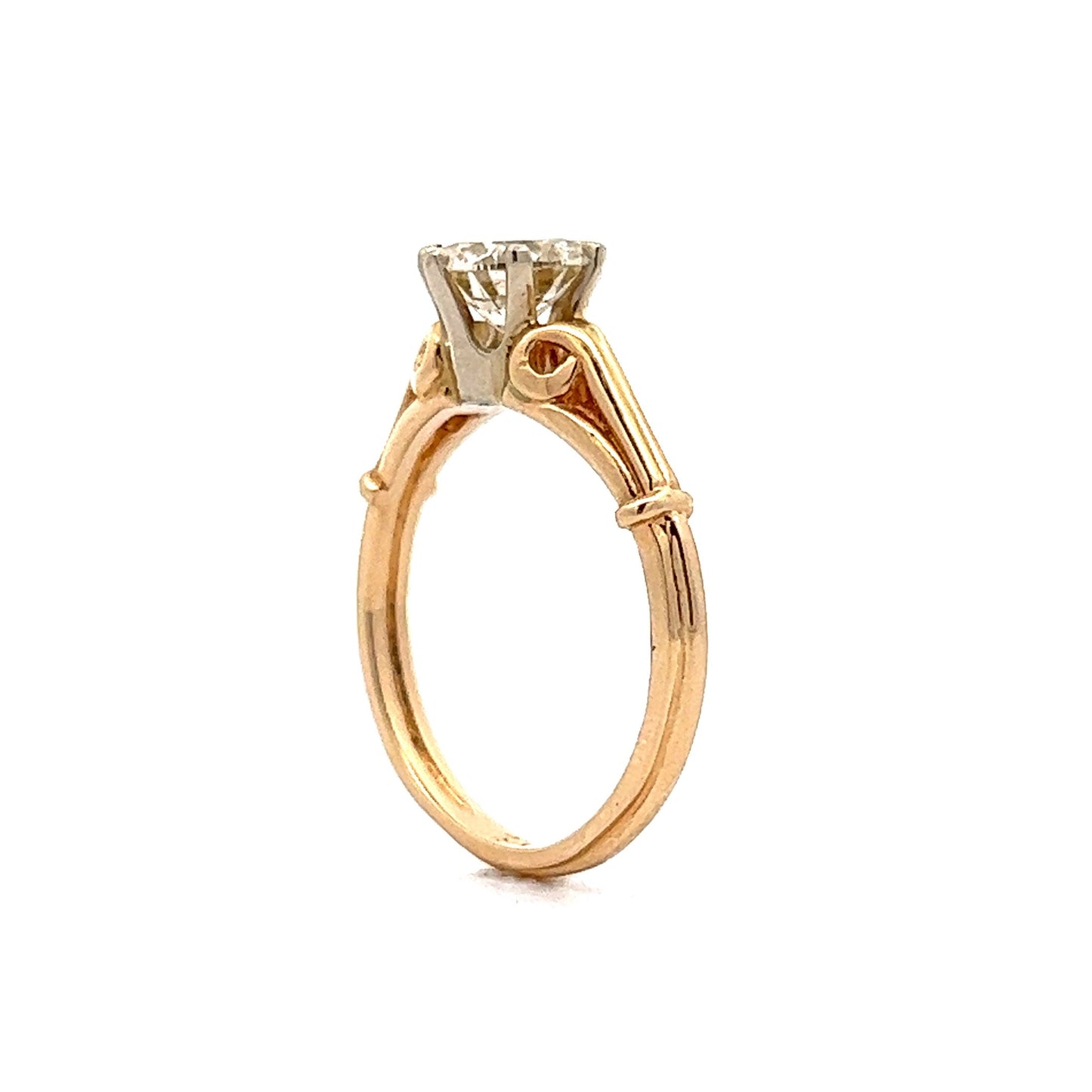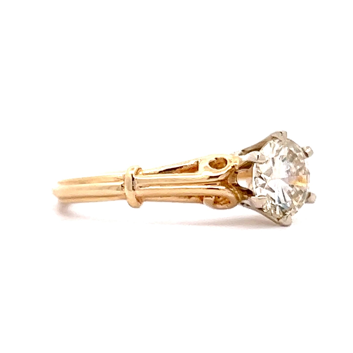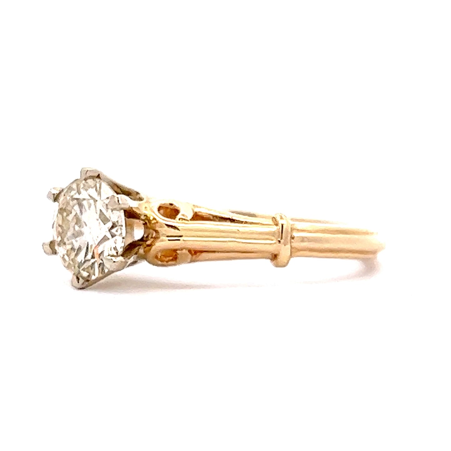 This unique Mid-Century .92 Solitaire Diamond Engagement Ring in 14K Yellow Gold is a solitaire with something extra! The engagement ring is crafted from 14 karat yellow gold and features a .92 carat transitional cut diamond in a six-prong setting. The diamond is certified VS2 clarity and N color, making it a beautiful and eye-catching stone. The band features a rustic design style. The six prong basket has a royal shape. A one-of-a-kind engagement ring that expresses your personal style!