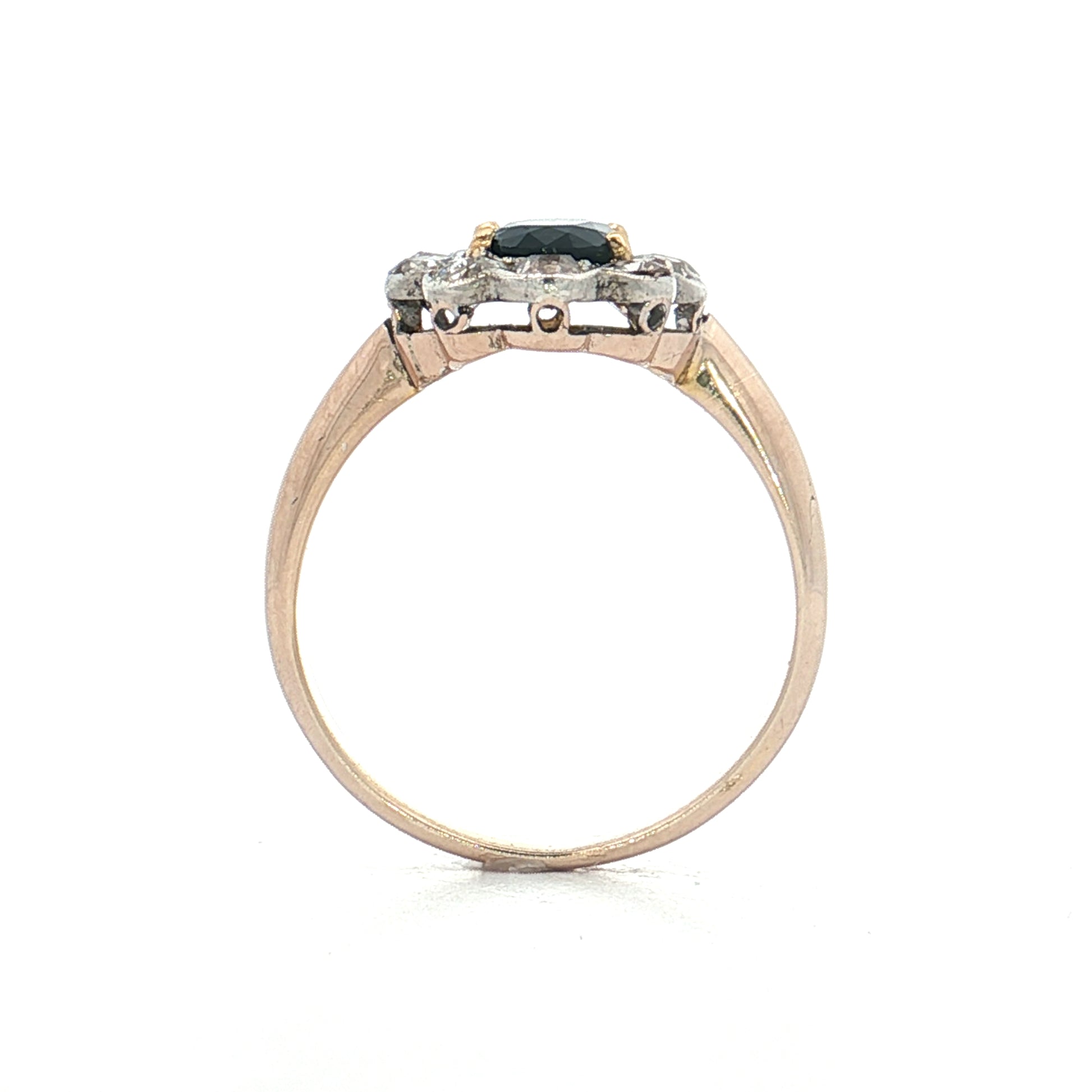 Encircling the sapphire are old mine cut diamonds totaling .90 carats, set in sterling silver bezels that create a classic Victorian halo design. The ring pairs a 9 karat yellow gold band with sterling silver settings, giving it a two-tone look where warm gold meets bright silver.