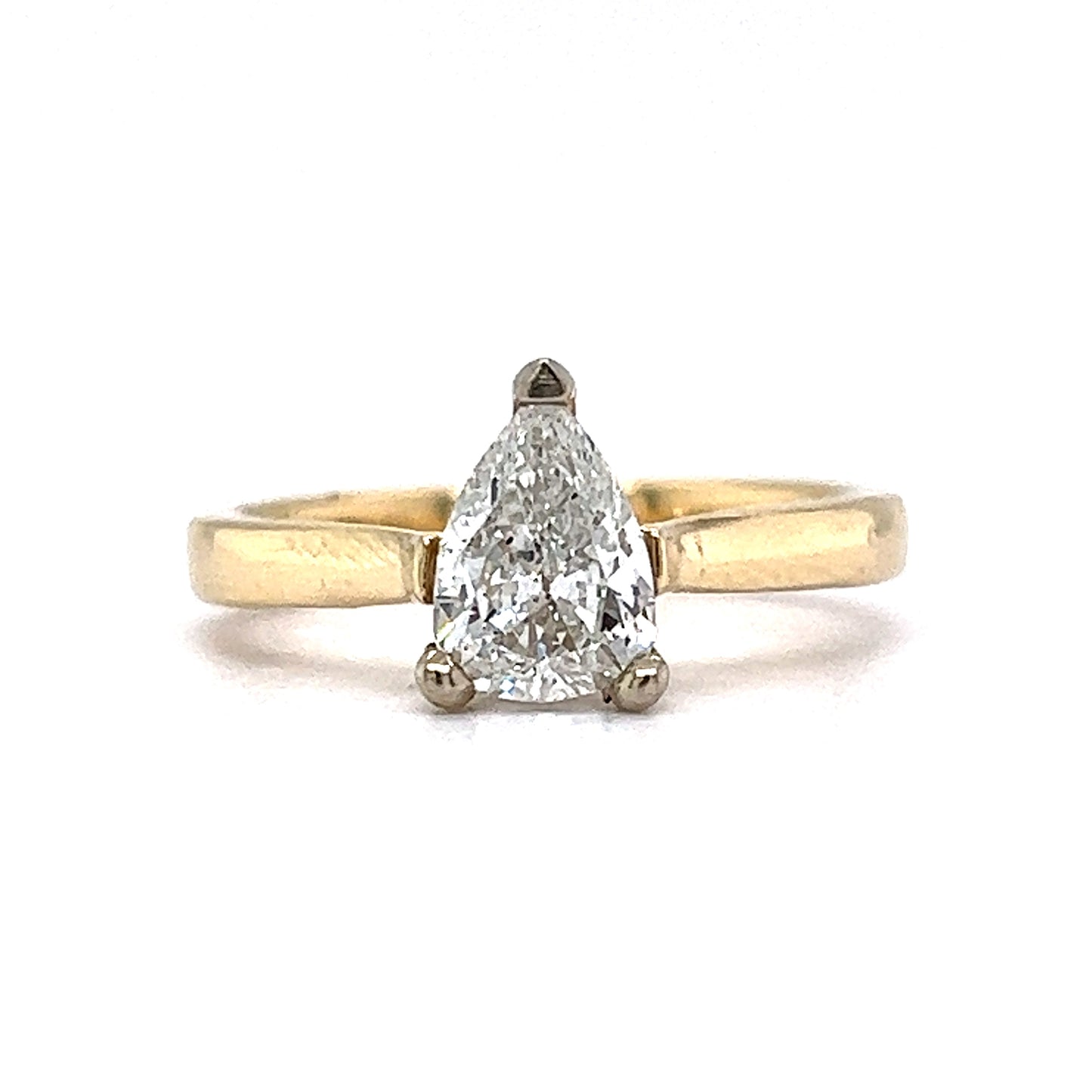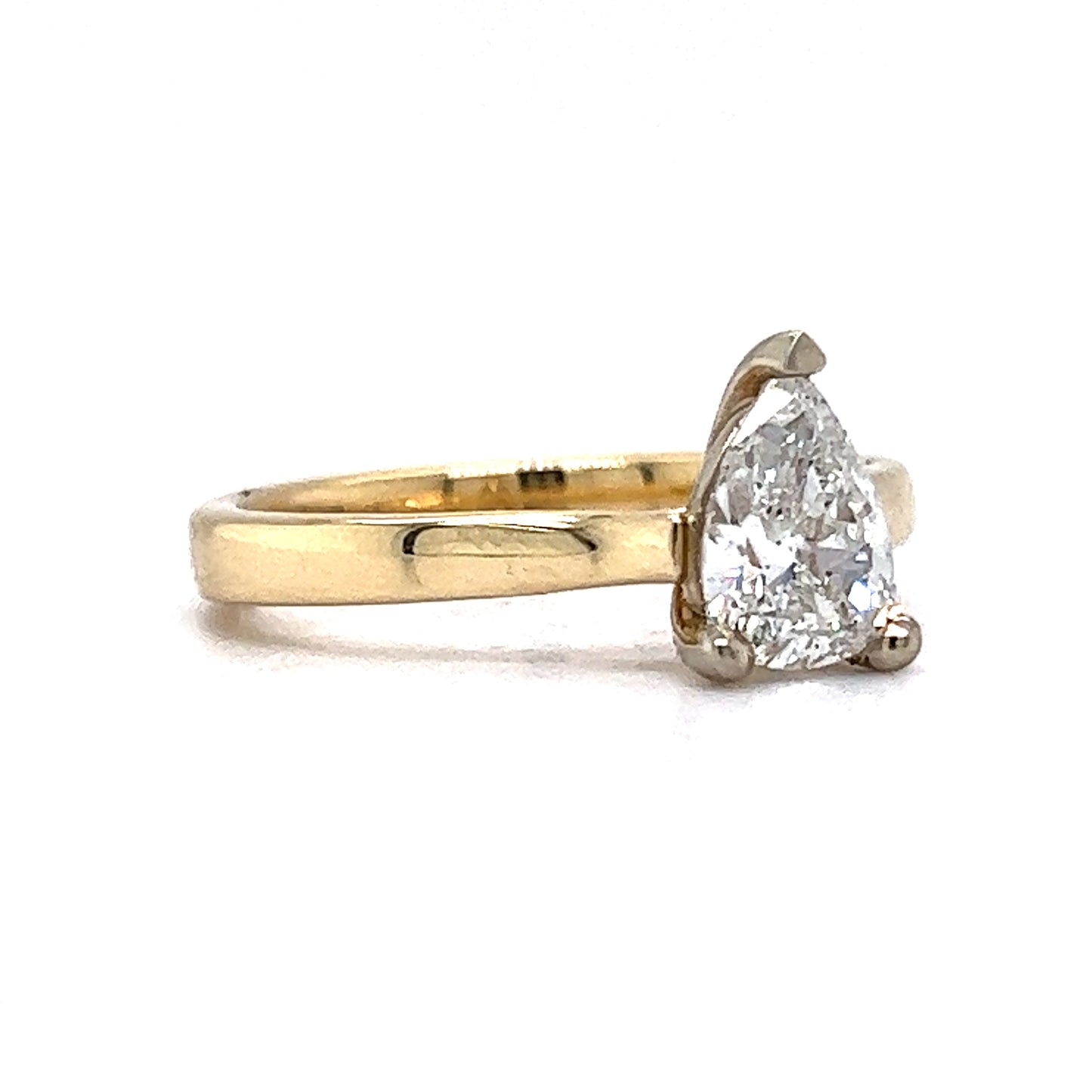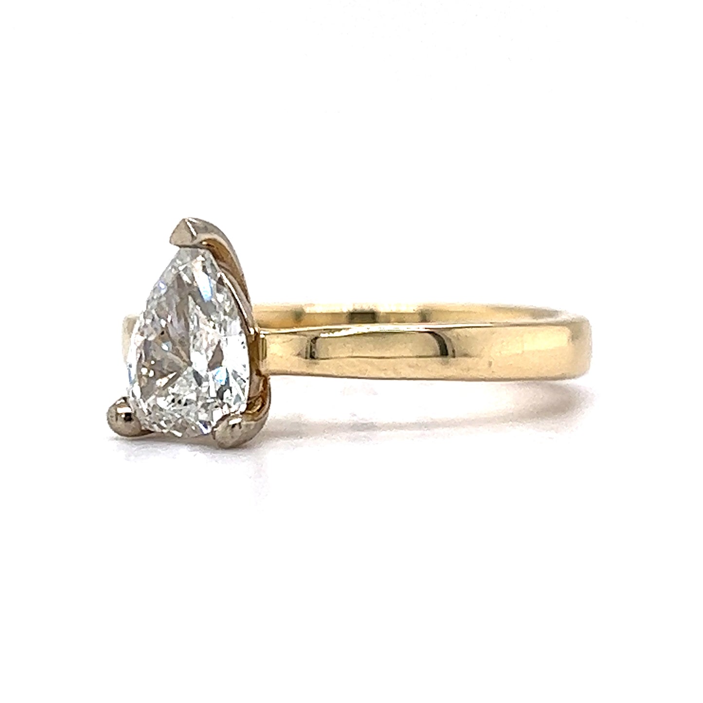.94 Pear Cut Diamond Solitaire Engagement Ring in 14K Yellow Gold. This modern solitaire engagement ring features a dazzling .94 carat pear cut diamond finished in 14 karat yellow gold. The diamond is colorless and bright, set in three secure prongs. With beautiful facet varieties, the premiere diamond sparkles from every angle. From the profile, the diamond rests in a modern cathedral mounting finished on a polished 14 karat yellow gold band. The perfect balance of contemporary design and classic beauty.
