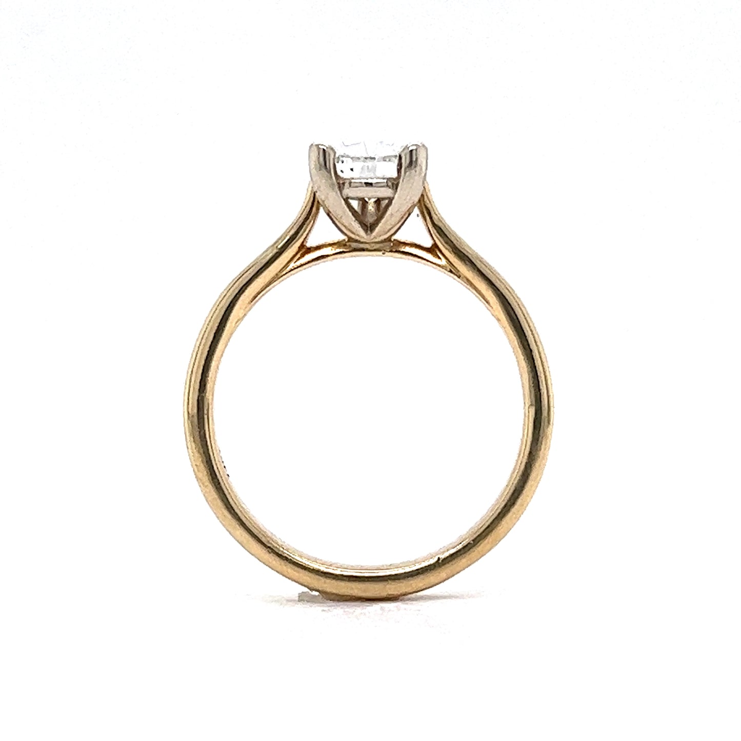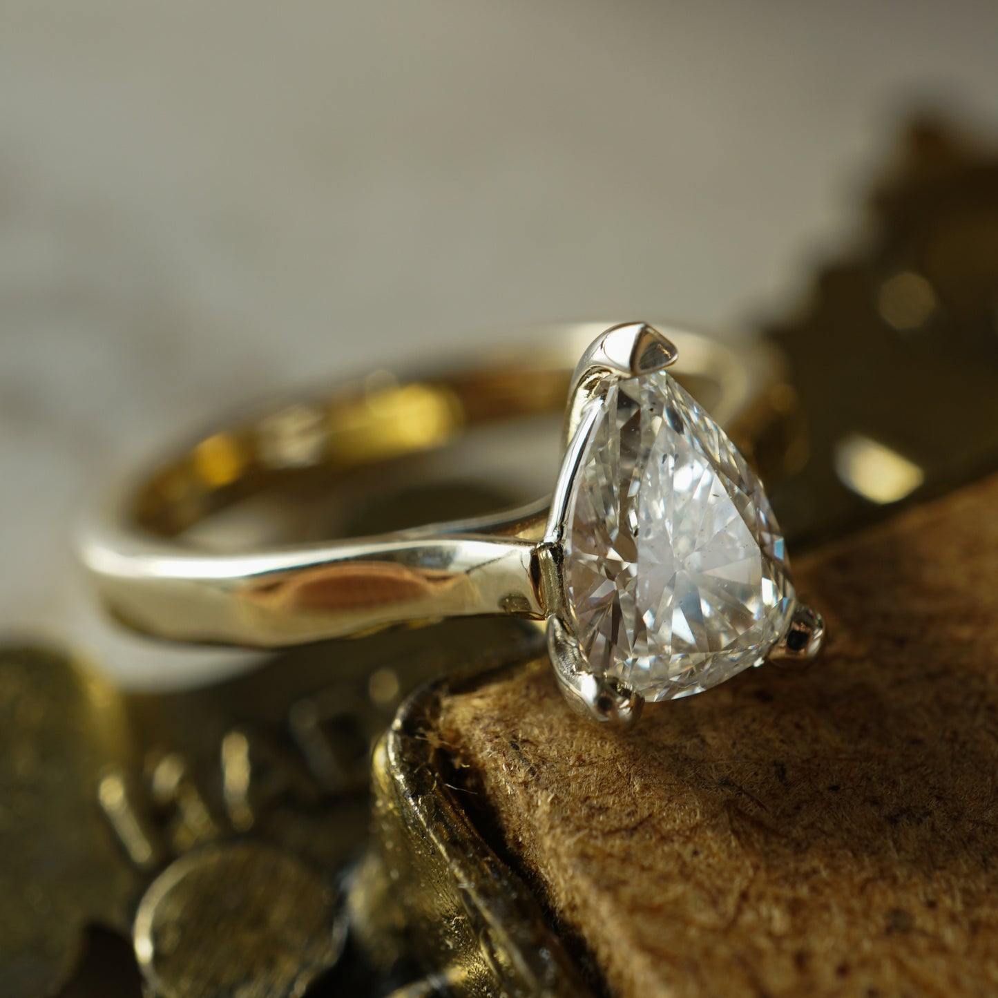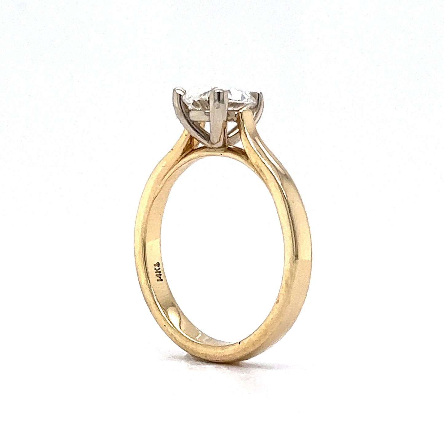 .94 Pear Cut Diamond Solitaire Engagement Ring in 14K Yellow Gold. This modern solitaire engagement ring features a dazzling .94 carat pear cut diamond finished in 14 karat yellow gold. The diamond is colorless and bright, set in three secure prongs. With beautiful facet varieties, the premiere diamond sparkles from every angle. From the profile, the diamond rests in a modern cathedral mounting finished on a polished 14 karat yellow gold band. The perfect balance of contemporary design and classic beauty.