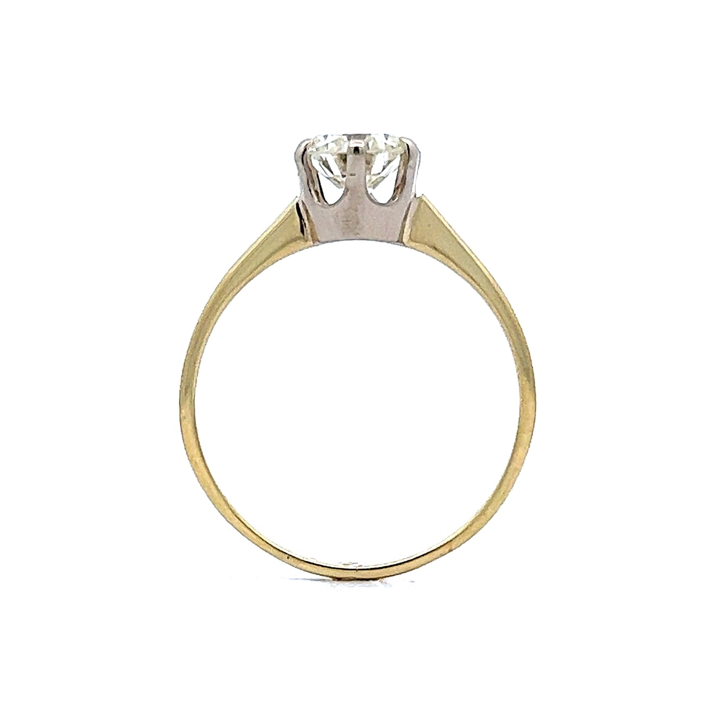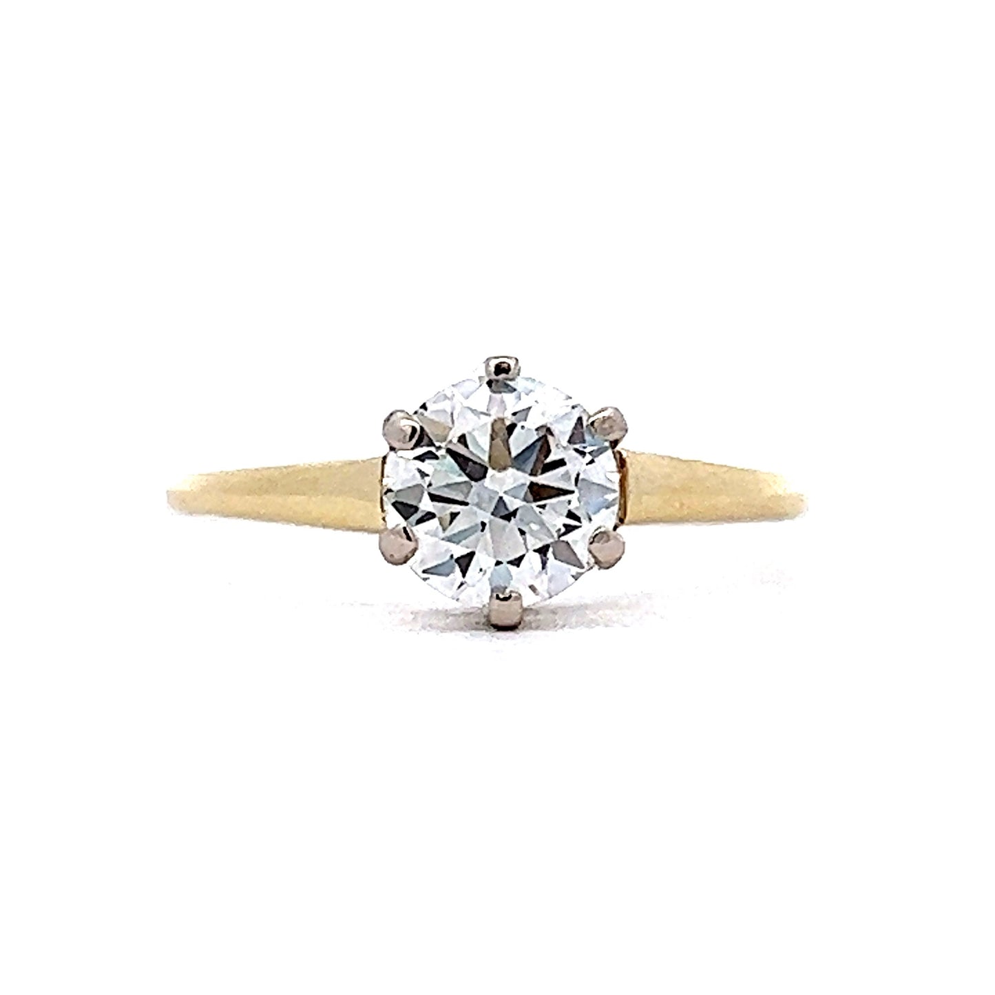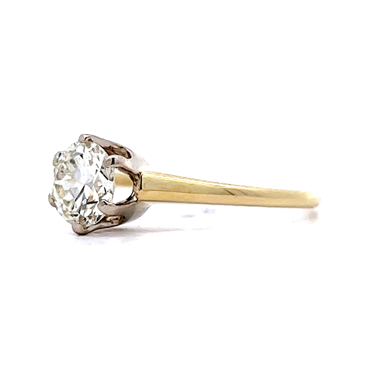 This gorgeous two-tone engagement ring features a stunning .94 carat GIA-certified transitional cut diamond set in 14k yellow gold and white gold. With a clarity rating of VS2 and a diamond color of K, the center stone sparkles with brilliance from every angle. A timeless piece, this vintage solitaire engagement ring is sure to dazzle your beloved for years to come.