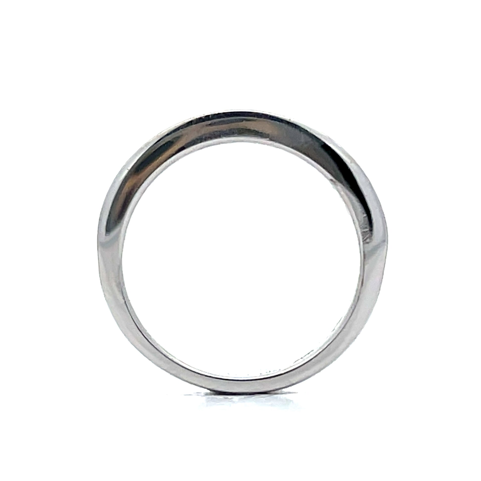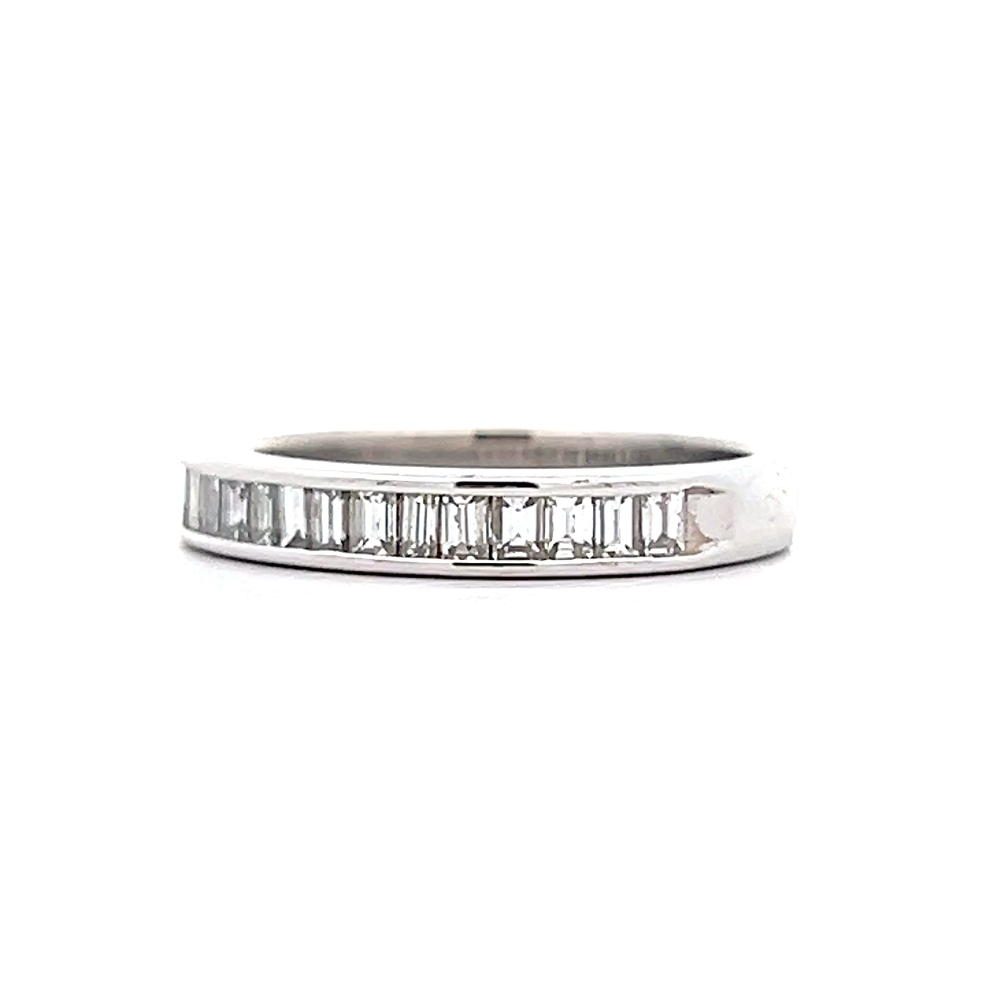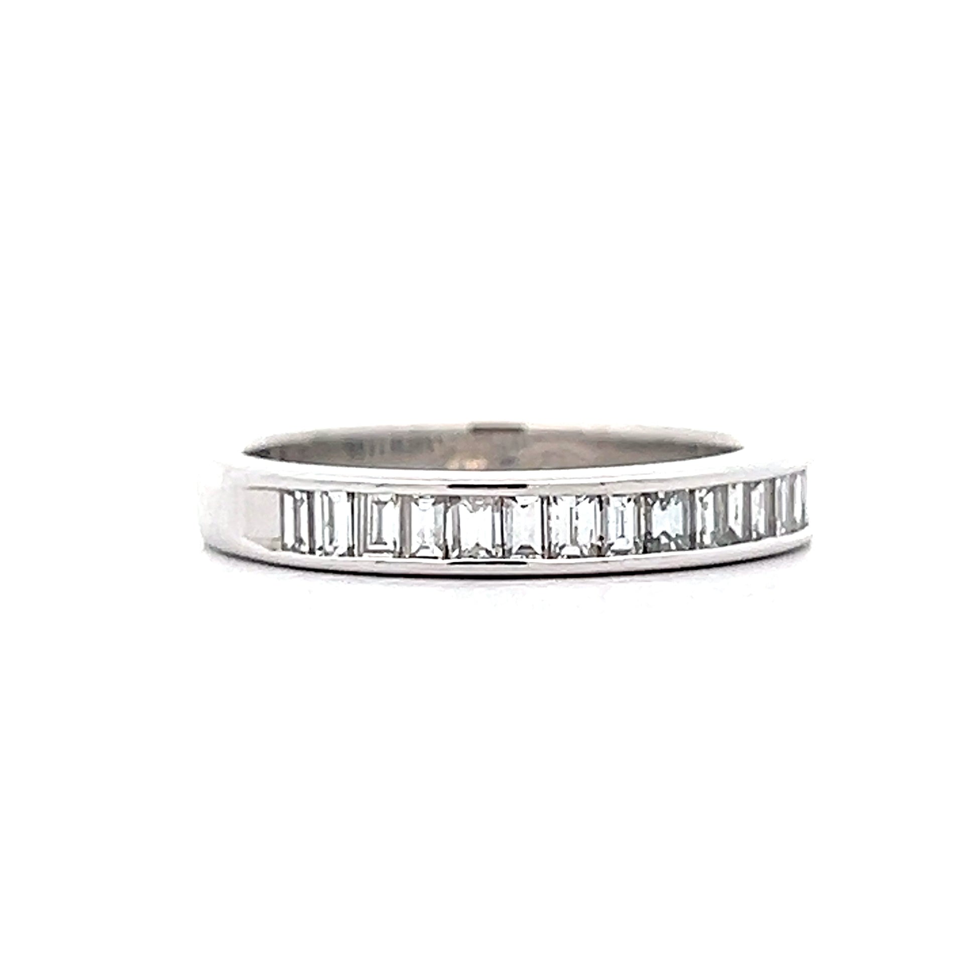 This 14 karat white gold half-eternity wedding band features baguette cut diamonds totaling .95 carats with VS2 clarity and G-H color in channel settings. The rectangular shaped diamonds wrap partway around the band, creating continuous sparkle from multiple angles. The channel setting provides secure placement while allowing maximum light to reach the diamonds.