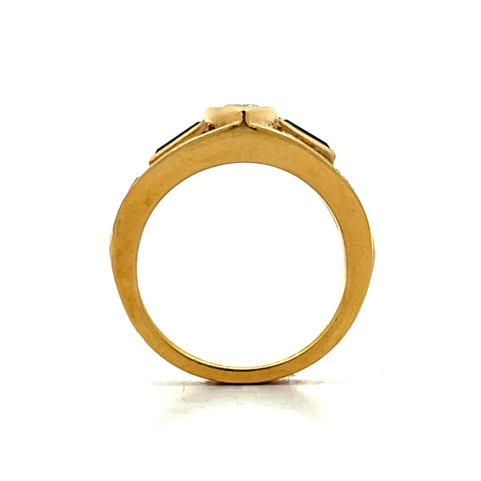 This Modern era Mouboussin cocktail ring features a .95 carat marquise center diamond with L color and VS2 clarity, bezel-set in 18 karat yellow gold, flanked by two tapered baguette emeralds totaling .40 carats and measuring 5.00 x 3.00 x 1.50mm each. Round brilliant cut diamonds totaling .84 carats with I color and SI1 clarity form a halo. The total diamond weight is 1.79 carats. Green emeralds provide color contrast against the diamonds throughout the geometric design.
