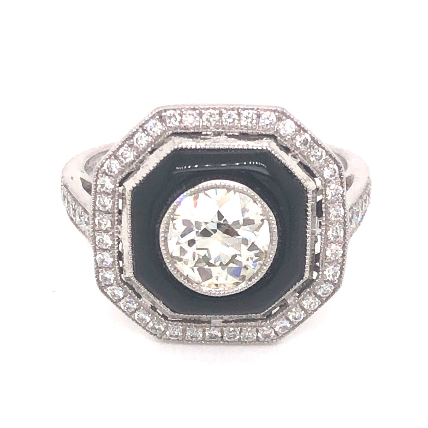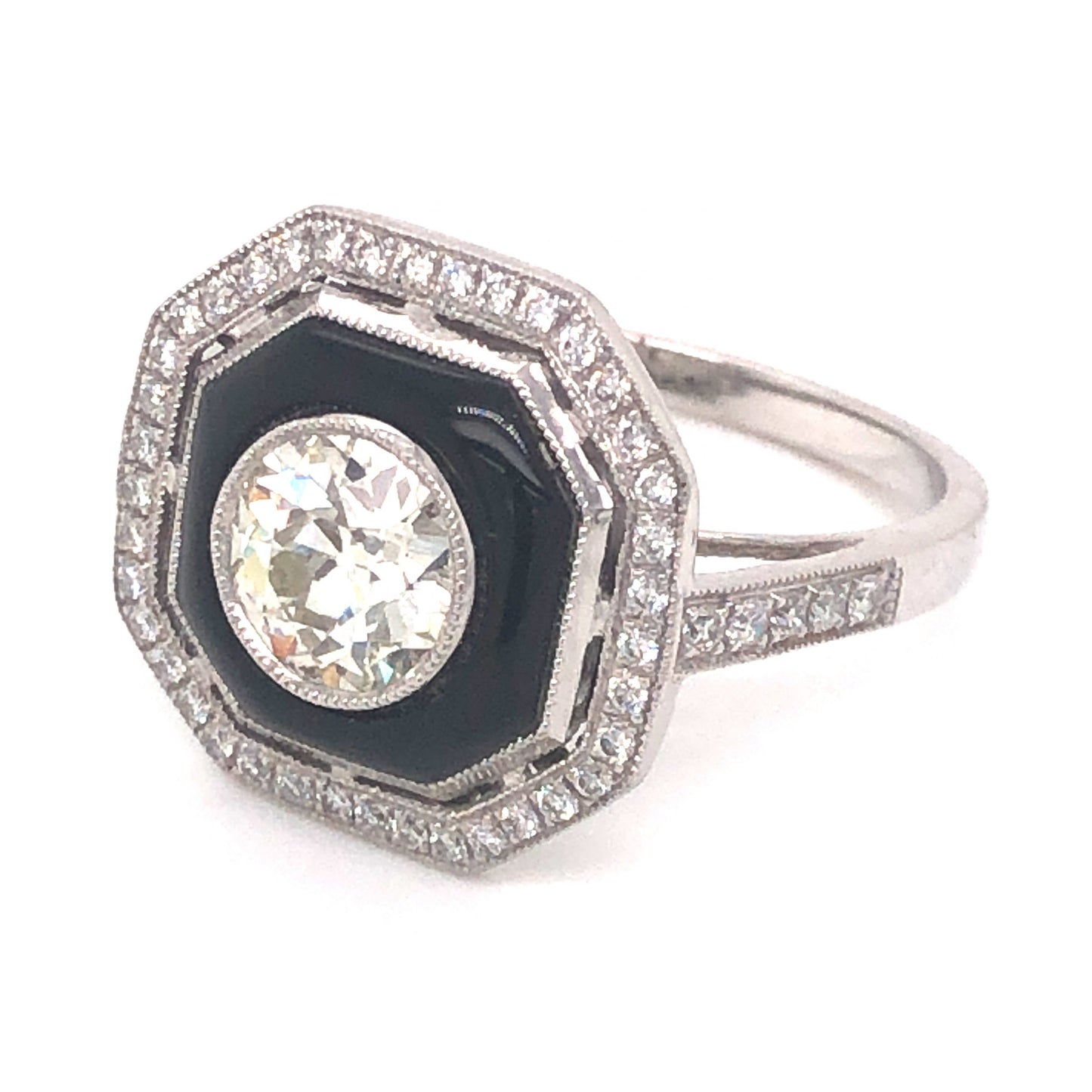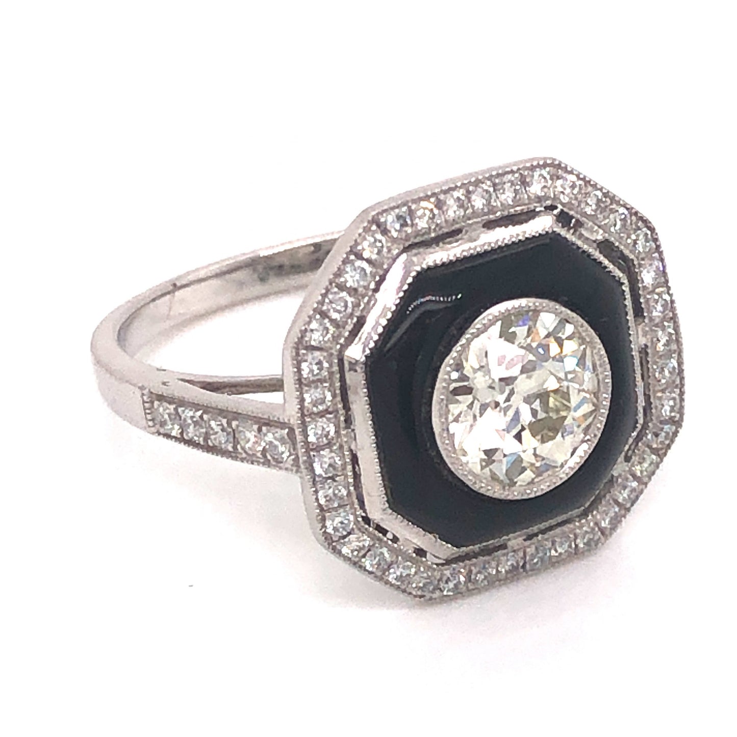 .95 Old European Cut Diamond Onyx Cocktail Ring in Platinum. This modern right hand ring features 1.22 carats of diamonds finished in black onyx and platinum. The center stone is a .95 carat Old European cut diamond that is bezel set into the center of the onyx. The primary diamond is near colorless and glittering, with milgrain engravings on its bezel setting. Forty-nine (49) .0055 carat diamonds halo the high polished onyx and accent the shoulders of the band. The outer halo of diamonds are mounted in surface prongs and are set in an engraved setting that gives the head of the ring a soft texture. Finished on a polished platinum band, this diamond and onyx ring has timeless elegance and unique style.