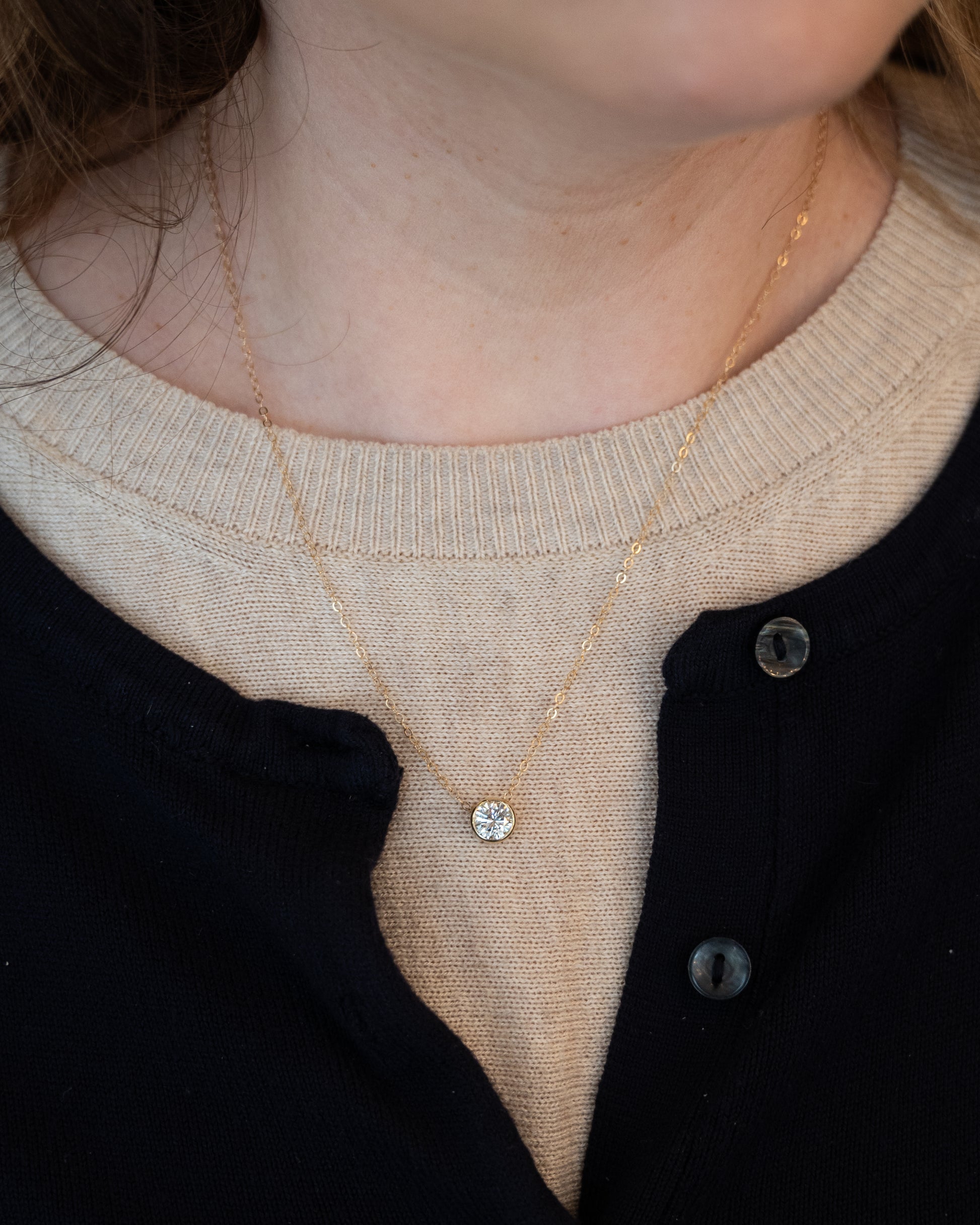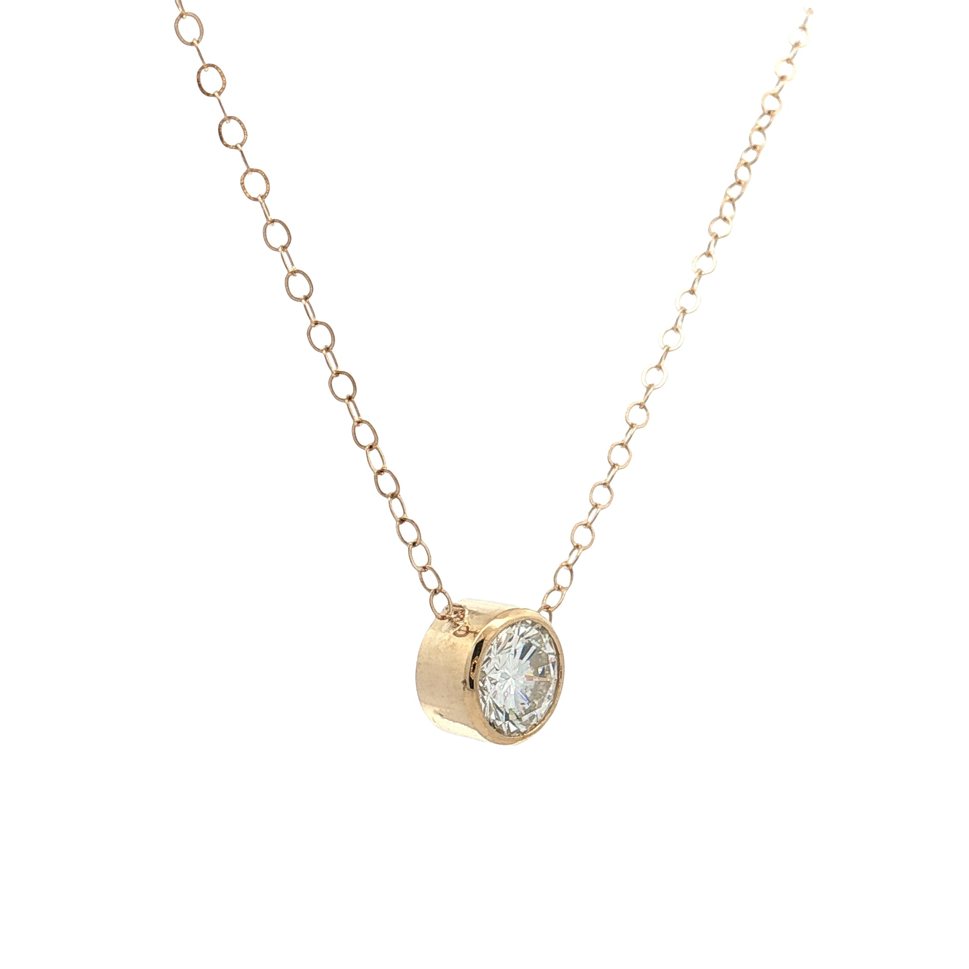 The round brilliant cut maximizes light return through its 57-58 facets, creating strong fire and brilliance from every angle. The diamond sits in a bezel setting that wraps a gold rim around the stone's edge for protection during wear. The pendant hangs from an 18-inch chain that sits at the collarbone and closes with a spring ring clasp.