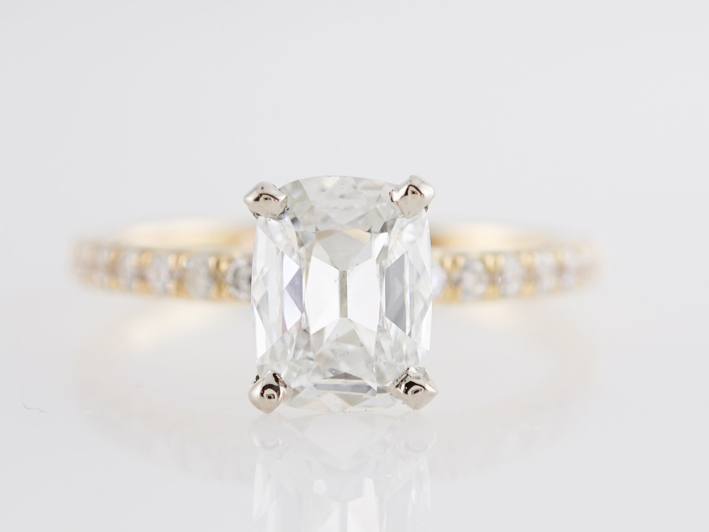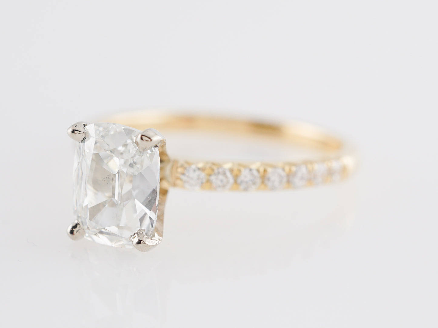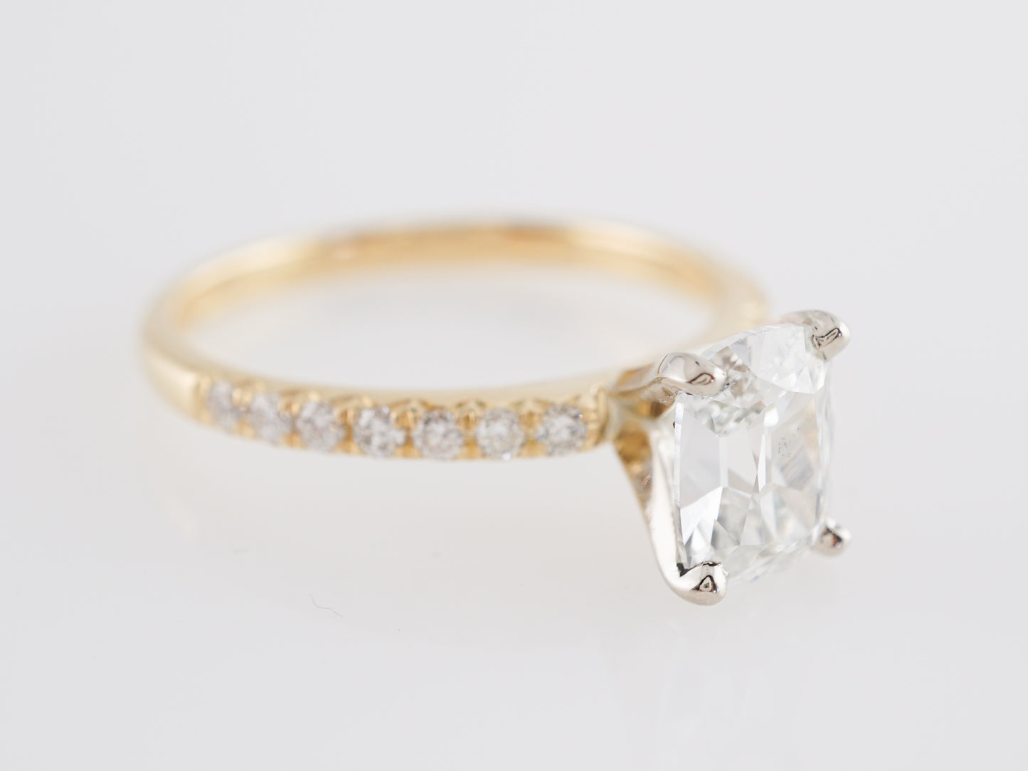.99 Cushion Cut Diamond Engagement Ring in 14k Gold. This dreamy engagement ring features a GIA-certified, .99 carat cushion cut diamond in 14k yellow gold. The primary stone has a color grade G and clarity rating of SI2. With rounded corners and facets that bring the sparkle to your eyes, this diamond ring has it all. Fourteen .015 carat diamonds accentuate the shoulders of the band and the cathedral mounting of the primary stone create an overall fabulous look. Reaching 7.62mm above the finger and weighing a total of 2.7 grams, this engagement ring is a stunning future classic.