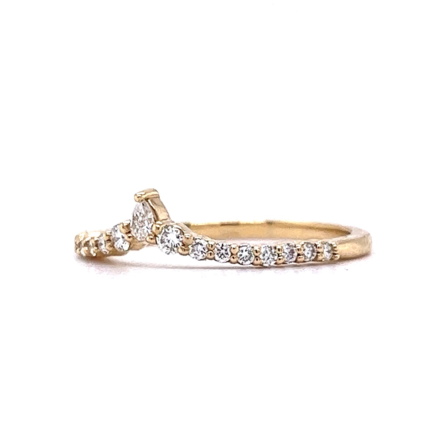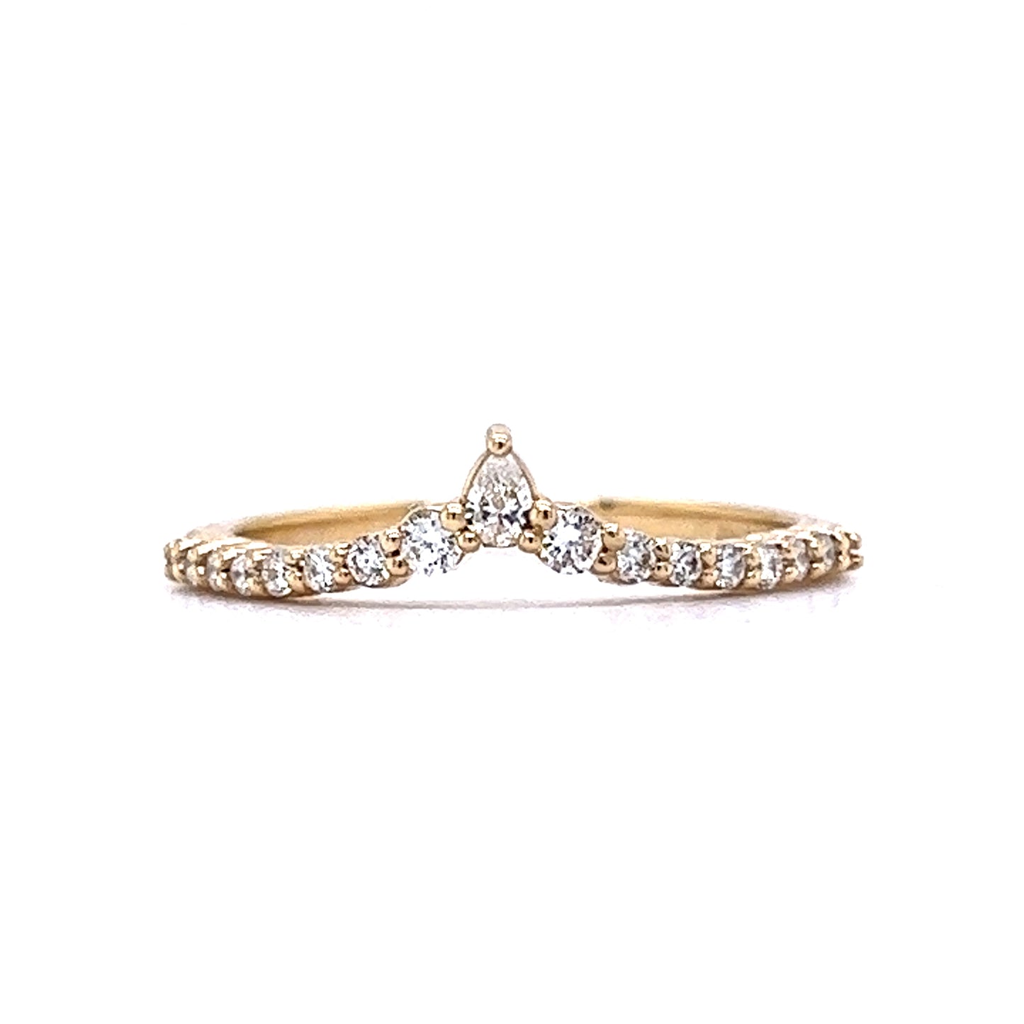 This Accented Contour Diamond Wedding Band from Stuller 126288 features a modern design with timeless appeal. Featuring .30 carats of natural diamonds, this 14K yellow gold ring includes one pear cut diamond H/SI1 with a weight of .10, two round diamonds H/SI1 with a total weight of .06, and fourteen round diamonds H/SI1 with a total weight of .14. The ring is sized at 7.0 and is 2.26mm high off of the finger. This Accented Contour Diamond Wedding Band is a classic piece that will be cherished for years to come. A great diamond wedding band to stack next to a Diamond Engagement Ring!