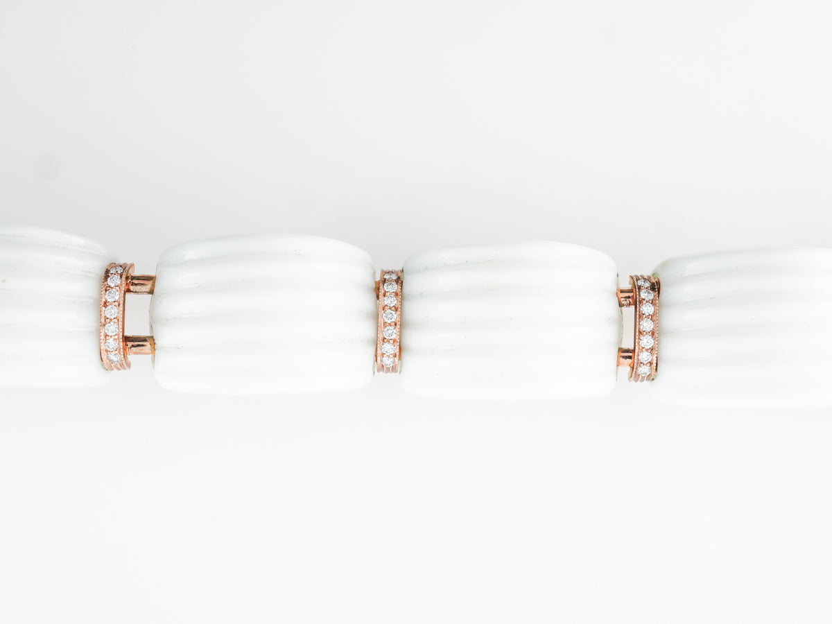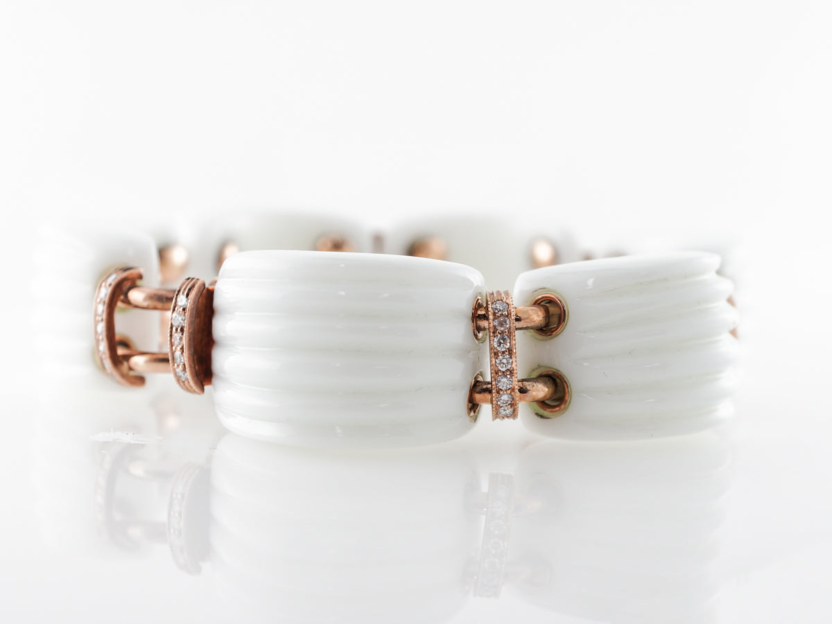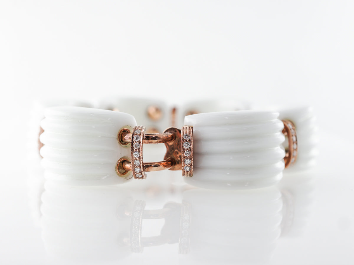 Agate Diamond Bracelet in 14k Rose Gold. This gorgeous modern bracelet features .61 carats of diamonds and is finished in 14 karat rose gold. The most prominent element of the bracelet are the wonderfully carved agate pieces adorned with round diamonds set in rose gold. The bracelet is rather rigid, doesnt have much movement, and is secured with an alligator tongue clasp.