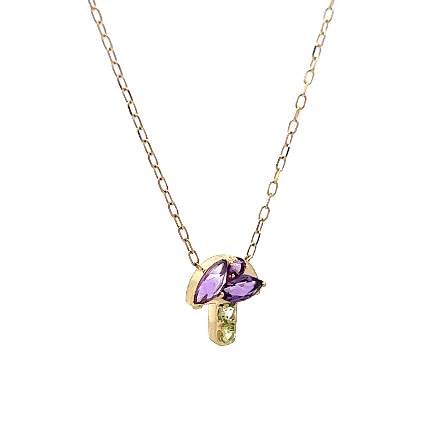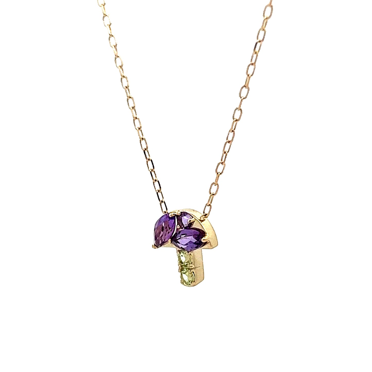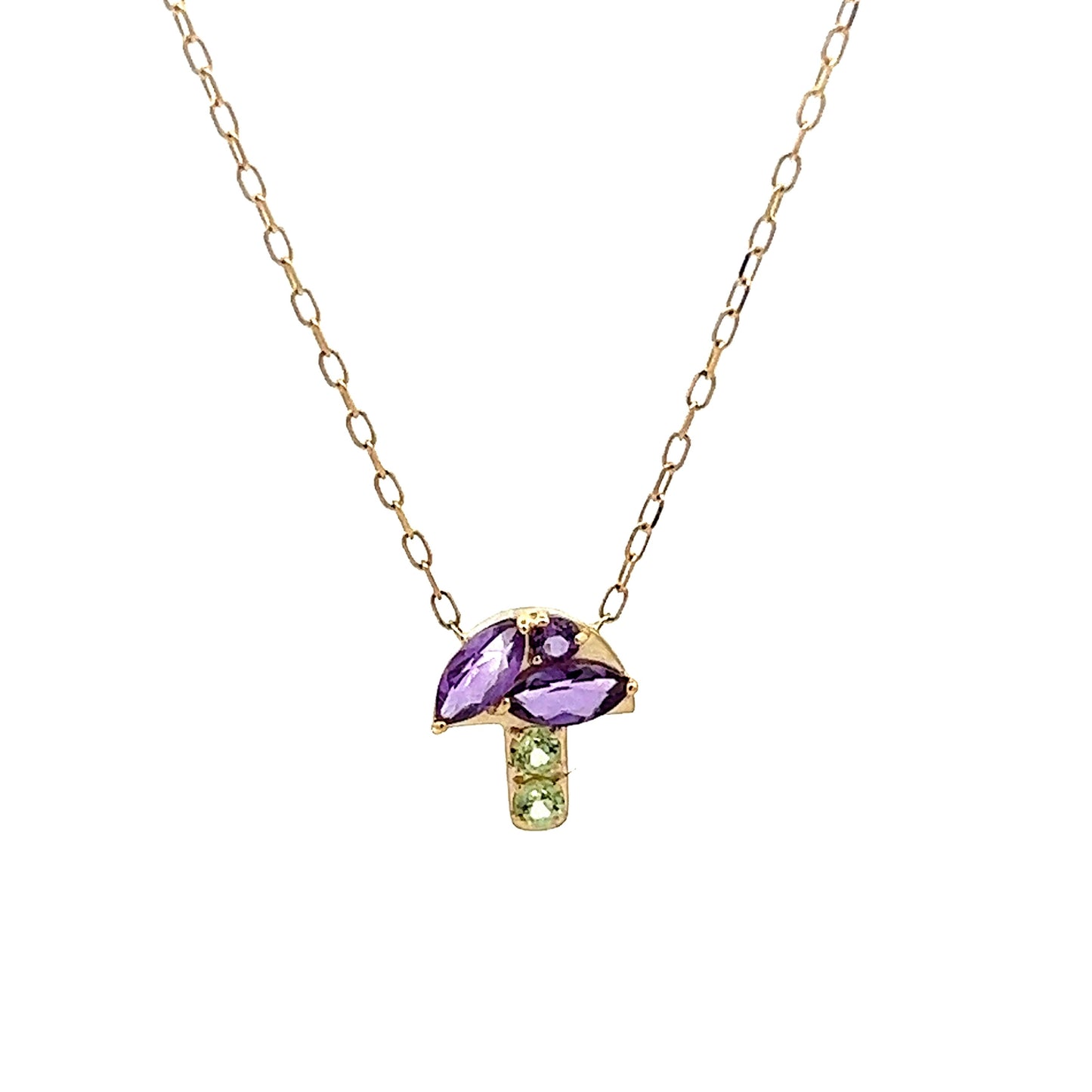 This modern and stackable pendant is crafted in 14 karat yellow gold. It features lovely marquise-shaped amethysts weighing .30 carats with three accent stones - two lemon quartz weighing .04 carats, and an additional amethyst. The mushroom-shaped pendant has a romantic and chic touch, perfect for any style of wardrobe.