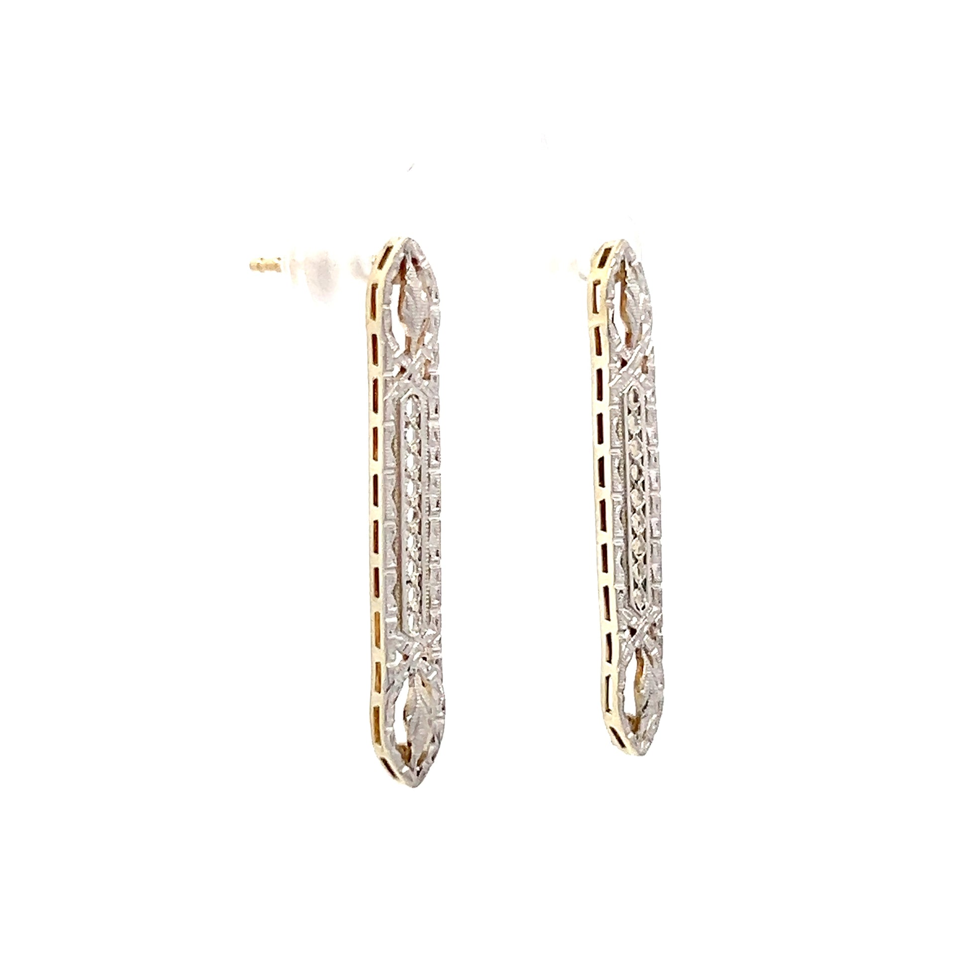 These Art Deco era drop earrings feature intricate filigree metalwork in a distinctive two-tone design combining 14 karat yellow gold and white gold. Originally lingerie clips from the Art Deco period, they've been thoughtfully converted to earrings with secure post backs that provide comfortable wearability. The contrasting metals create visual dimension and highlight the detailed filigree patterns that showcase the era's appreciation for geometric precision and decorative detail.