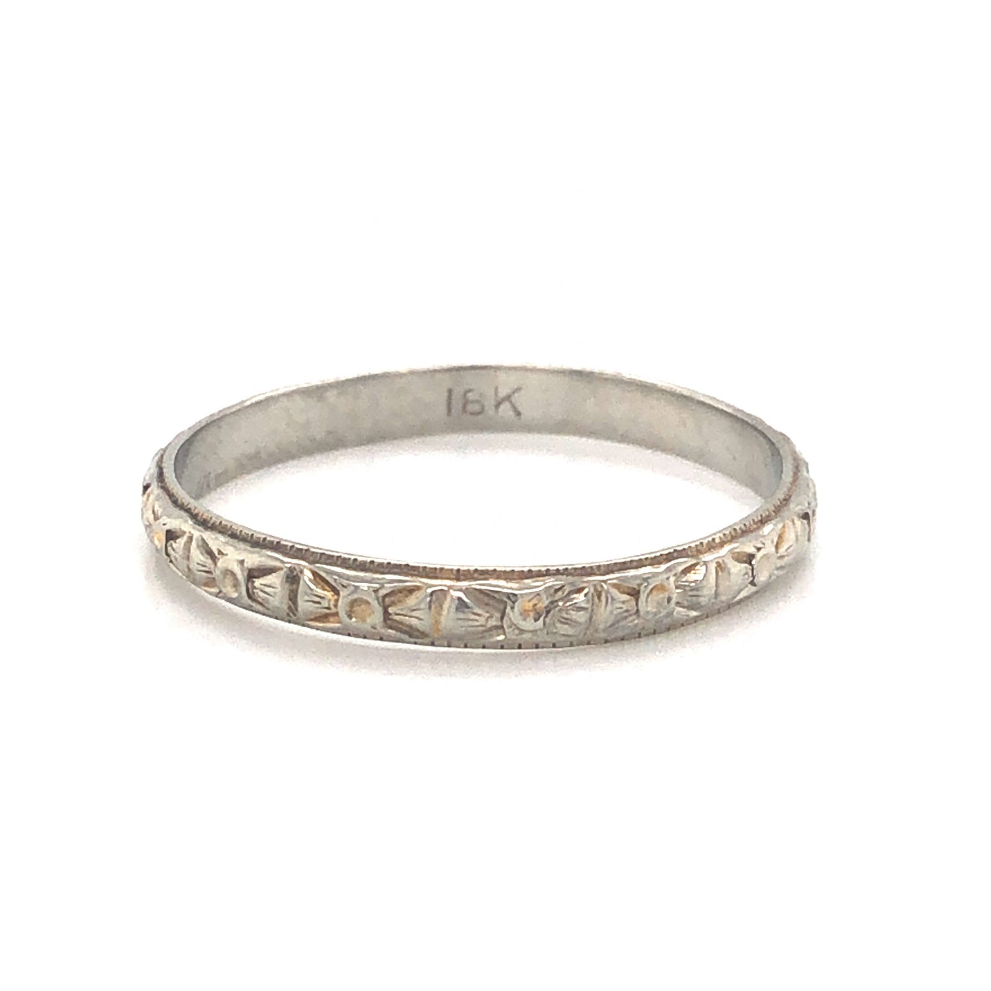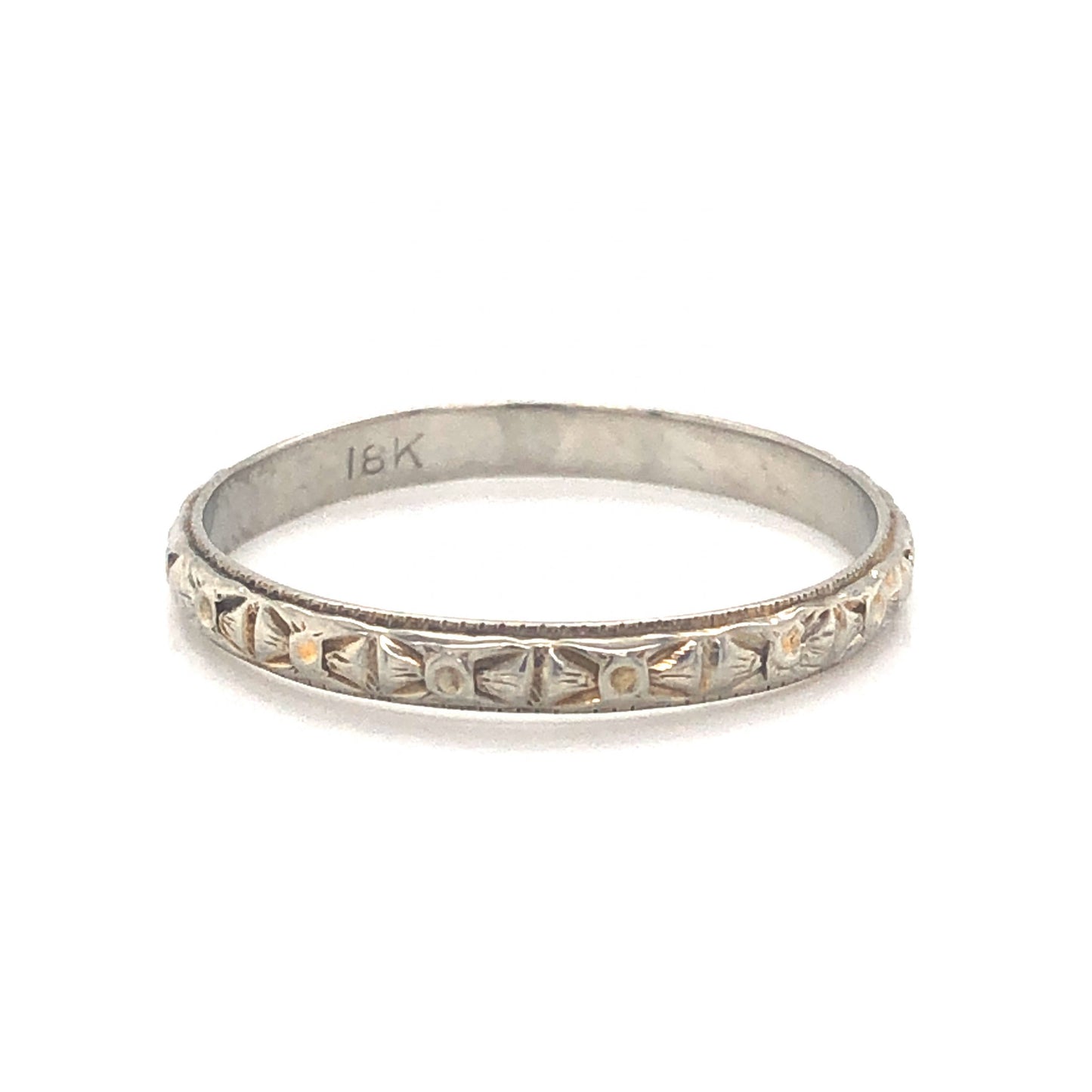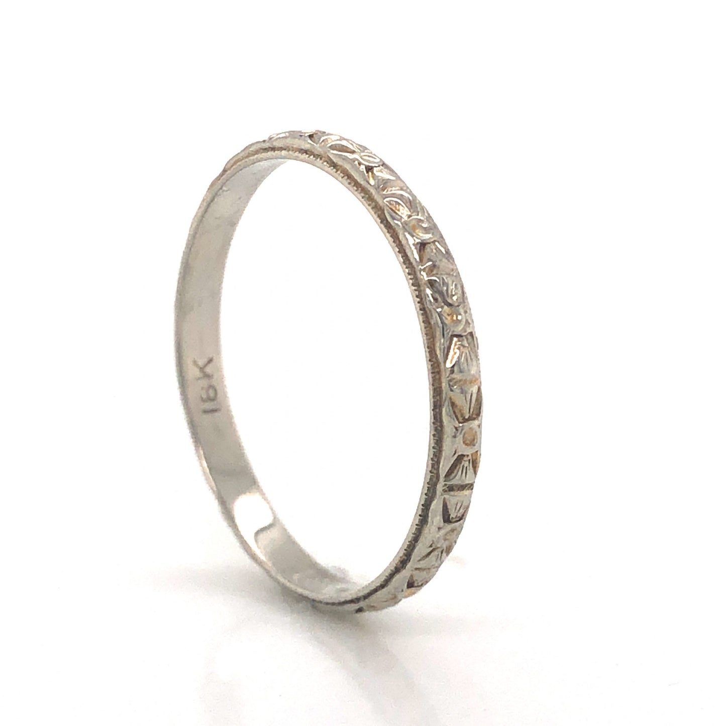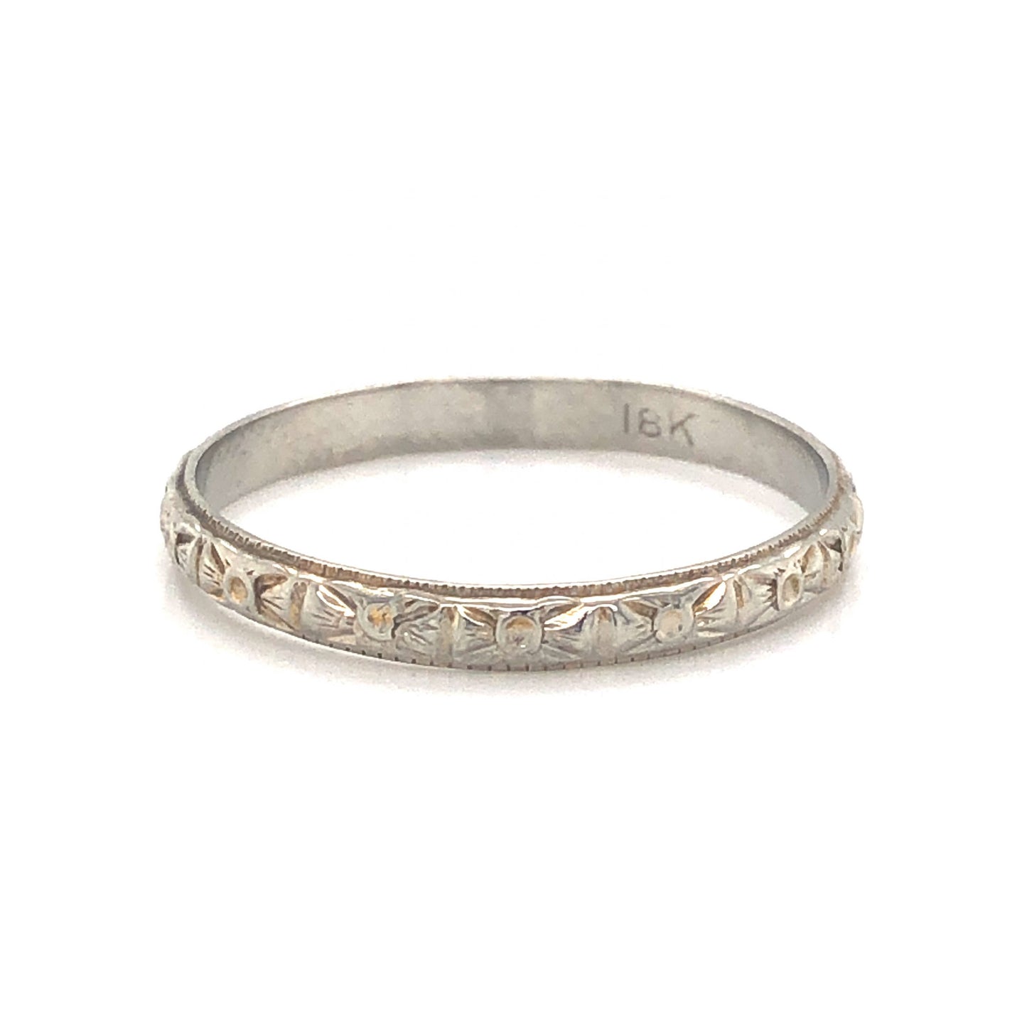 This exquisite Art Deco wedding band features artful orange blossom engravings in polished 18 karat white gold. An iconic design from the golden era of jewelry making, this engraved wedding band is comfortable to wear and easy to style in a right hand stack. Dimensional and geometric, this ring would make a lovely pair with an Art Deco engagement ring.