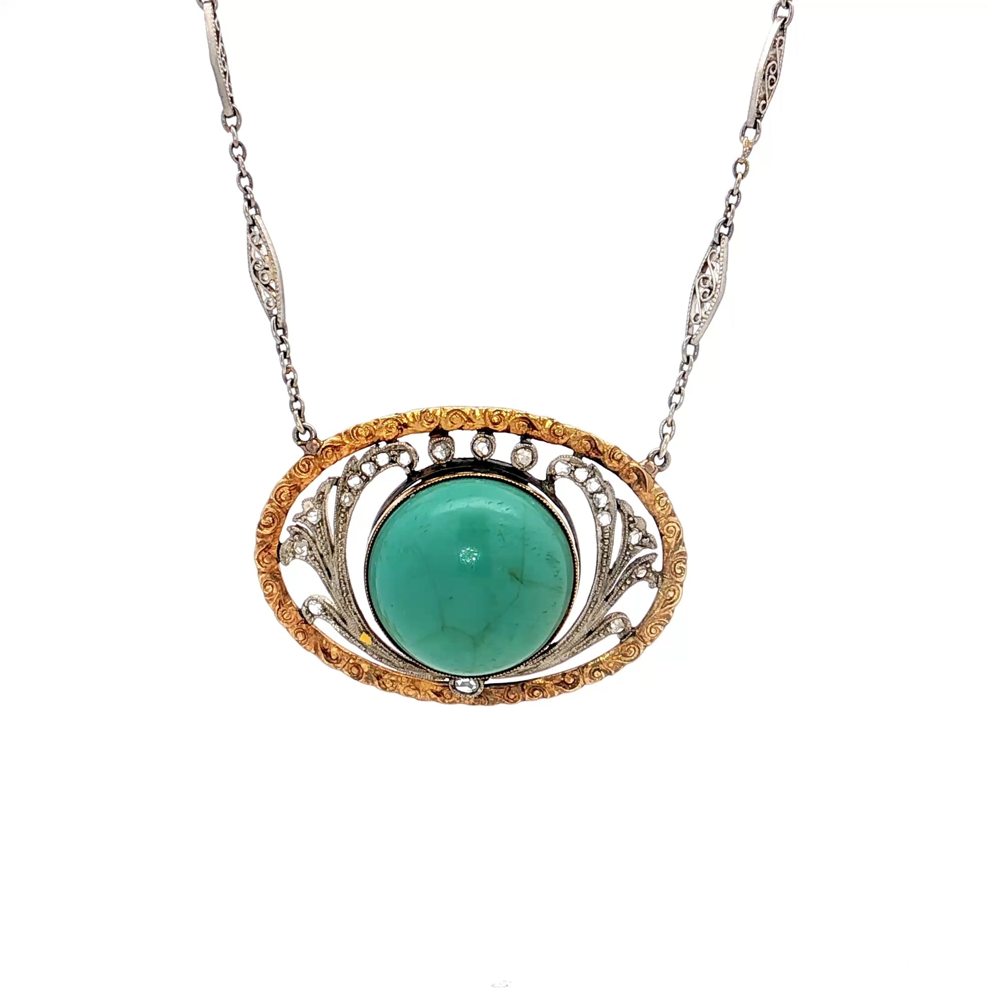 This Edwardian era pendant necklace features an 11.04 carat oval cabochon cut turquoise measuring 15.21 x 15.15 x 6.57mm in a bezel setting, surrounded by a yellow gold filigree border and made from 14 karat white gold and 18 karat yellow gold. Four natural diamonds with H/I color and VS2-SI1 clarity, each measuring 1.8mm and weighing .0125 carats, add sparkle to the design for a total diamond weight of .05 carats. The geometric chain measures 16 inches in length and complements the pendant's two-tone metal construction.