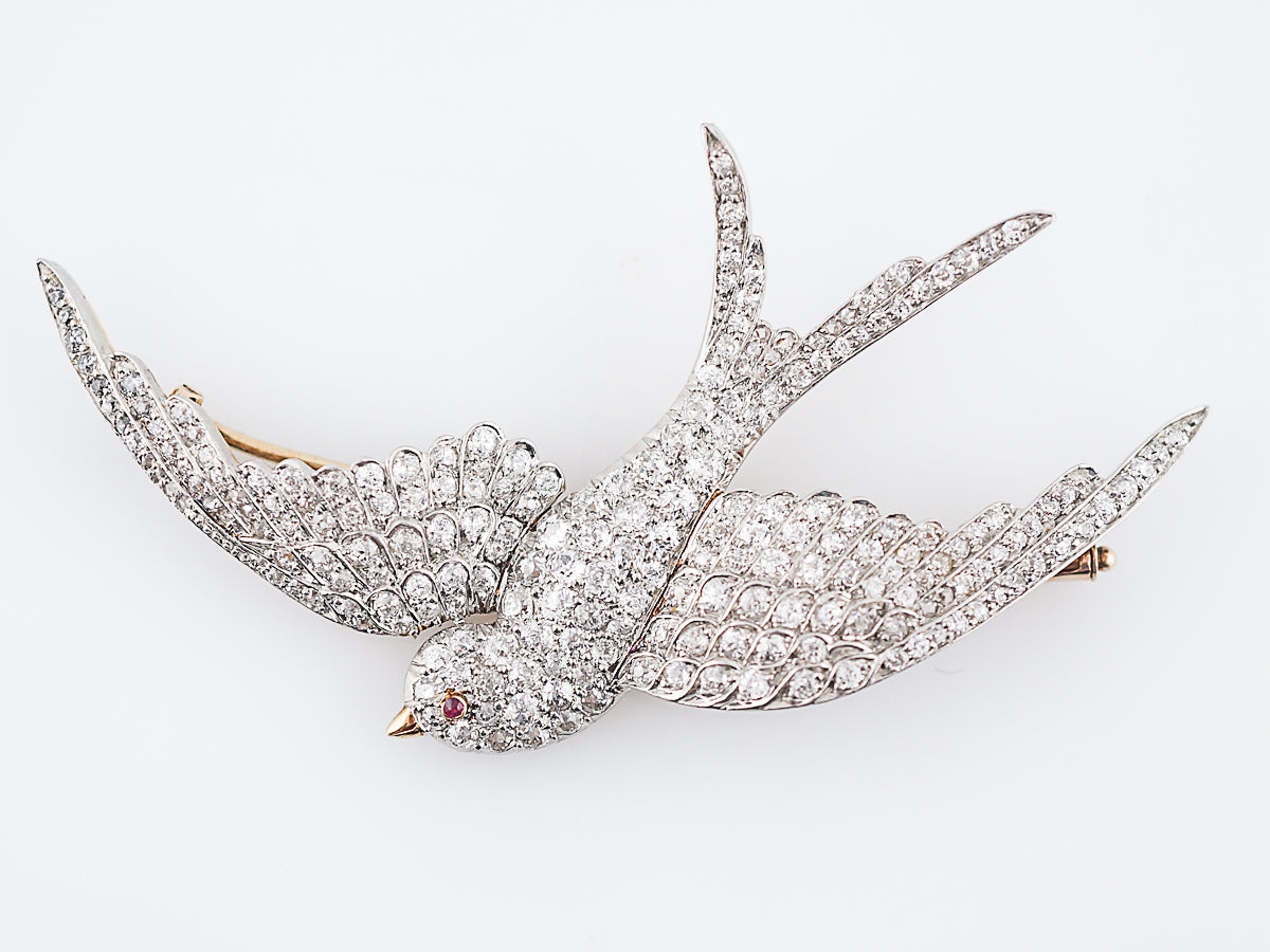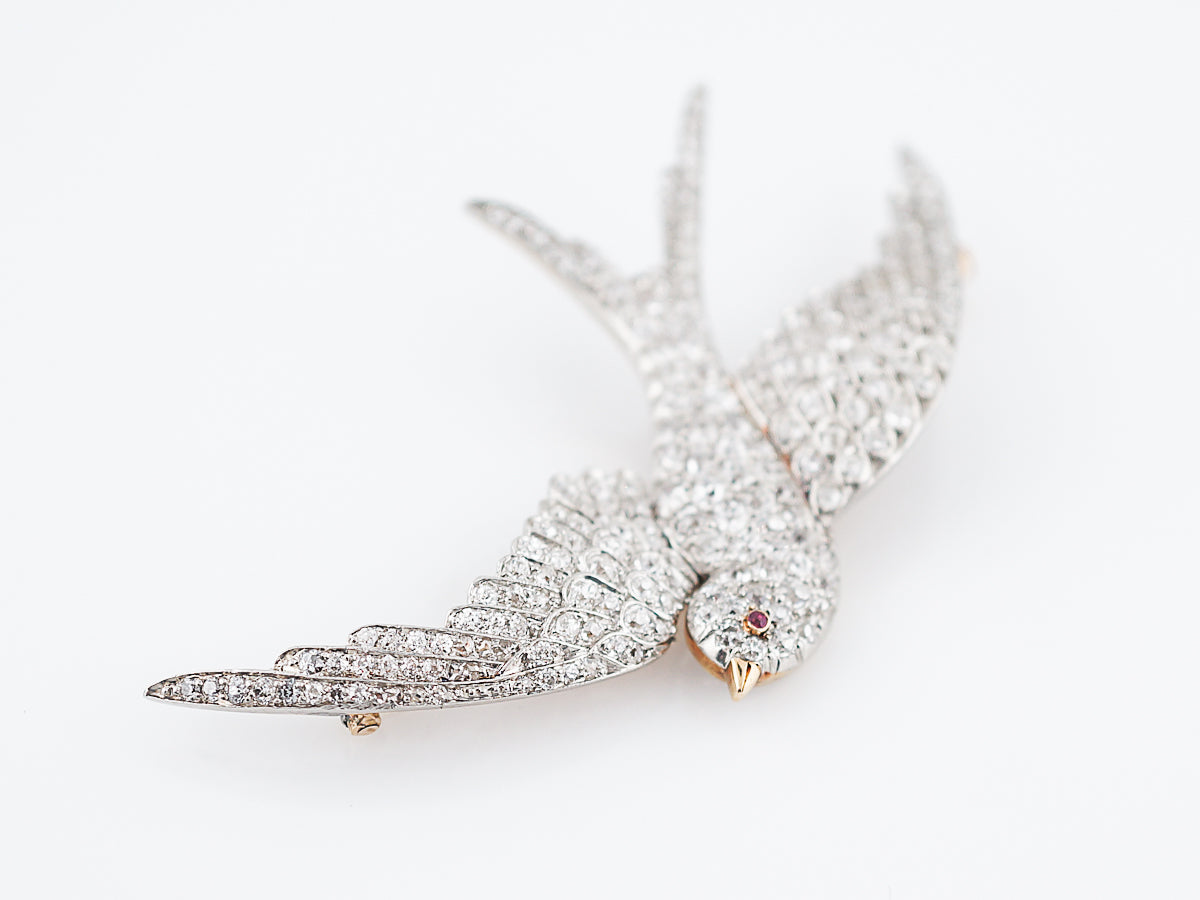 The craftsmanship of this Antique Edwardian Era bird brooch makes this piece look like it might just take off. Two hundred and sixteen (216) Old European Cut diamonds are pave set, covering the bird except for a small ruby accent as the eye, and a high polished yellow gold beak. Made in platinum and 18 karat yellow gold, this piece would be a stunning accent to a scarf or jacket.