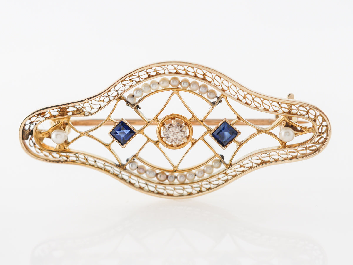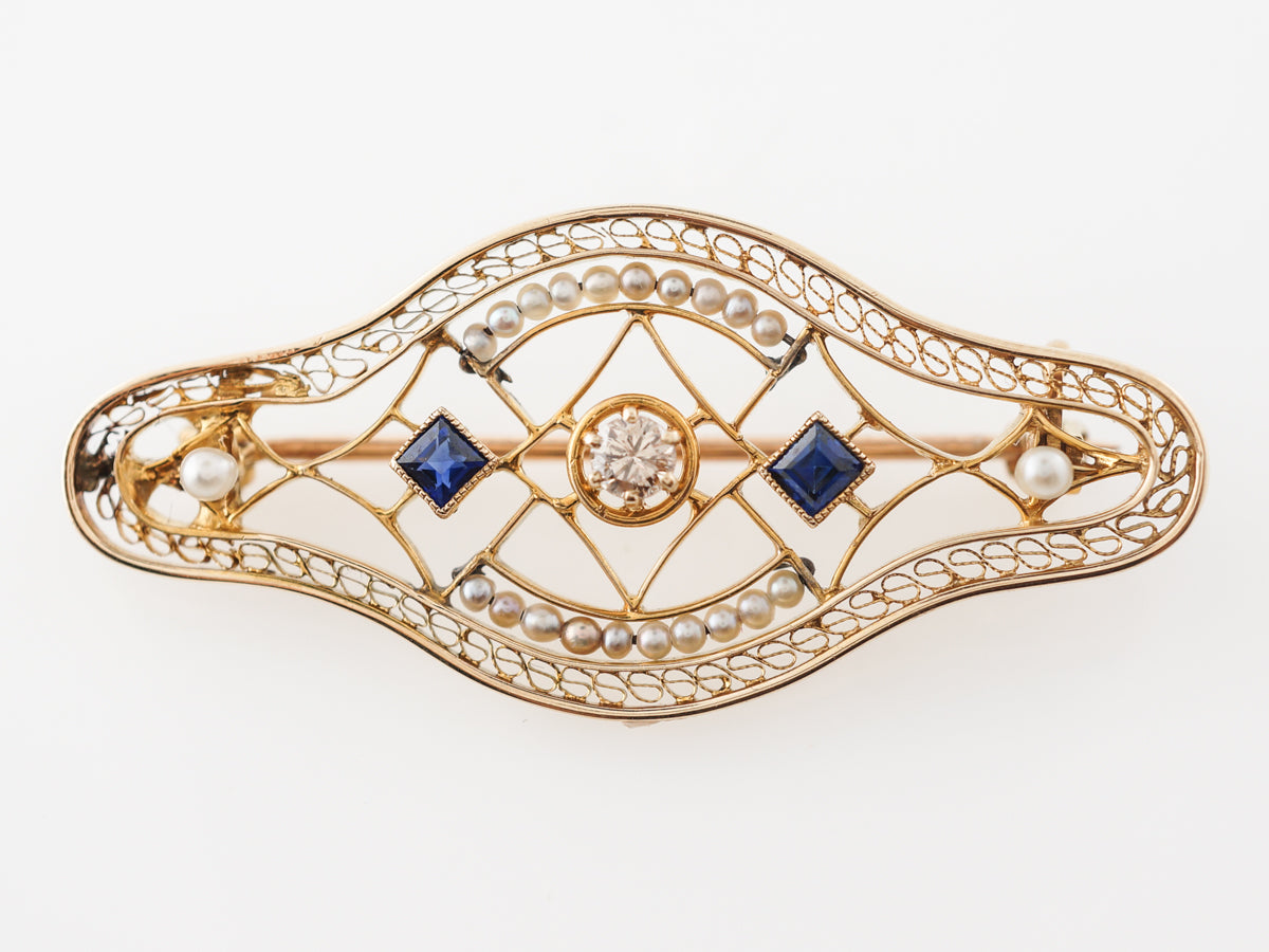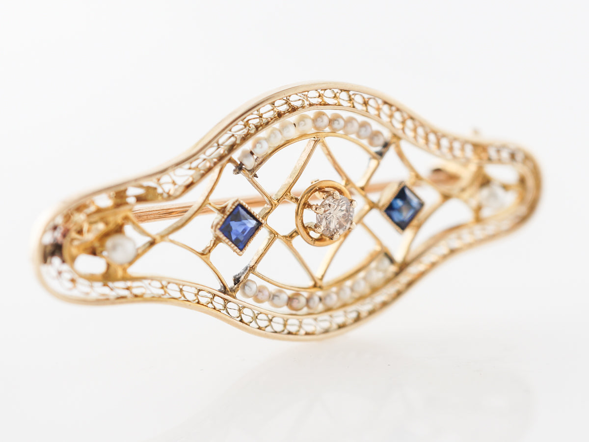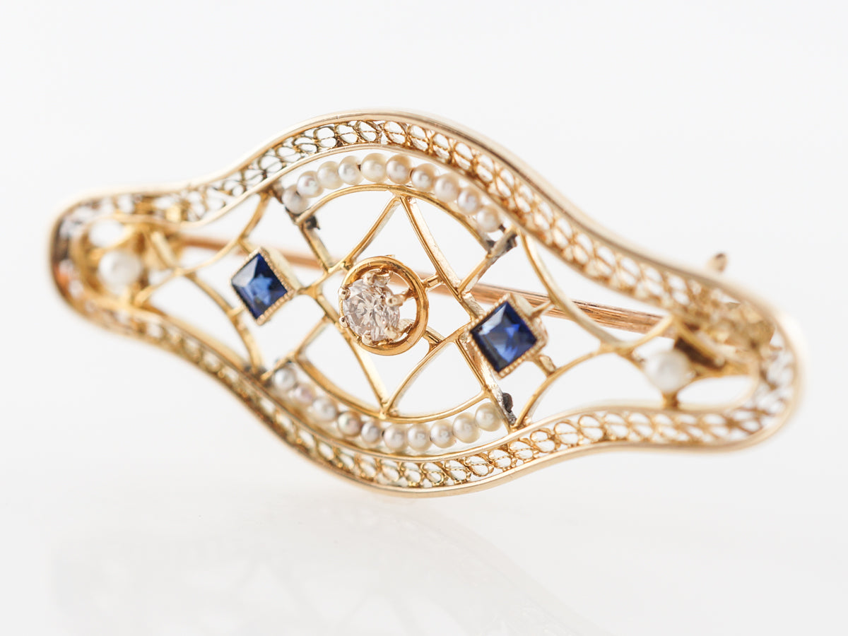 Antique Brooch Art Deco .11 Carats of Diamonds in 14k Yellow. This original Art Deco brooch features diamonds, sapphires, and pearls finished in 14 karat yellow gold. The fine detail upon close inspection of this brooch is amazing. At the center is a .11 carat old European cut diamond and surrounding it are two curved rows of seed pearls and two single cut sapphires. The milgrain detail on the ribbon of gold between the outside border is remarkable.