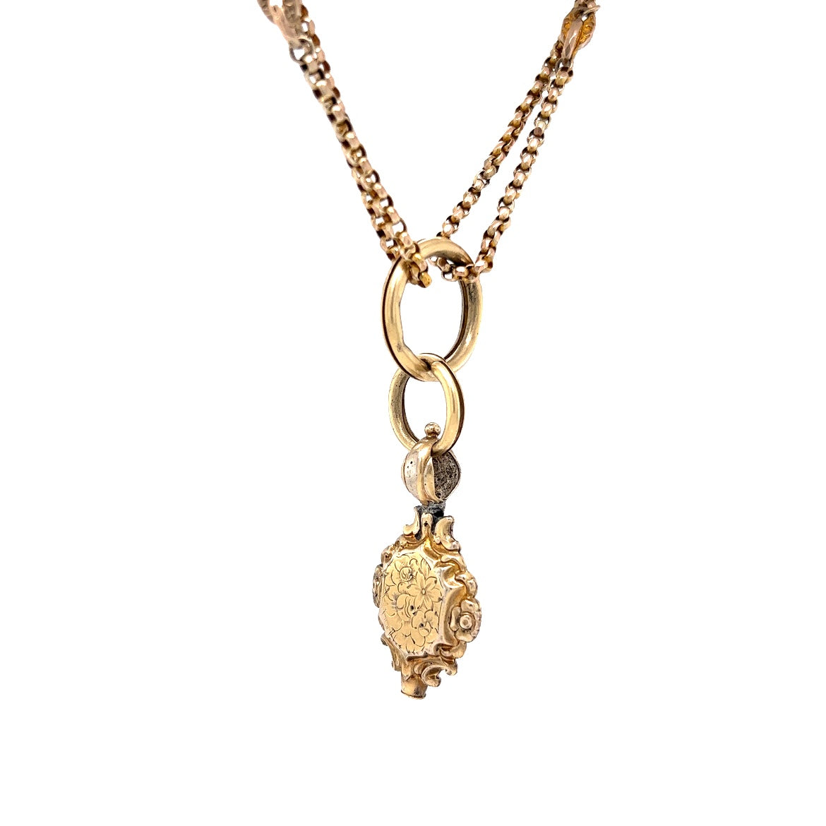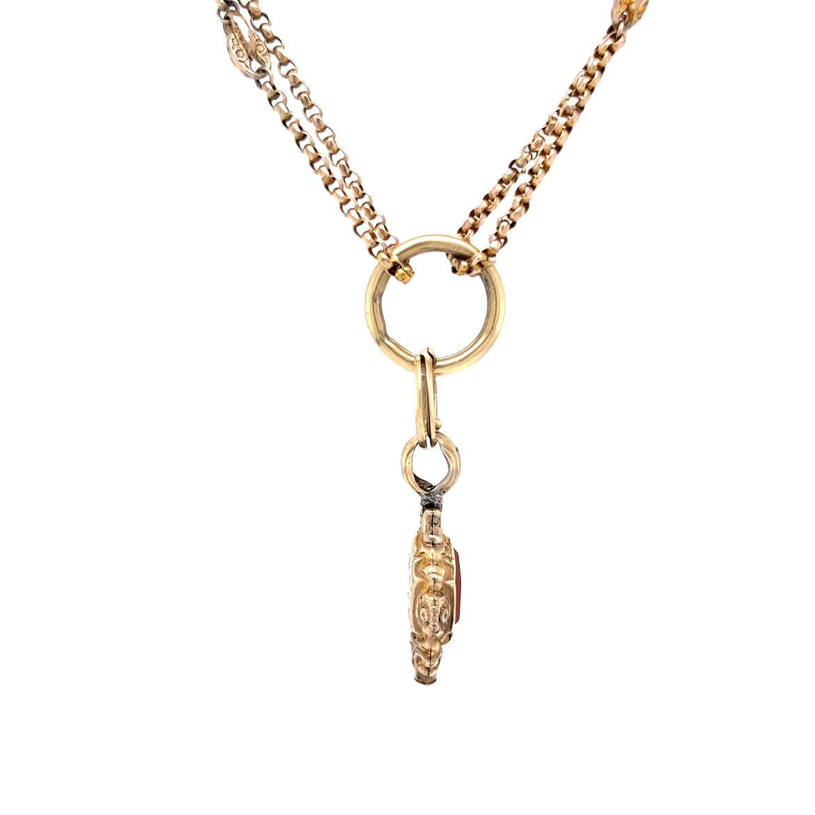 This chic antique chain necklace features a red carnelian gemstone in 10 karat yellow gold. The picturesque pendant holds the unique gemstone charm. Finished on a radiant 22 inch cable chain. A great necklace to elevate your look!