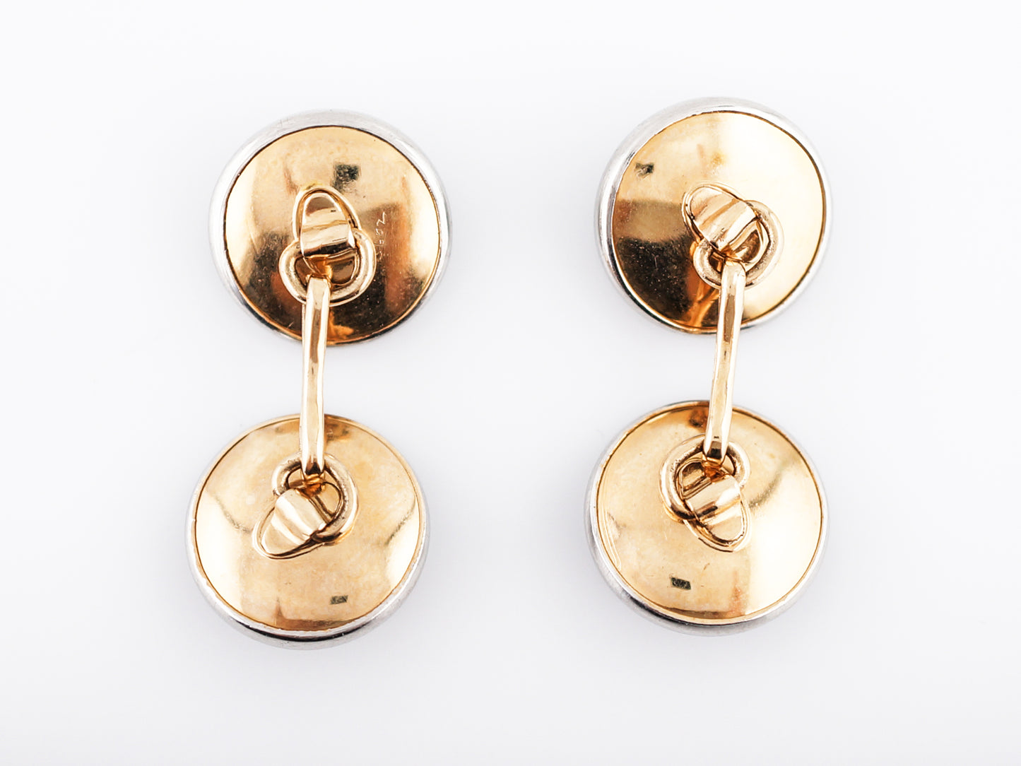 This antique cufflink and stud set was made in the Art Deco era. The black discs are made with onyx and each have a round pearl in their center. The outer edge of each disc has a 14k white gold border with striations in the metal. The rest of the metal is 14 yellow gold so there is a lovely contrast when you see the yellow gold peek out from the underside. This original antique cufflink and stud set would be an elegant finishing touch to a tuxedo or suit.