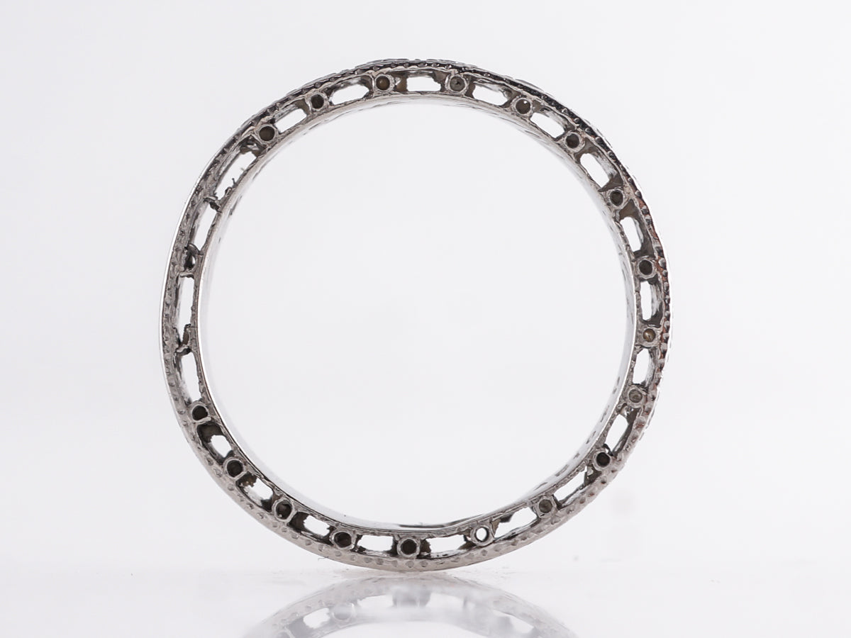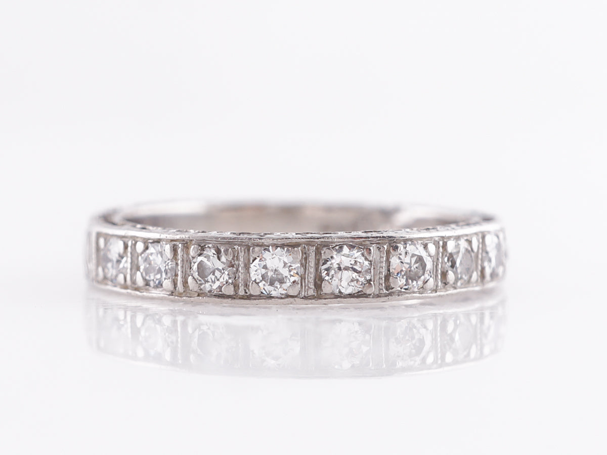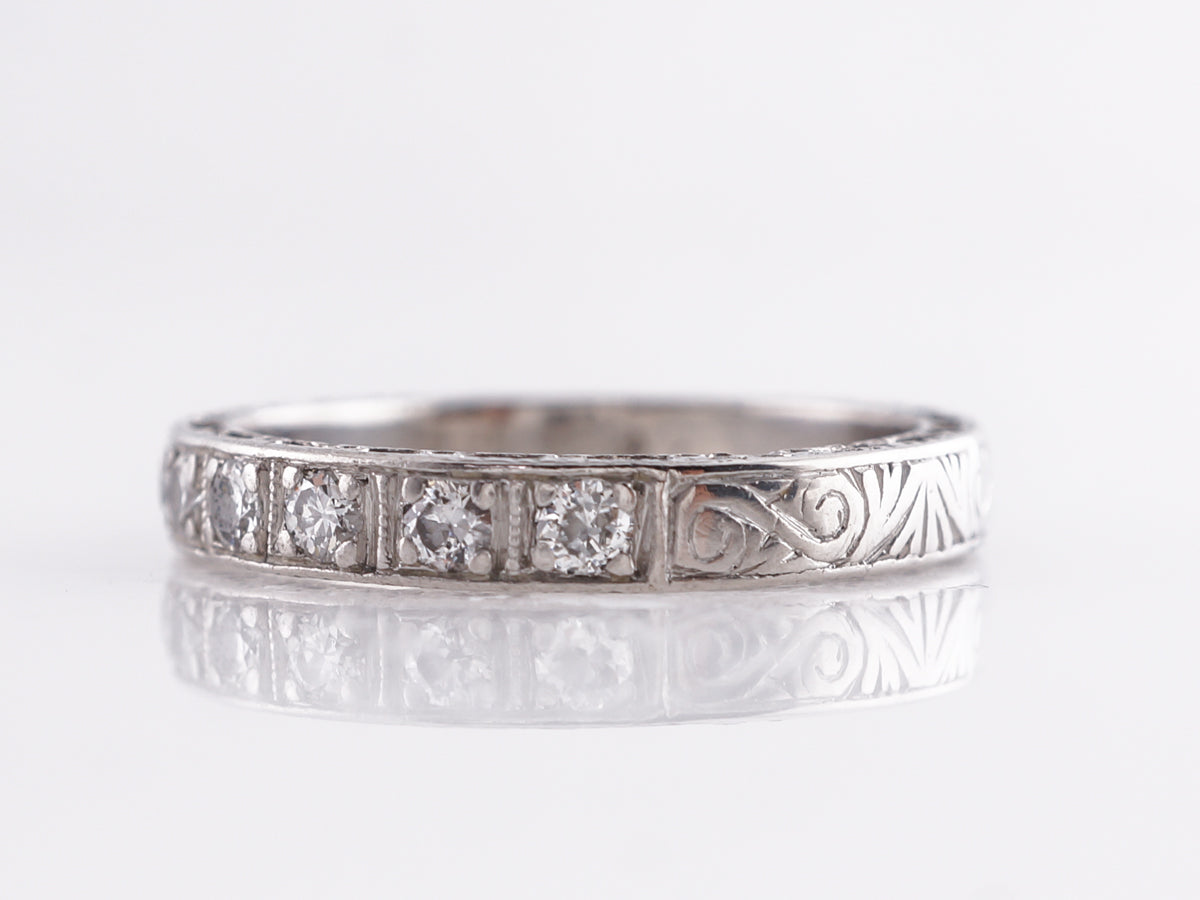 Antique Deco Wedding Band w/ Diamonds Engraving in Platinum. This original antique Art Deco diamond band is set with antique cut round diamonds. The eleven (11) diamonds are bead set in platinum across the bridge of the finger. The diamonds also feature a decorative square stations adding to the design. The shank of the band is engraved with a scrolling pattern. A unique aspect of this Art Deco band is the open gallery not often seen in vintage diamond wedding bands. The total diamond weight is .22 carats.