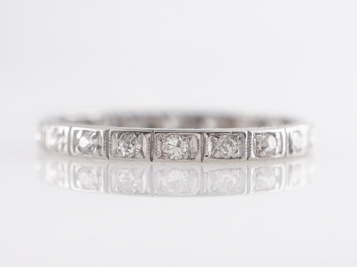 Antique Diamond Engraved Wedding Band in 18k White Gold. This Art Deco wedding band features .05 carats of single cut diamonds and is set in 18 karat white gold. The diamonds are enhanced by milgrain borders in the square sections where they sit, with the bottom half of the shank being a polished knife edge. This would be a amazing addition to any vintage engagement ring!