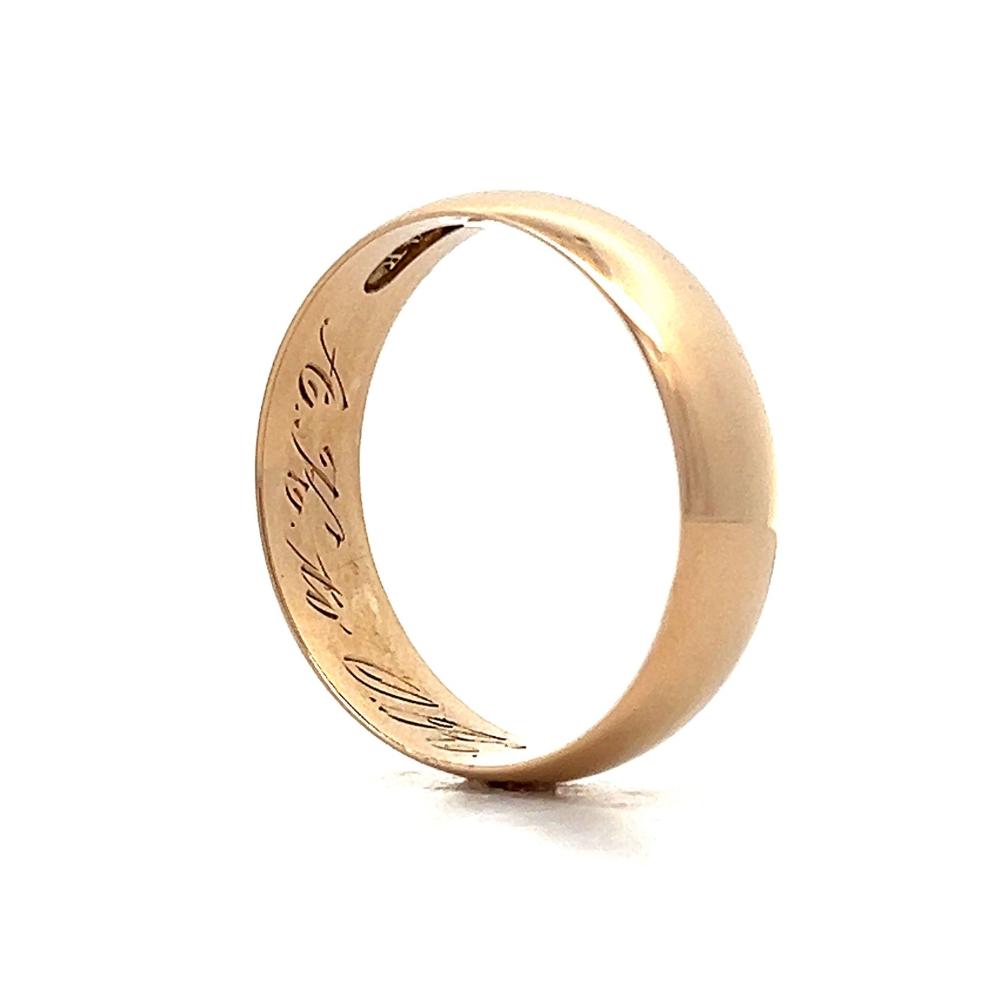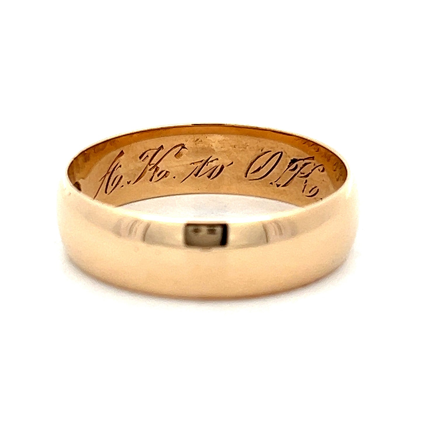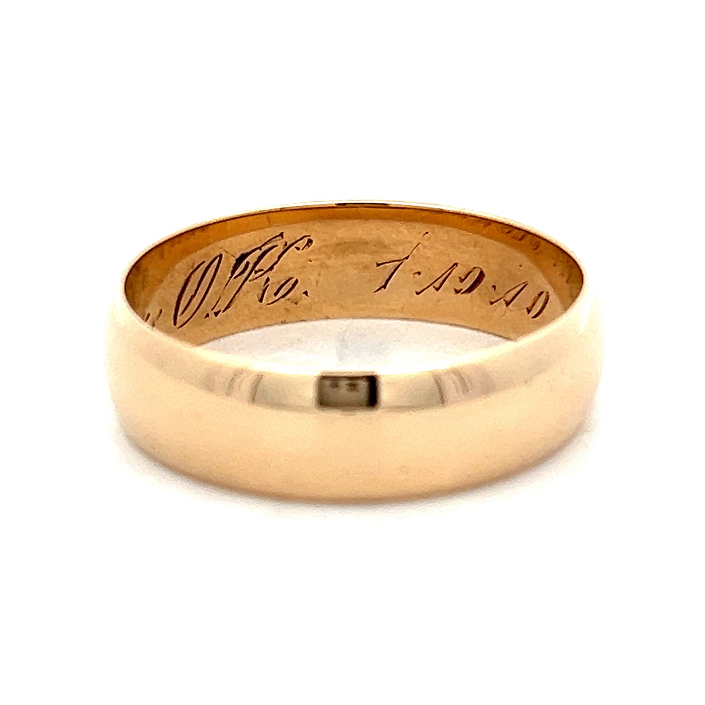 This antique Edwardian men's wedding band, crafted in 14 karat yellow gold measures 6.5 mm in width. A unique feature of this band is its original interior engraving, "A.K. to O.K. 7-12-10," adding a personal touch that reflects a story from the past.