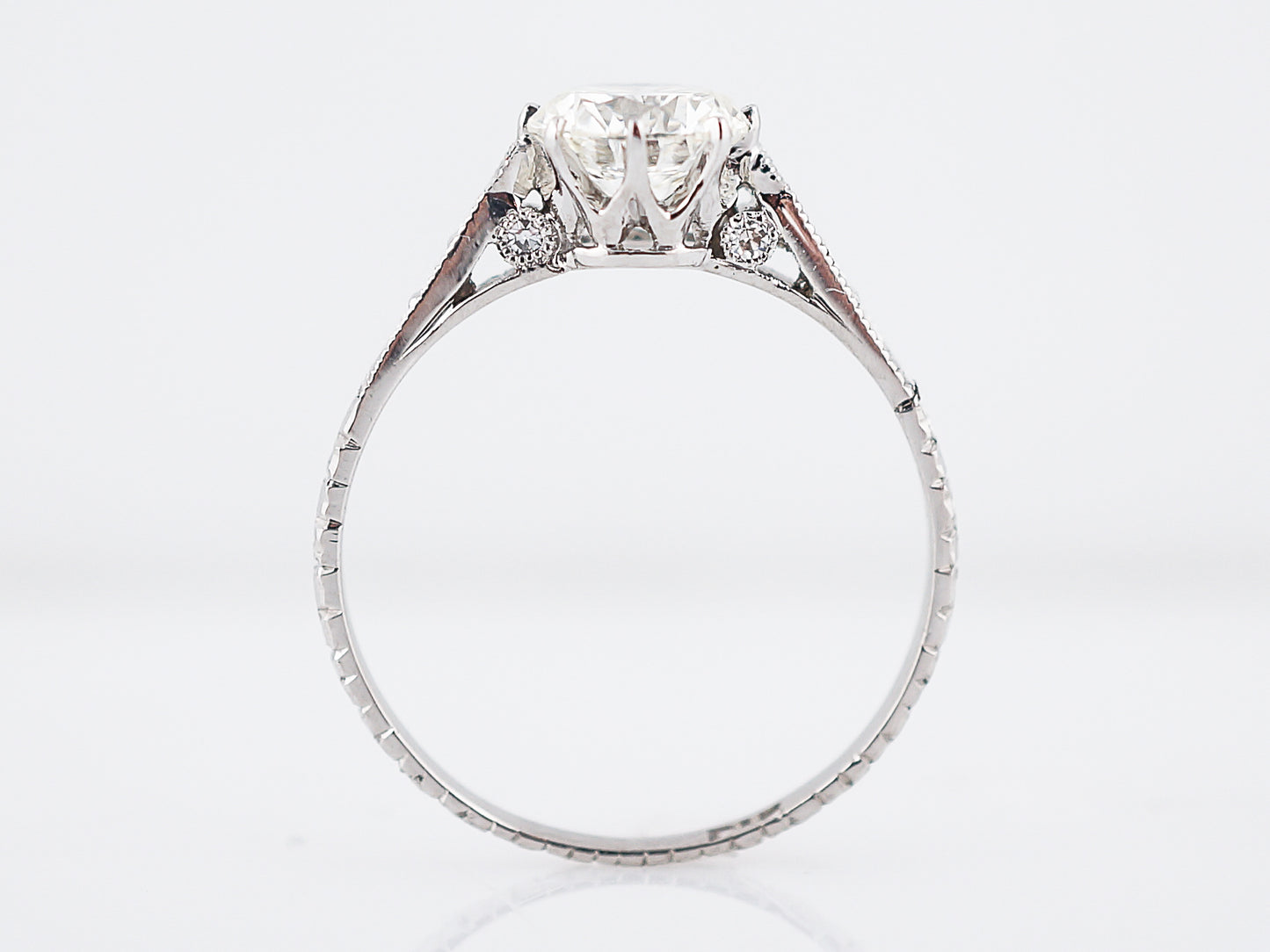 A 1.08 carat round brilliant cut diamond sits in the center of the delicate art deco ring. Hidden on each side of the ring are two bezel set round diamonds each .01 carats in size. With a finishing touch of tapering side stones and milgrain detail, this ring has a style that wont fade with time.