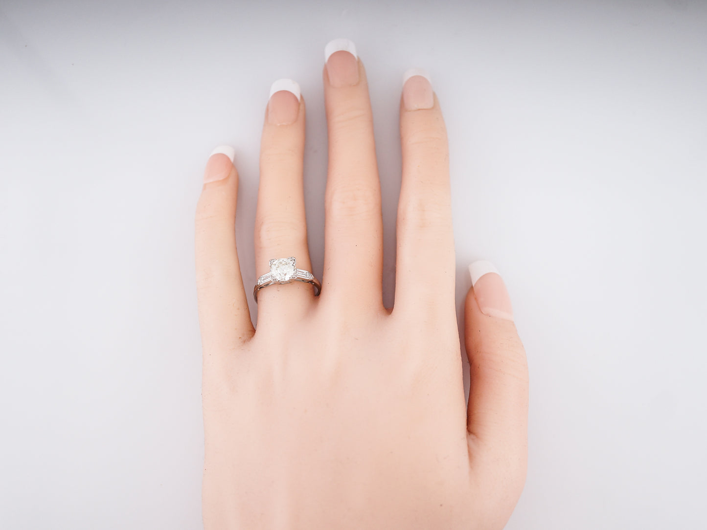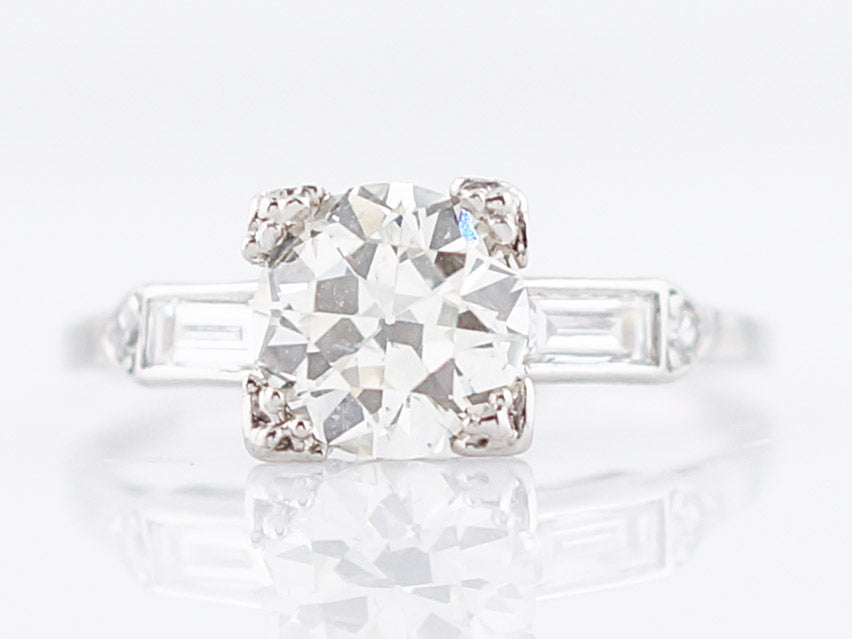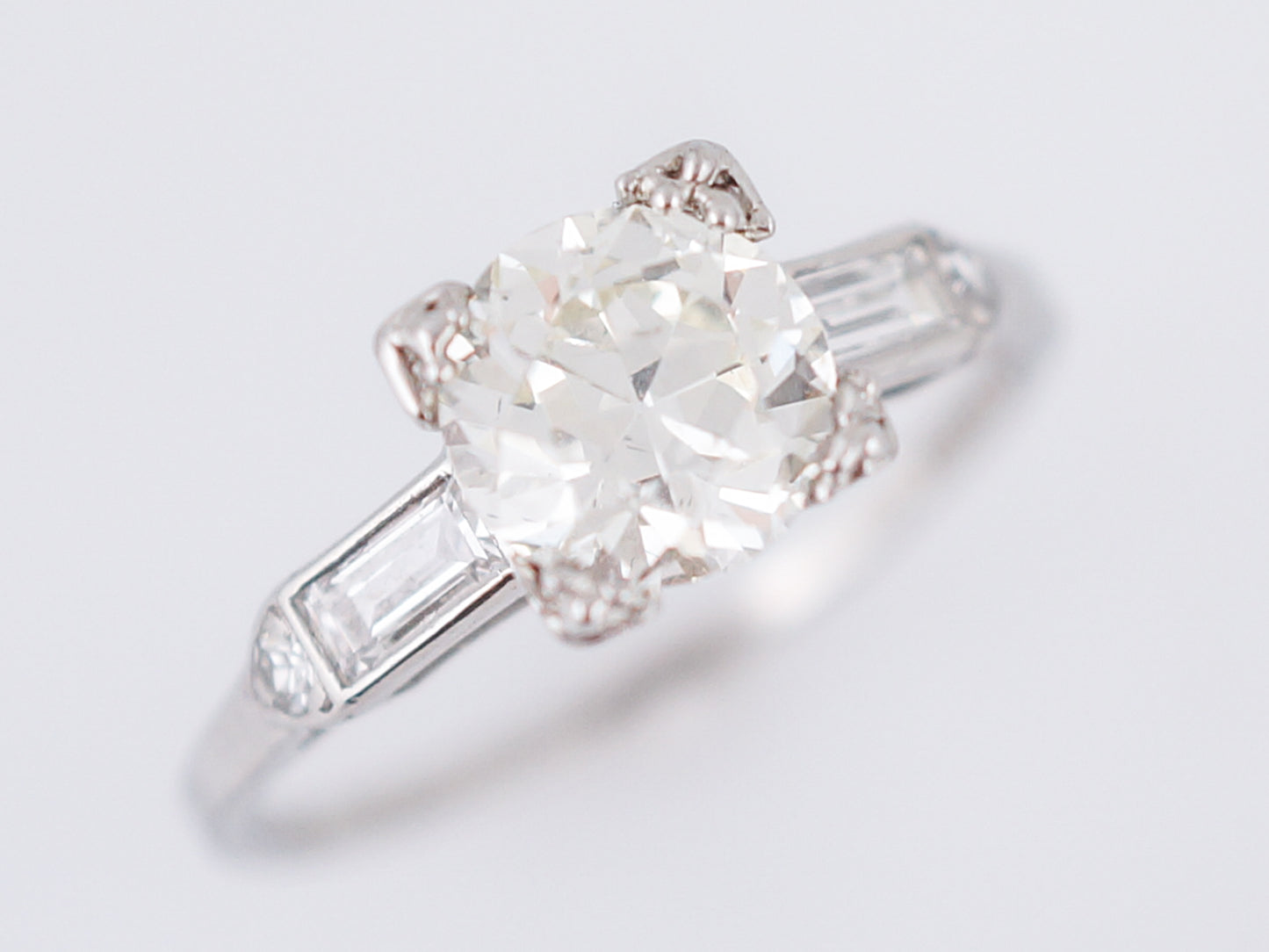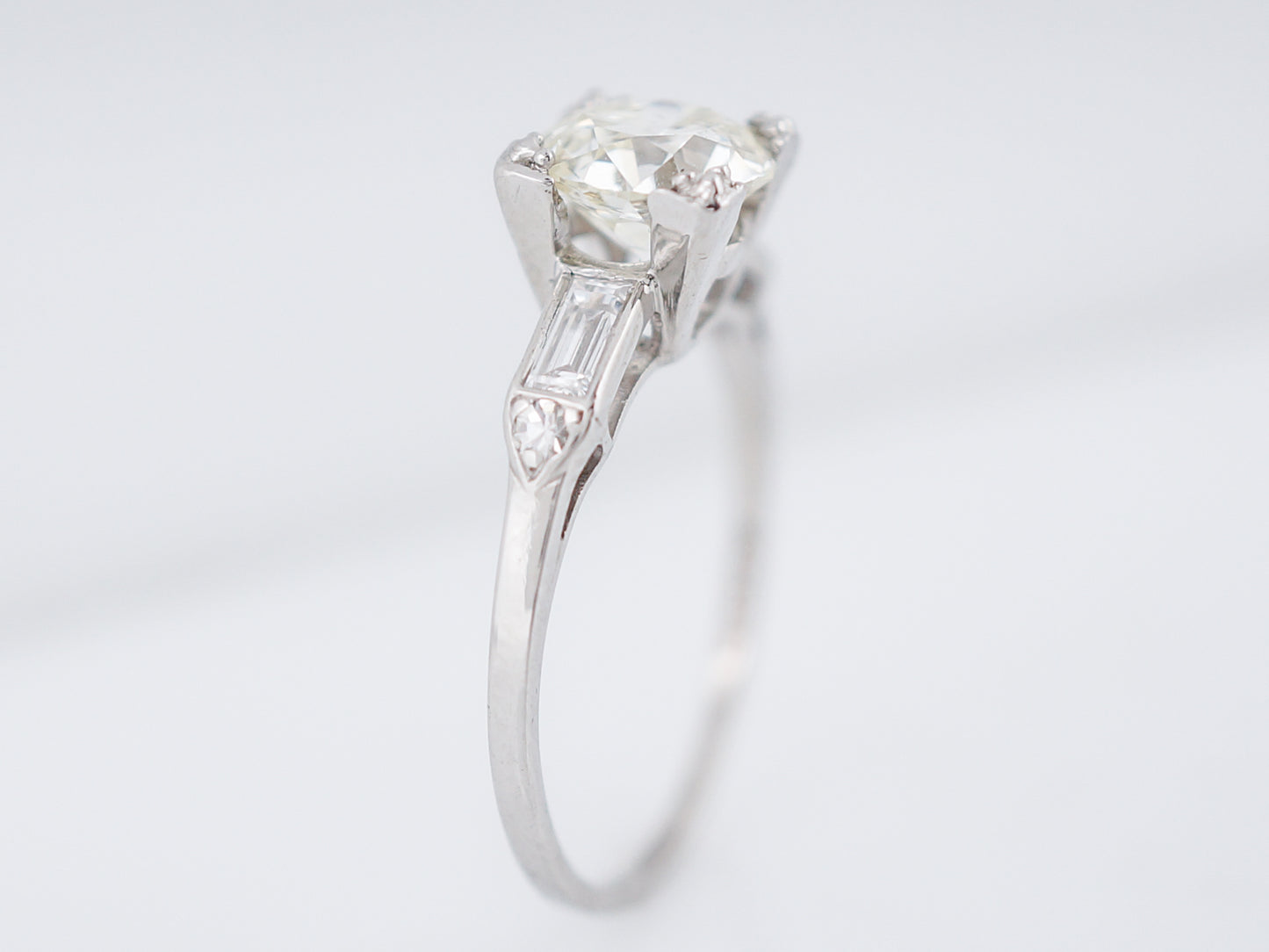 This Art Deco era engagement ring is a bit more simple than many of our other rings from this era, but it just shows how gorgeous something a little more understated can be. Sparkling from all angles, a 1.26 carat Old European Cut diamond is box set in the center and is flanked by two (2) channel set baguette cut diamonds and a single prong set round diamond. Cast in platinum, this ring is another stunning example of the wide variety of rings from the Art Deco Era.