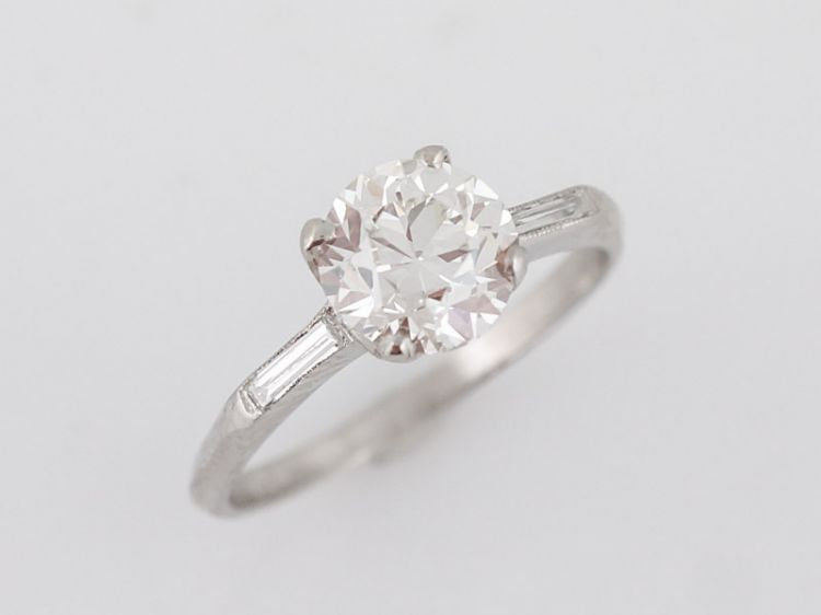 This stunning original Art Deco engagement ring is beautifully crafted in brightly polished platinum. At its center sits a four prong set 1.34 carat old European cut diamond. The open basket allows light to dazzle and radiate out of the stone. To each side, a bar set baguette cut diamond adds sparkle to each of the rings shoulders.