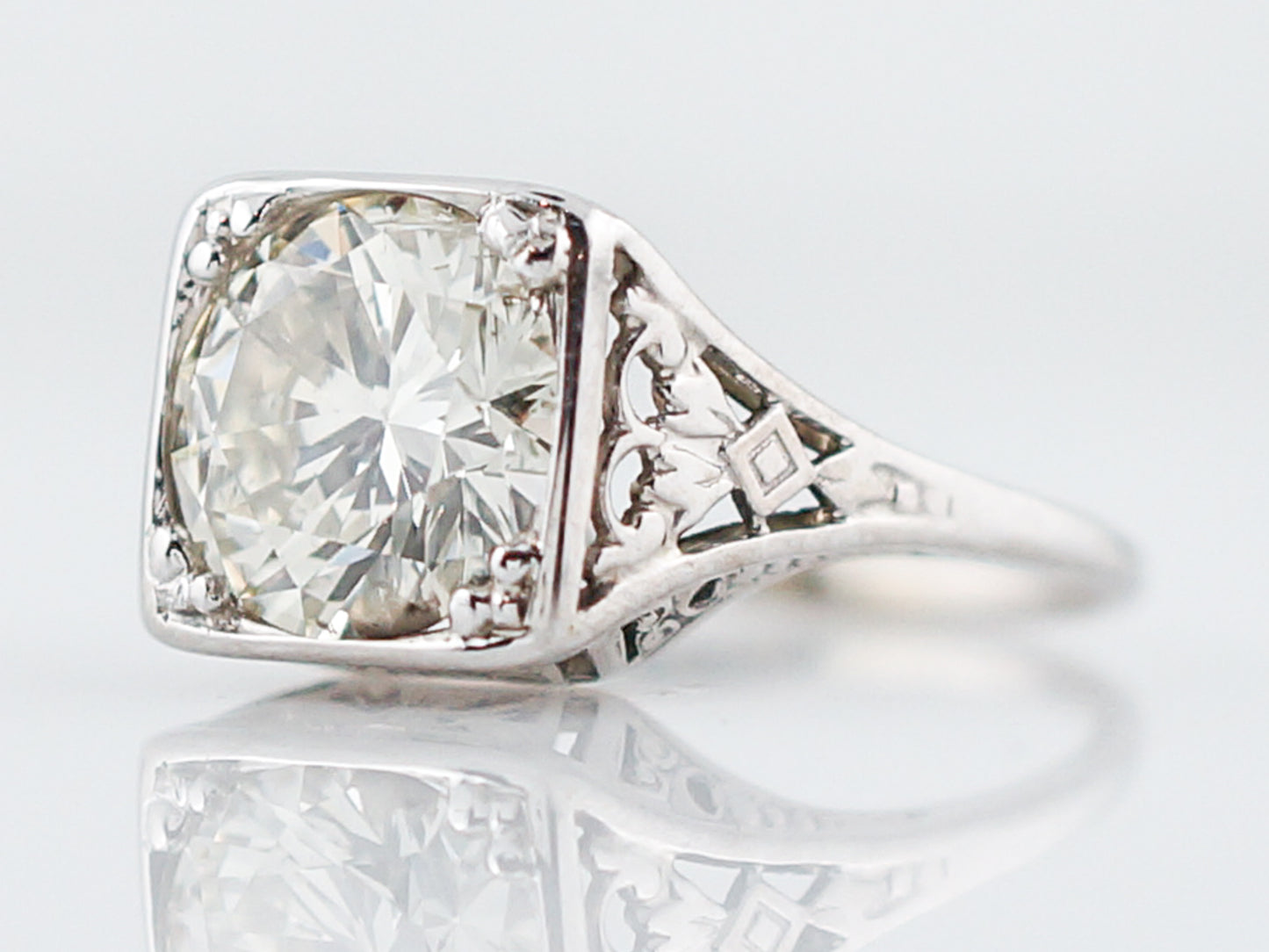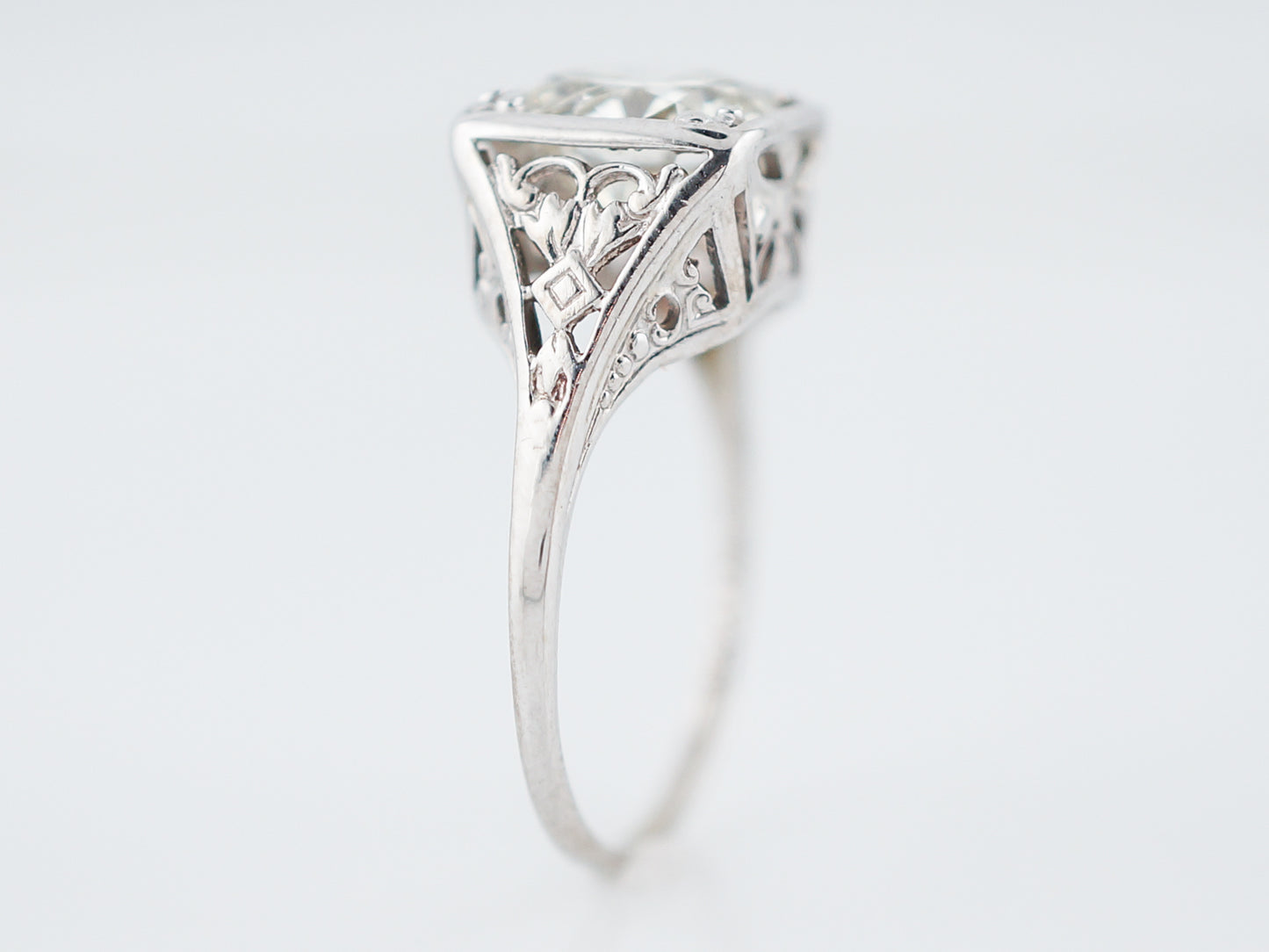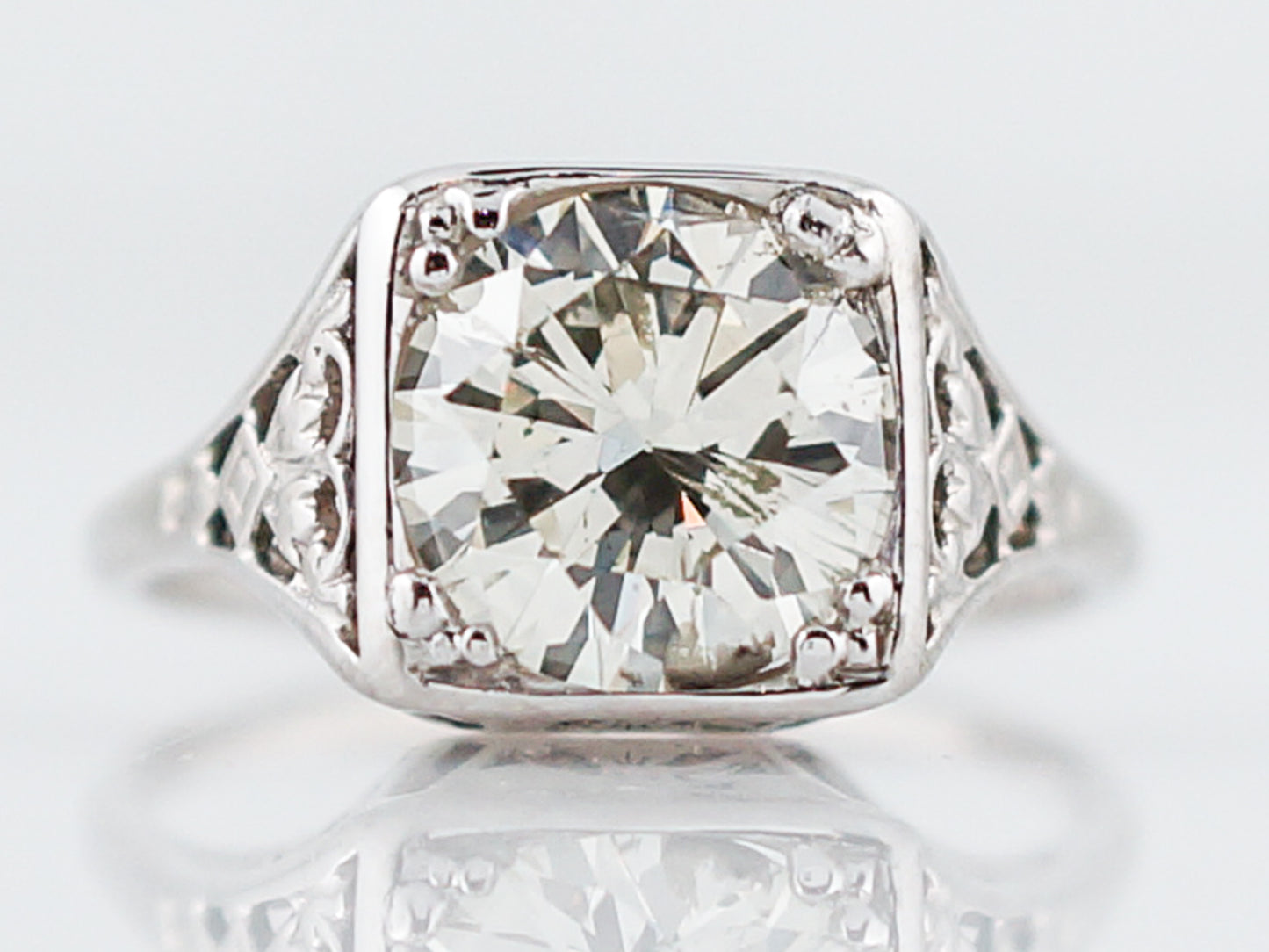 This antique engagement ring was made in the Art Deco era. This ring has a 1.84 carat round brilliant cut diamond as its focal point. The substantial sized diamond is prong set into a square shaped bezel. The 14k white gold setting has beautiful openwork on the shoulders of the ring as well as on the top and bottom so you can see it from every angle. The detailed shoulders taper to a high polish band as it wraps around the finger.