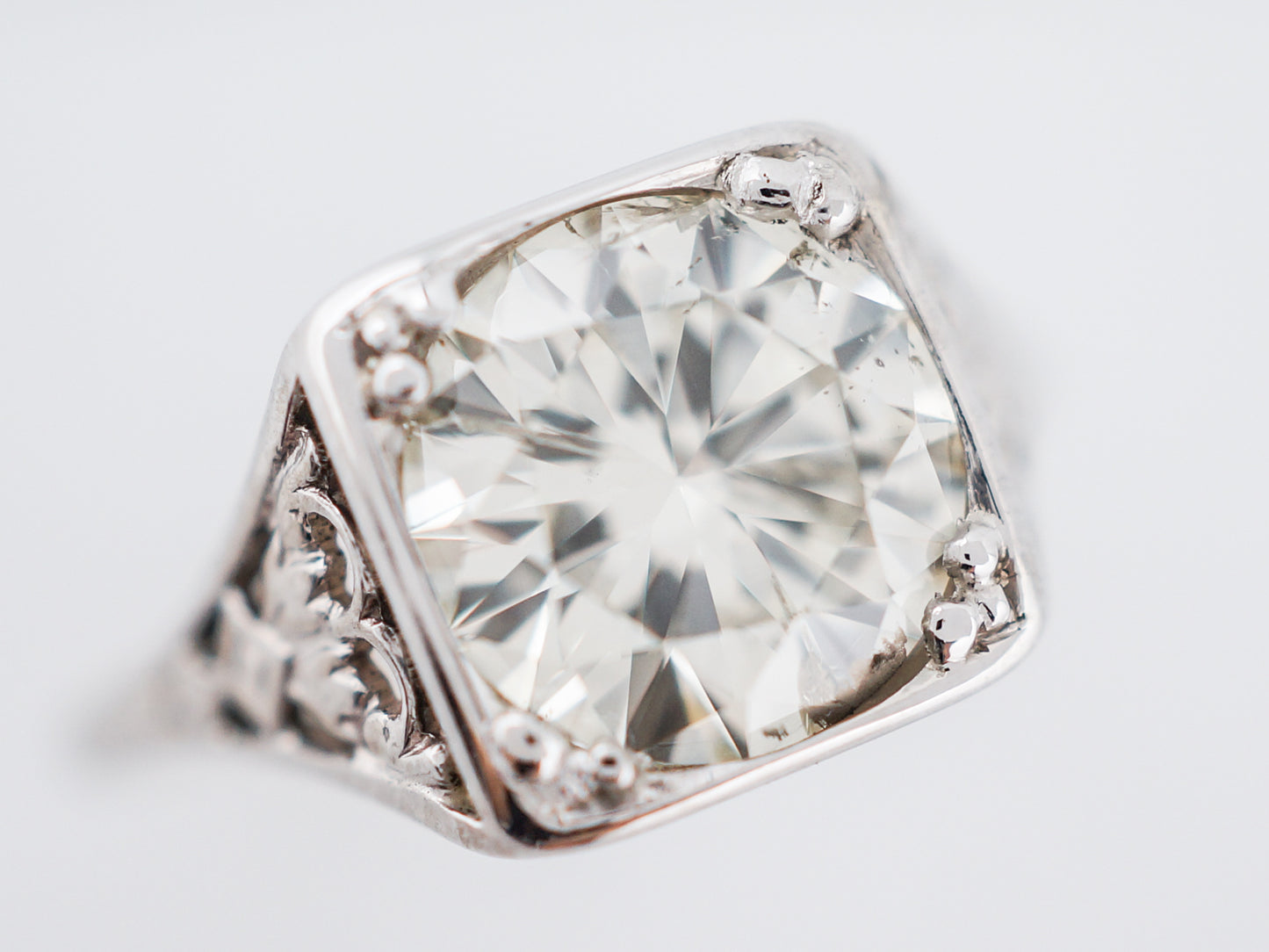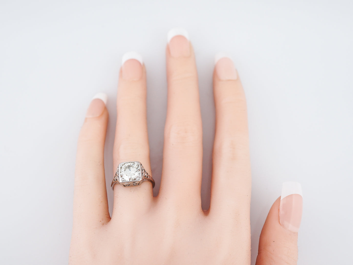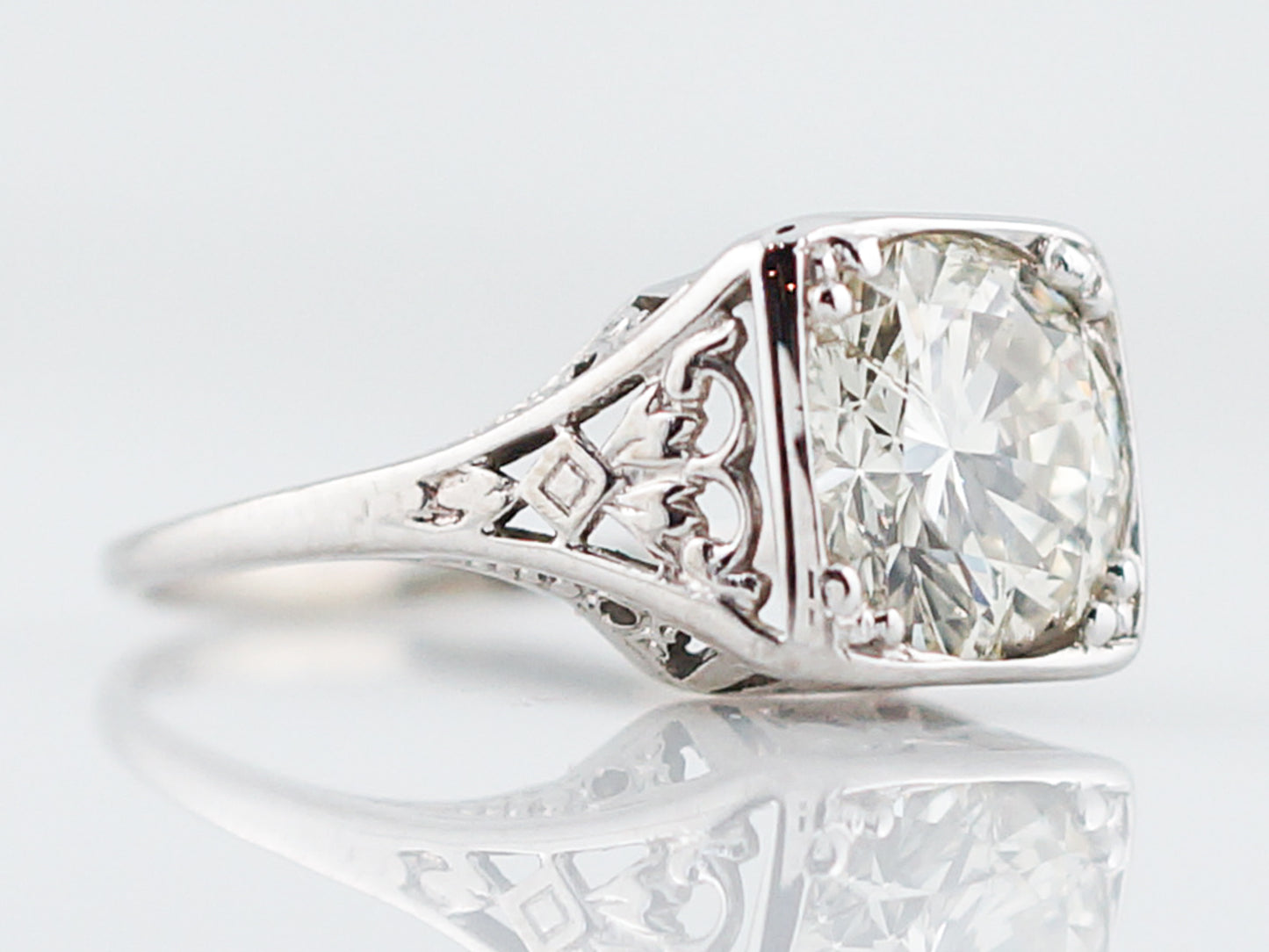 This antique engagement ring was made in the Art Deco era. This ring has a 1.84 carat round brilliant cut diamond as its focal point. The substantial sized diamond is prong set into a square shaped bezel. The 14k white gold setting has beautiful openwork on the shoulders of the ring as well as on the top and bottom so you can see it from every angle. The detailed shoulders taper to a high polish band as it wraps around the finger.