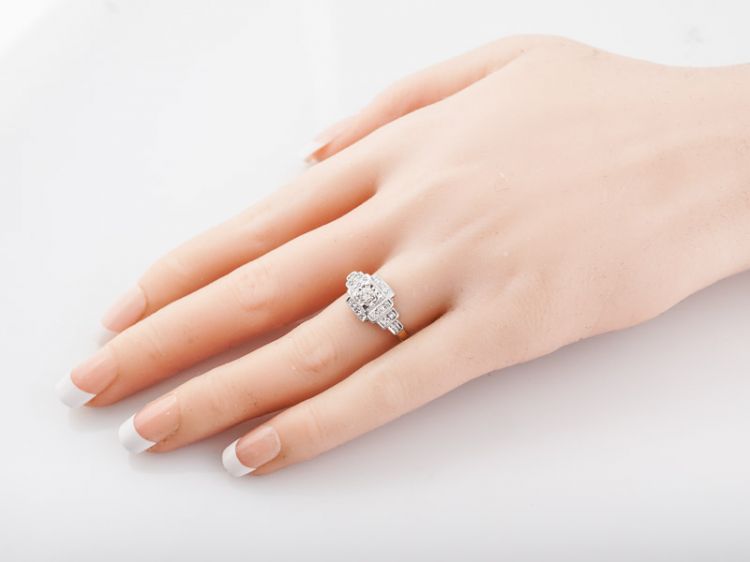 This antique Art Deco setting features a modern round brilliant .16 carat center diamond prong set an illusion basket completed in 14 karat white gold. The center diamond is accented by eighteen (18) round cut diamonds bead set in 14 karat white gold. The side diamonds are finished with decorative square bezels and a milgrain edge. The shank of the ring is finished in 14 karat yellow gold creating a very subtle two-tone ring.