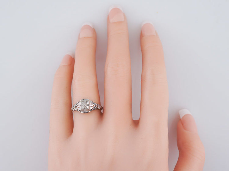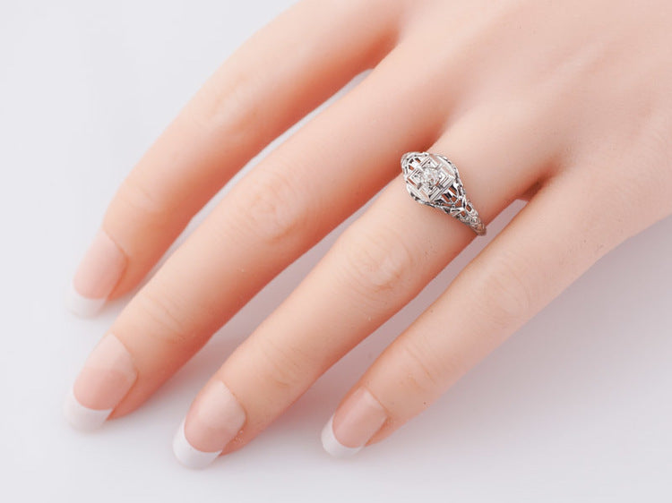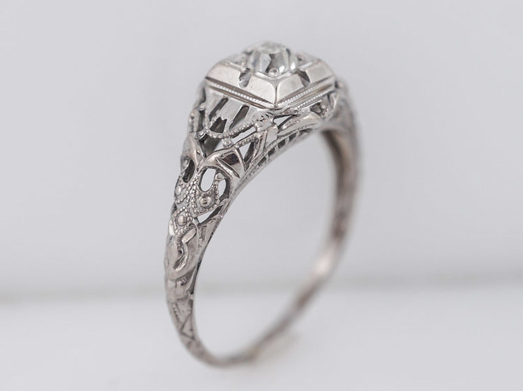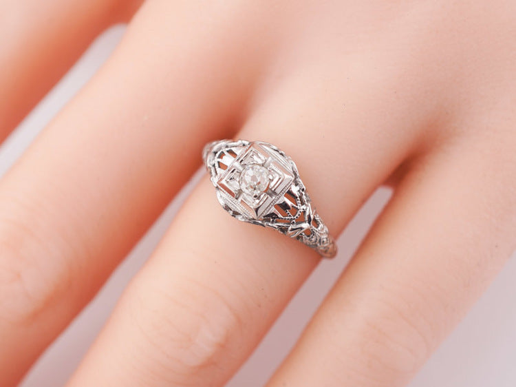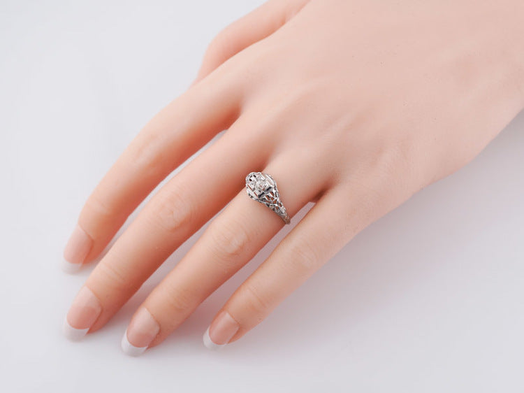 This original antique Art Deco engagement ring features a set .18 carat old European cut diamond. The center stone is prong set, however it is set low in a square carriage creating an almost bezel set appearance. Six (6) single cut accent diamonds add additional sparkle and luster. Gorgeous, open filigree geometric patterns adorn the carriage and shoulders of the ring, while milgrain detailing adds the finishing touch. A marvelous example of Art Deco craftsmanship.
