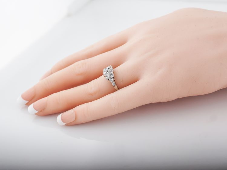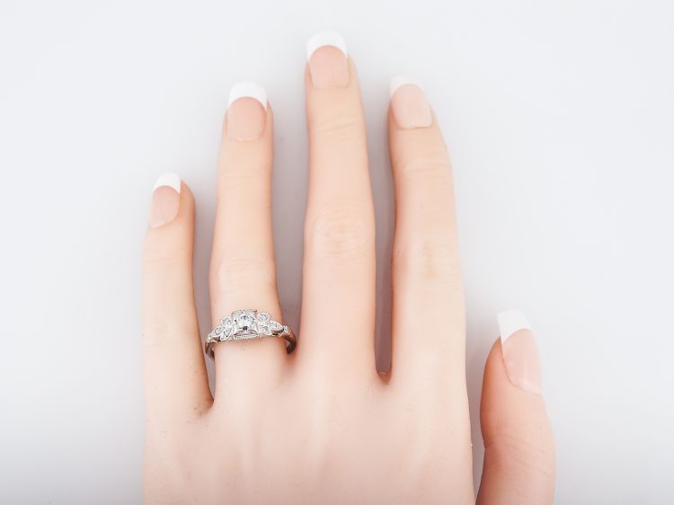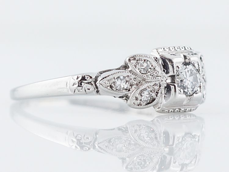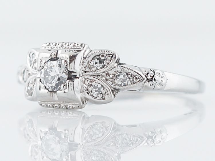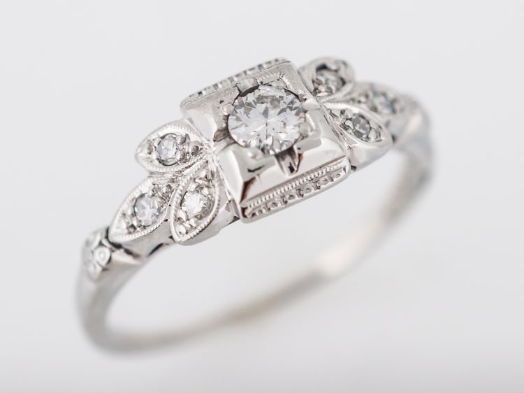 This sweet engagement ring is from the Art Deco era. The center diamond is an Old European cut that weighs .20 carat. The center diamond is set with prongs and is encased in a decorative rectangular outer bezel. It is flanked by three accent diamonds on each side. The accent diamonds are bead set into marquise shaped stations that look like flower petals. The accent diamonds are also edged in milgrain detail. The floral motif is repeated on the shoulders of the band. This engagement ring is made with 18k white gold.