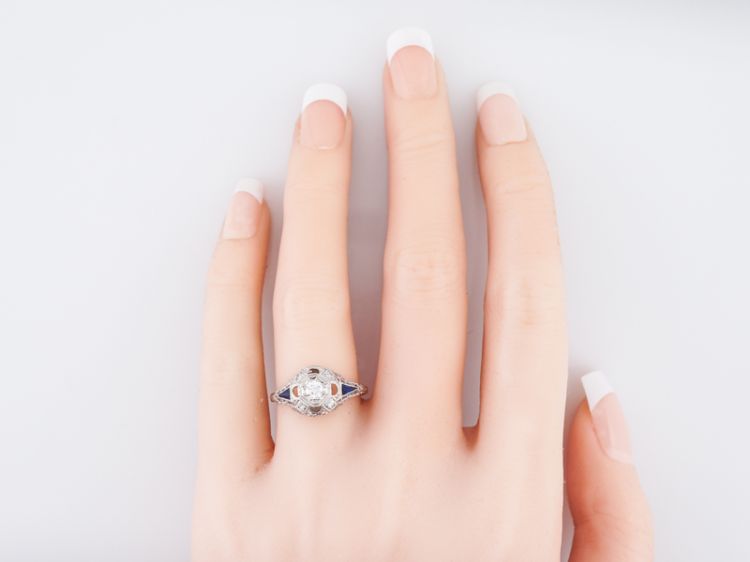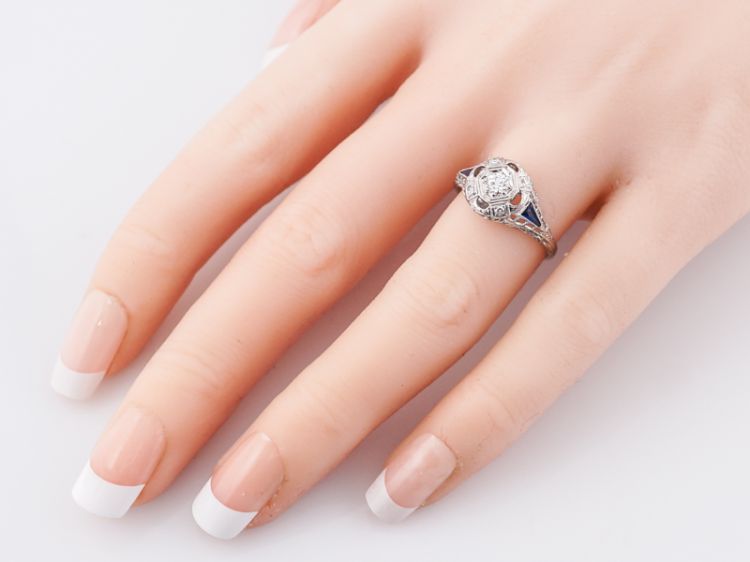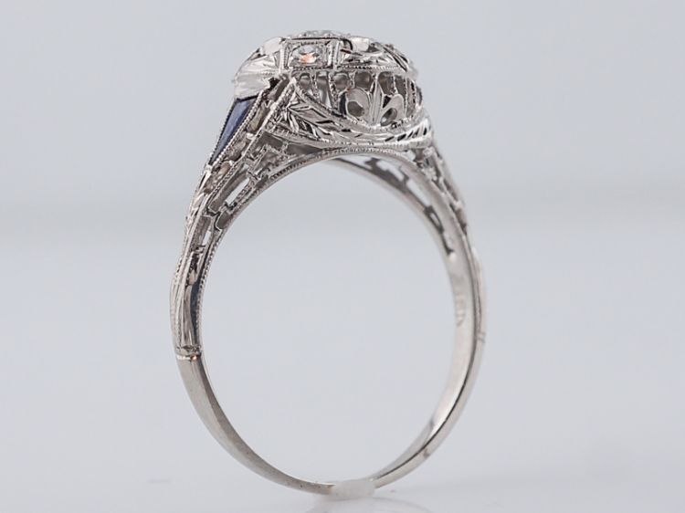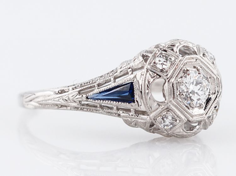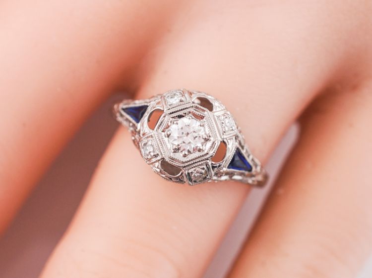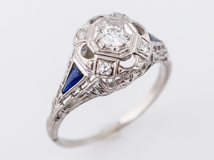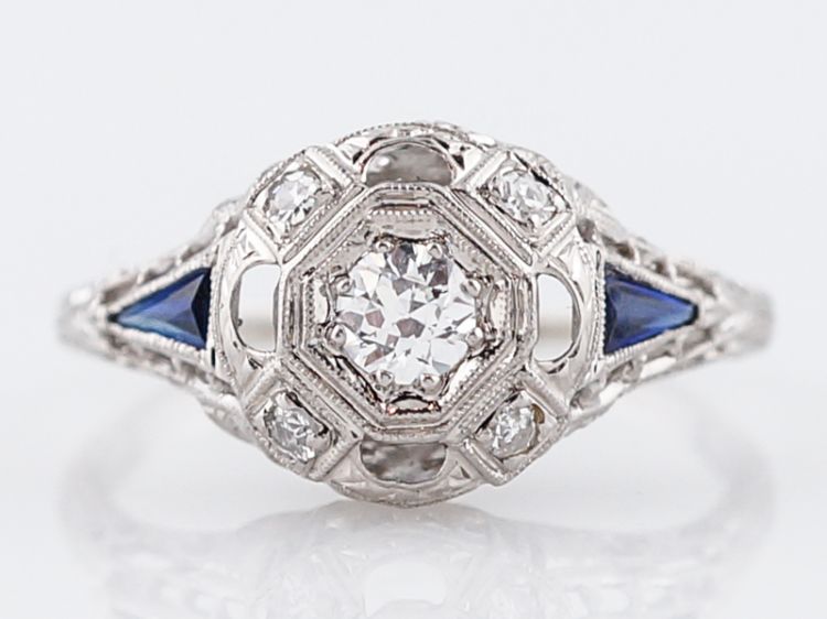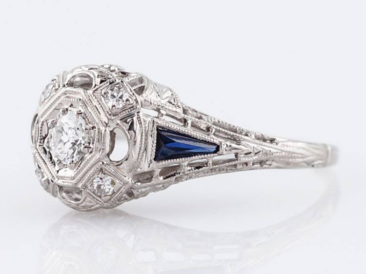 This beautiful Art Deco engagement ring is finished in brightly polished 18k white gold. The .20 carat transitional cut center diamond is bead set into an octagonal station. Surrounding the center diamond are four smaller stations, each with a bead set single cut diamond, creating an amazing geometric pattern. To each side sits a fiery blue bezel set calibre cut sapphire. The entire mounting is lavishly adorned with fine open filigree scroll-work and milgrain detail. A truly stunning 1920s treasure!