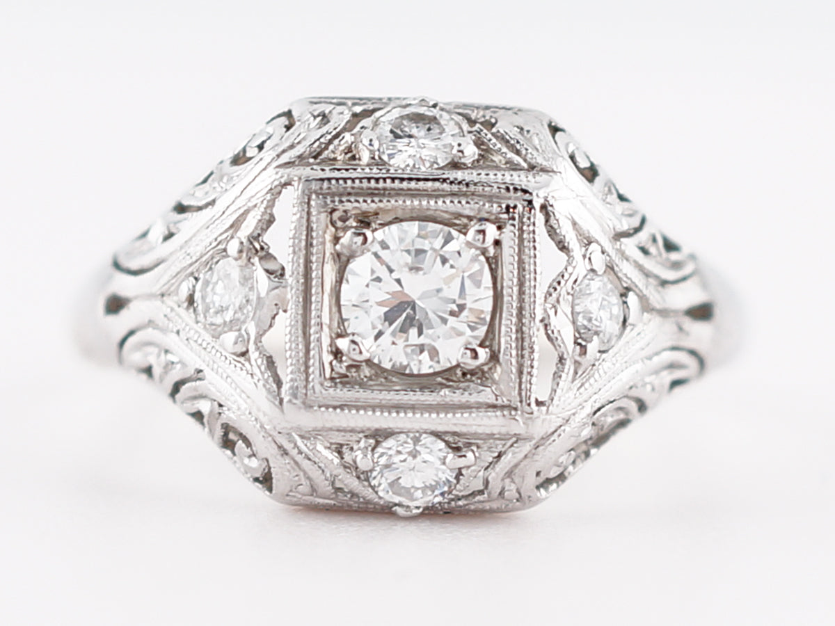 This striking Art Deco engagement ring shows a .30 carat Round Brilliant cut diamond as its primary stone. Finished in both 18k white gold and platinum, the basket setting incorporates beautiful metalwork techniques, including gorgeous filigree and delicate milgrain. This antique engagement ring takes on such a different appearance depending on how you look at it and is captivating from every angle.